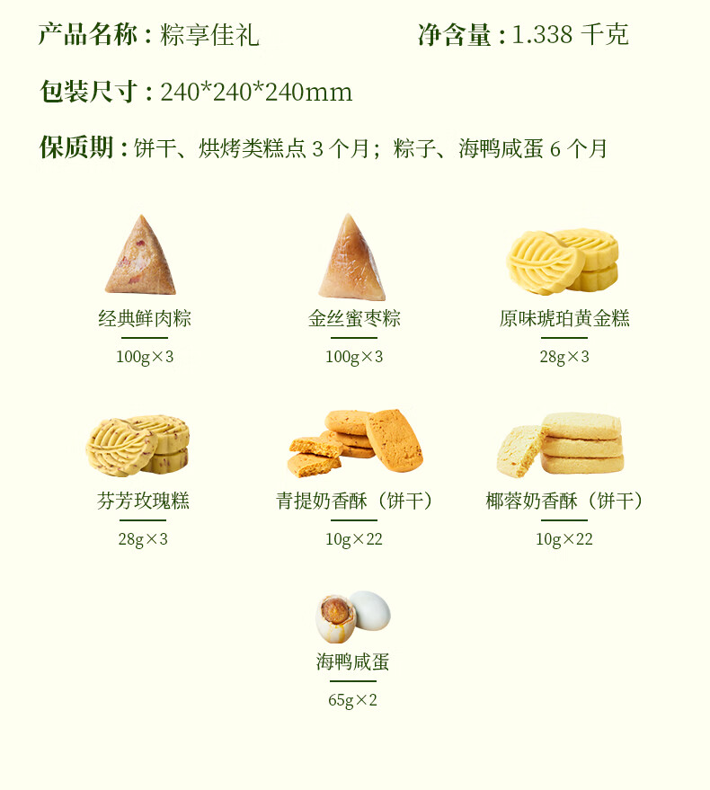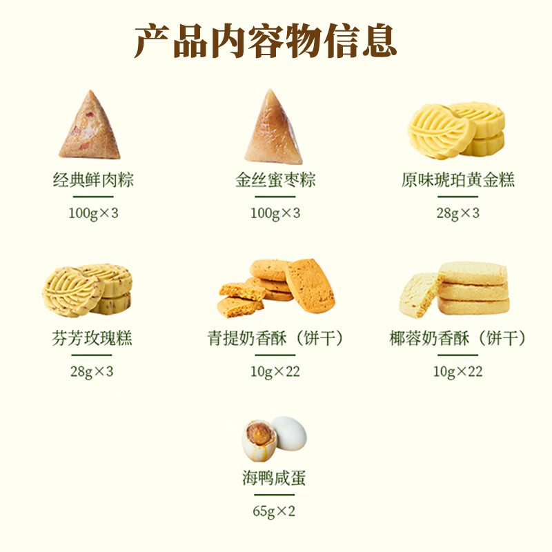 配置:【锦华】经典鲜肉粽 100g*3 【锦华】金丝蜜枣粽 100g*3 【锦华】椰蓉奶香酥(饼干)10g*22 【锦华】青提奶香酥(饼干)10g*22 【锦华】原味琥珀黄金糕 28g*3 【锦华】芬芳玫瑰糕 28g*3 【锦华】海鸭咸蛋 65g*2