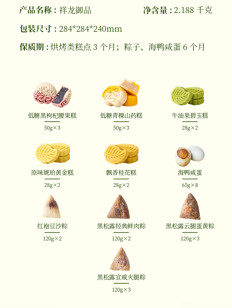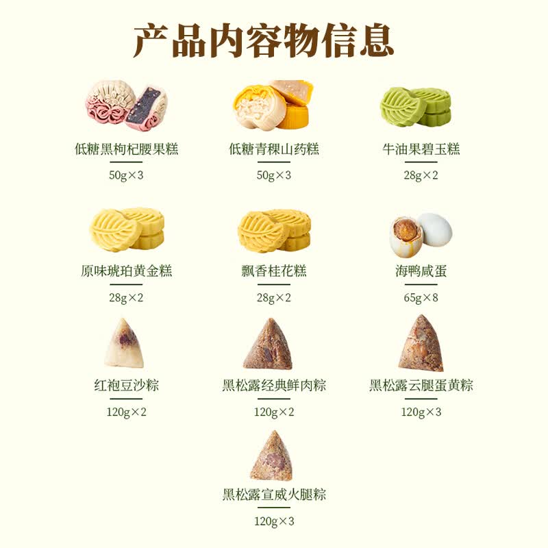 配置:【锦华】低糖黑枸杞腰果糕 50g*3 【锦华】低糖青稞山药糕 50g*3 【锦华】牛油果碧玉糕 28g*2 【锦华】原味琥珀黄金糕 28g*2 【锦华】飘香桂花糕 28g*2 【锦华】海鸭咸蛋 65g*8 【锦华】红袍豆沙粽 120g*2 【锦华】黑松露经典鲜肉粽 120g*2 【锦华】黑松露云腿蛋黄粽 120g*3 【锦华】黑松露宣威火腿粽 120g*3