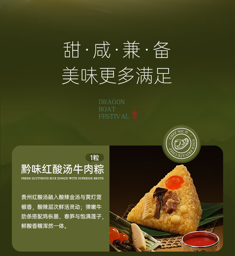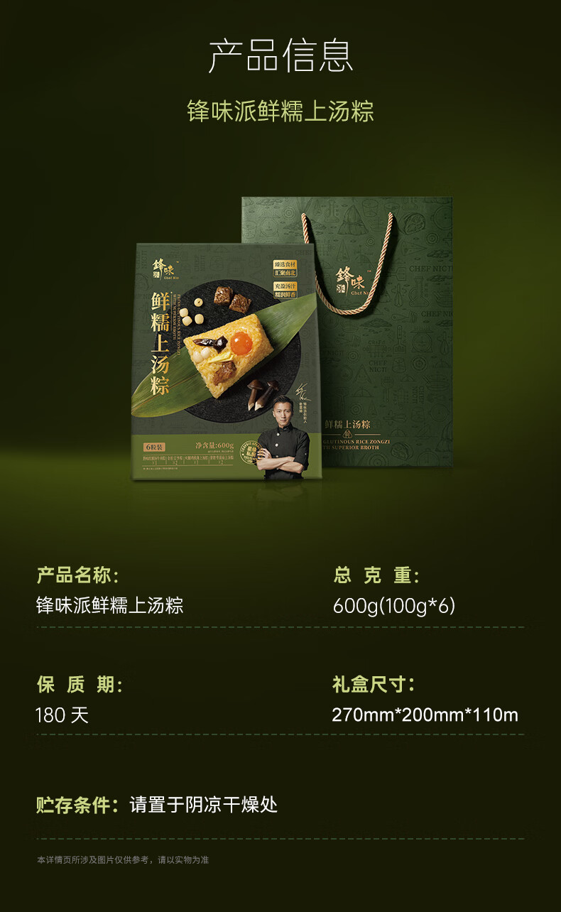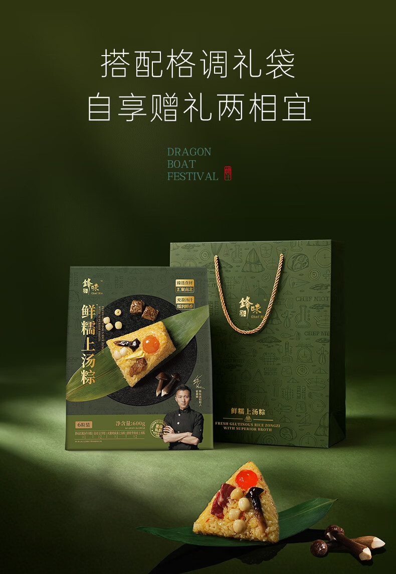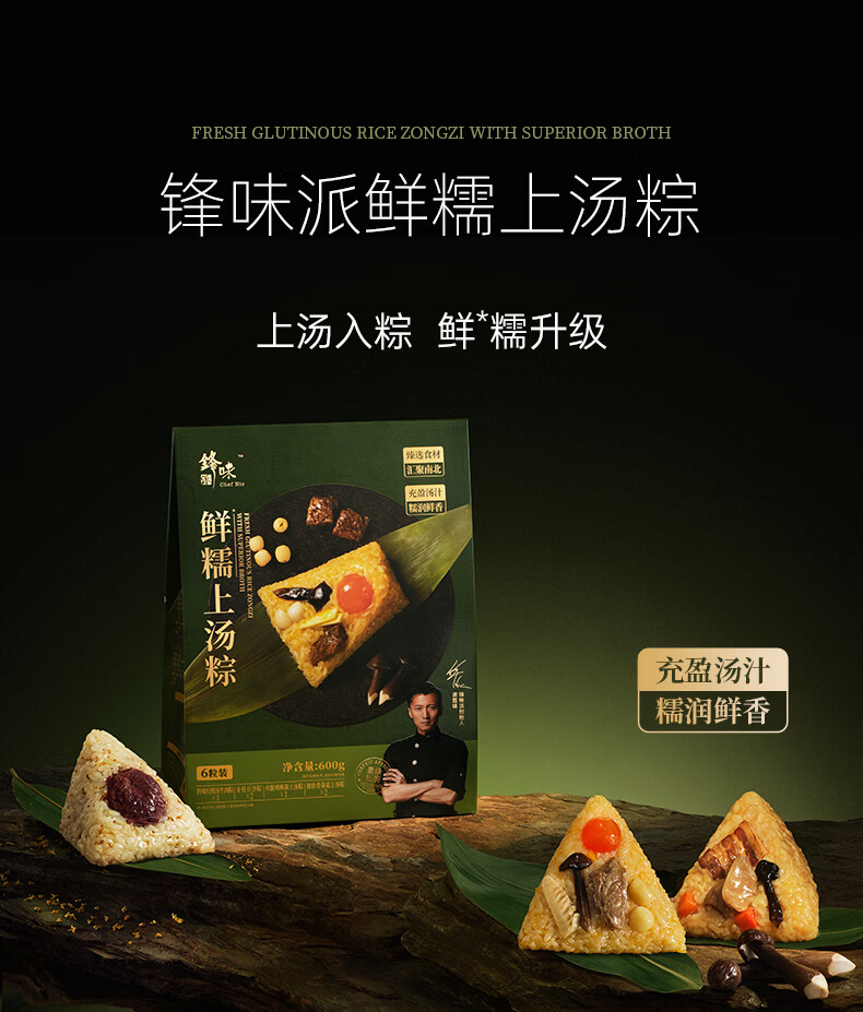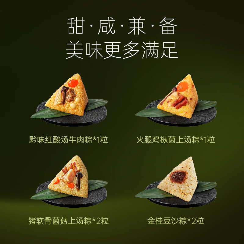 配置:【锋味派】黔味酸汤牛肉粽 100g*1 【锋味派】火腿鸡枞菌上汤粽 100g*1 【锋味派】猪软骨菌菇上汤粽 100g*2 【锋味派】金桂豆沙粽 100g*2