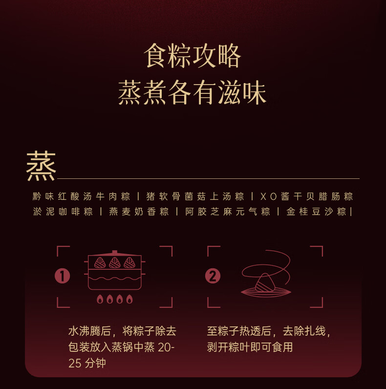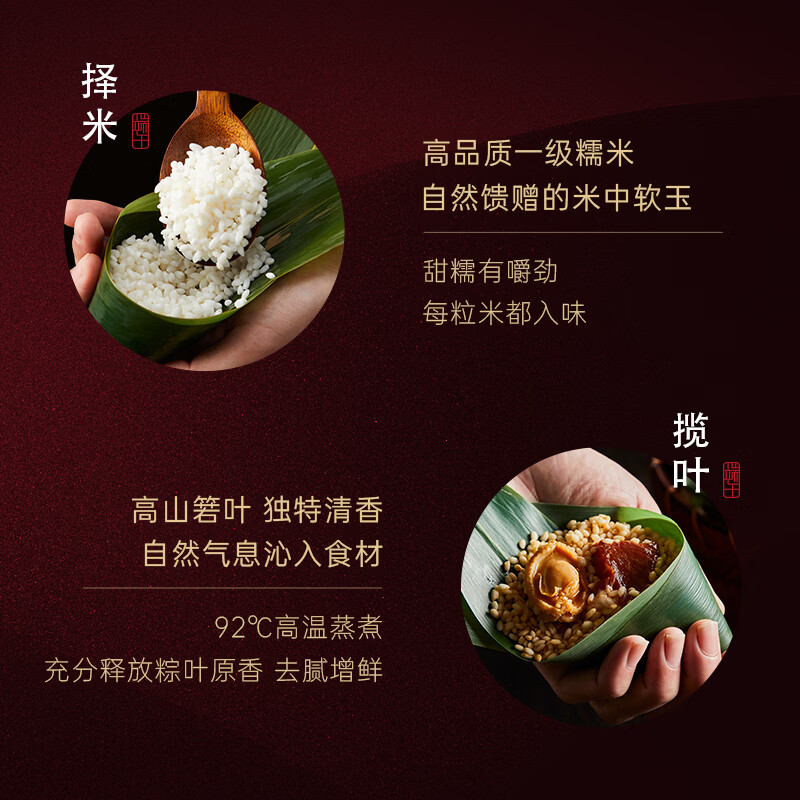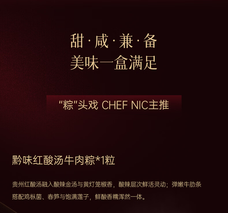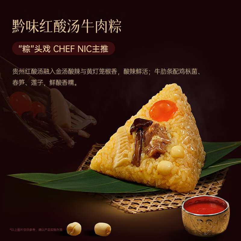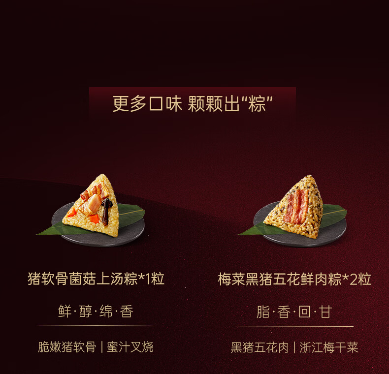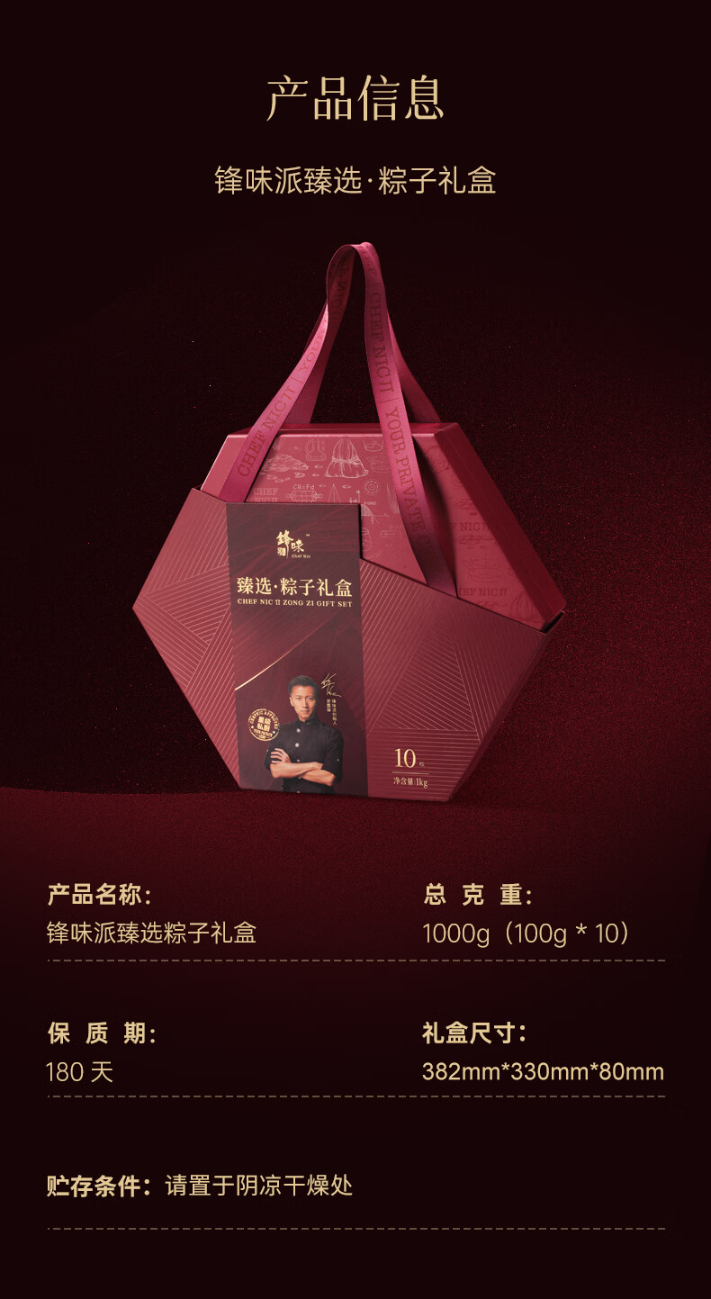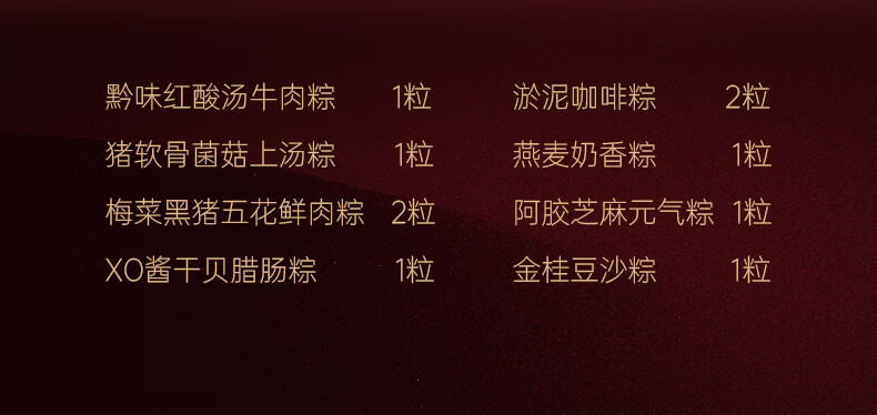 配置:【锋味派】黔味红酸汤牛肉粽 100g*1 【锋味派】猪软骨菌菇上汤粽 100g*1 【锋味派】梅菜黑猪五花鲜肉粽 100g*2 【锋味派】XO酱干贝腊肠粽 100g*1 【锋味派】淤泥咖啡粽 100g*2 【锋味派】燕麦奶香粽 100g*1 【锋味派】阿胶芝麻元气粽 100g*1 【锋味派】金桂豆沙粽 100g*1