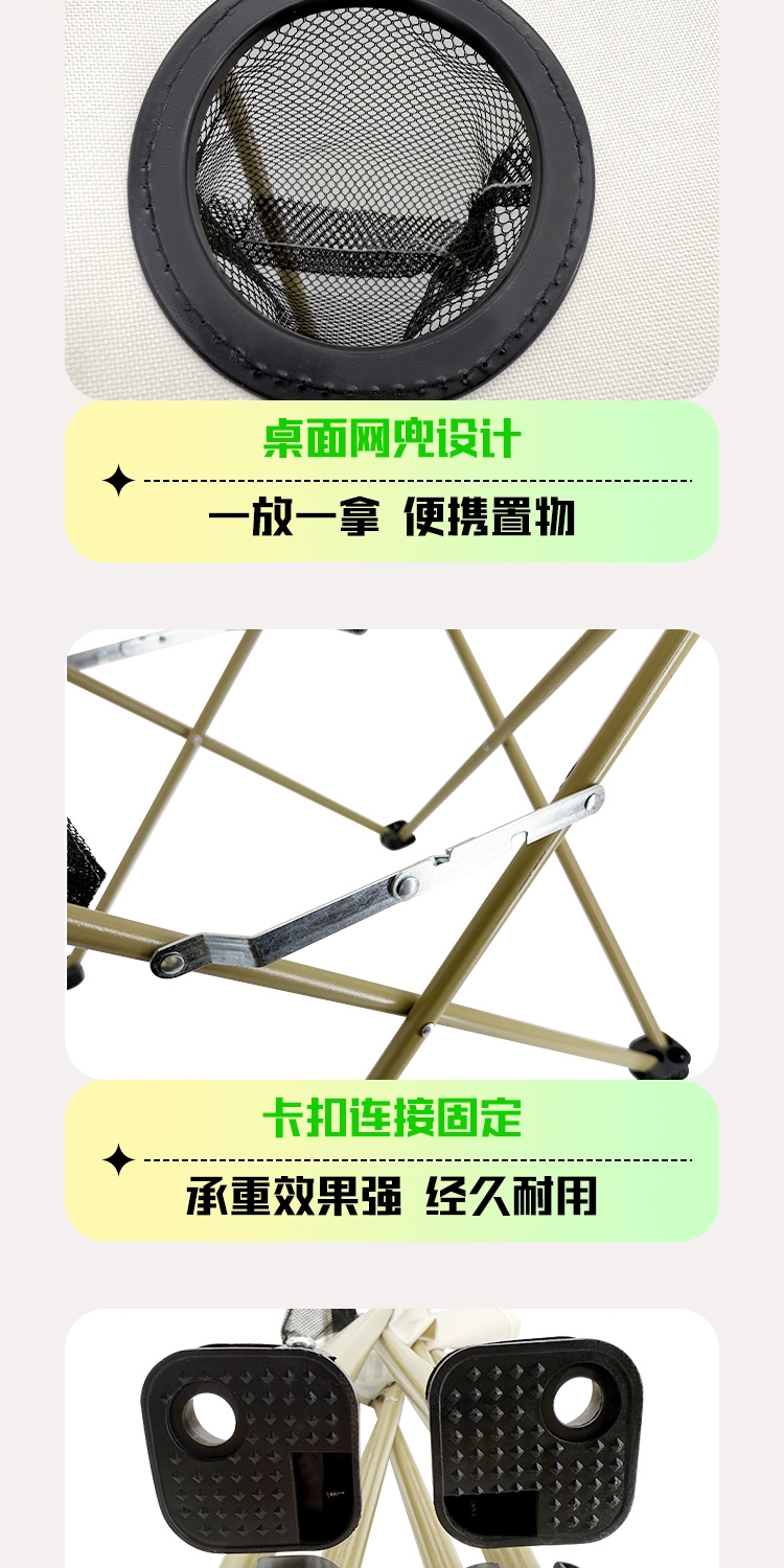 采用加粗x型支架,更稳固安定;坚固多点支撑,结实耐用,携带方便;防刮、耐磨、防泼水,抗撕扯面料,透气防泼溅;加粗加大大地脚,边角加固有效延长使用寿命;便捷置物袋,放置水杯,不易倾倒