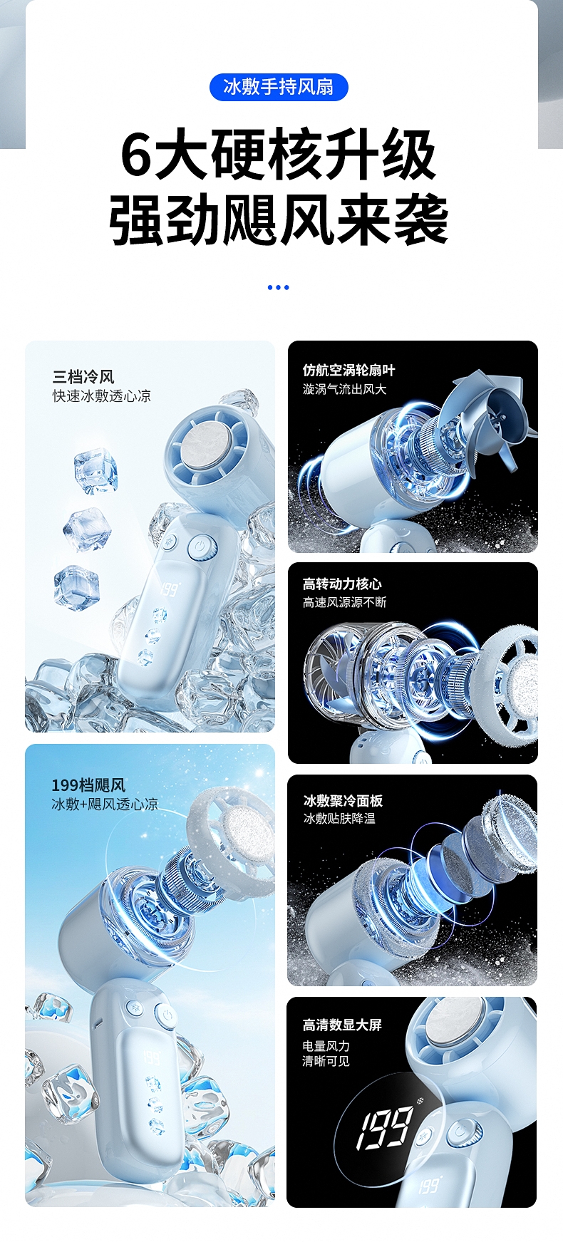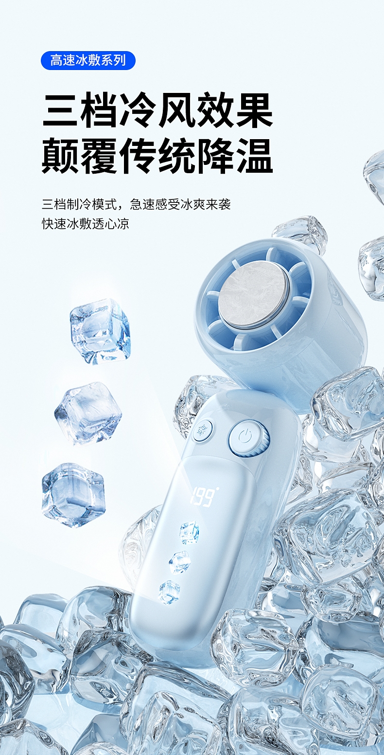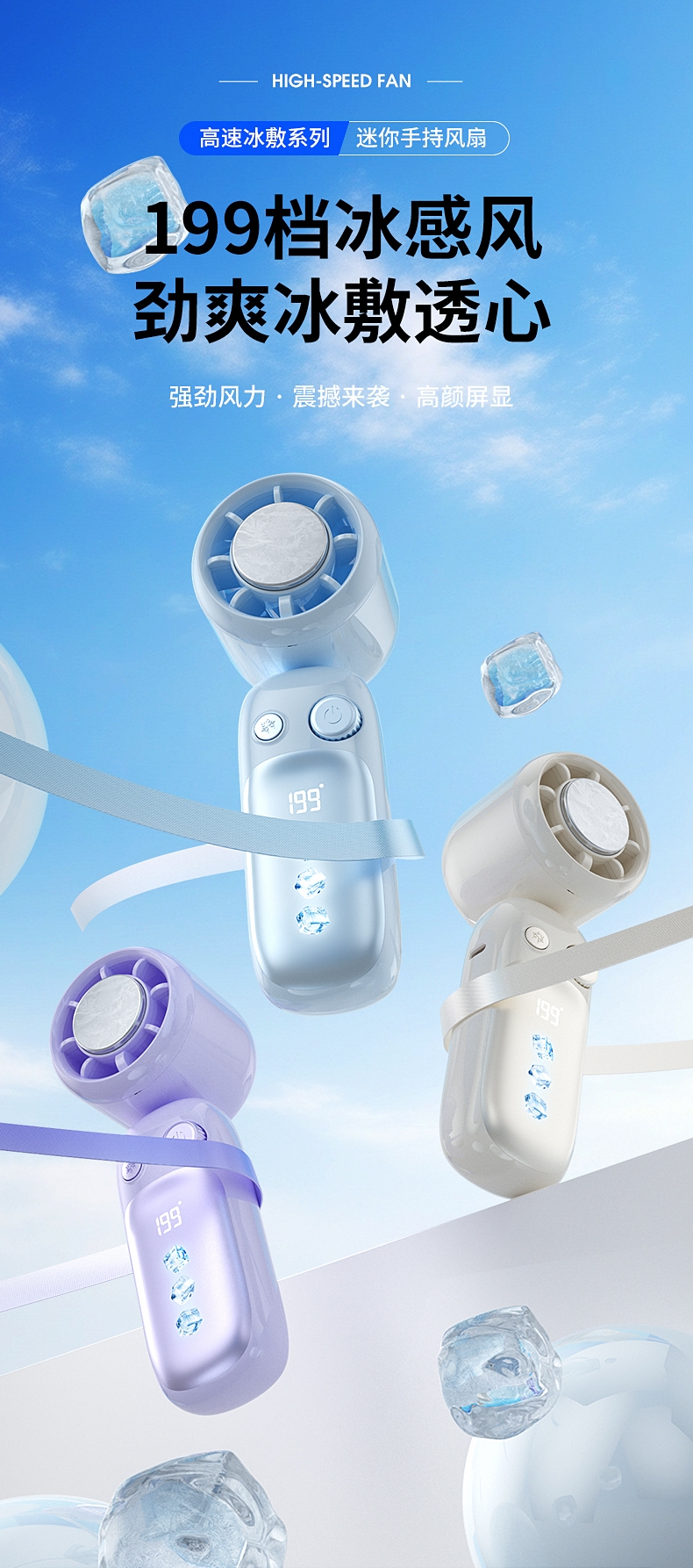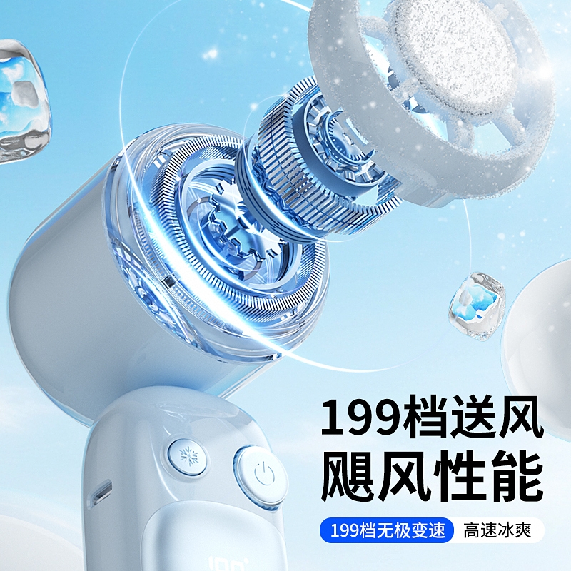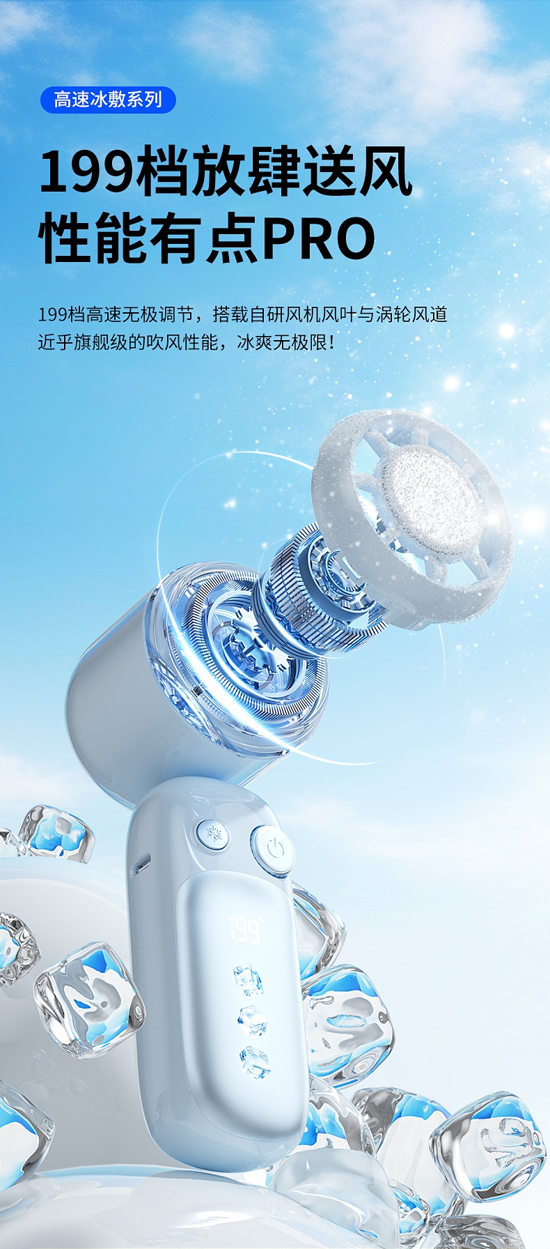 可持可立可挂 桌面手持多场景;三档冰敷制冷模式,快速贴肤降温;199档无极调速,高速扩风电机,大风强动力