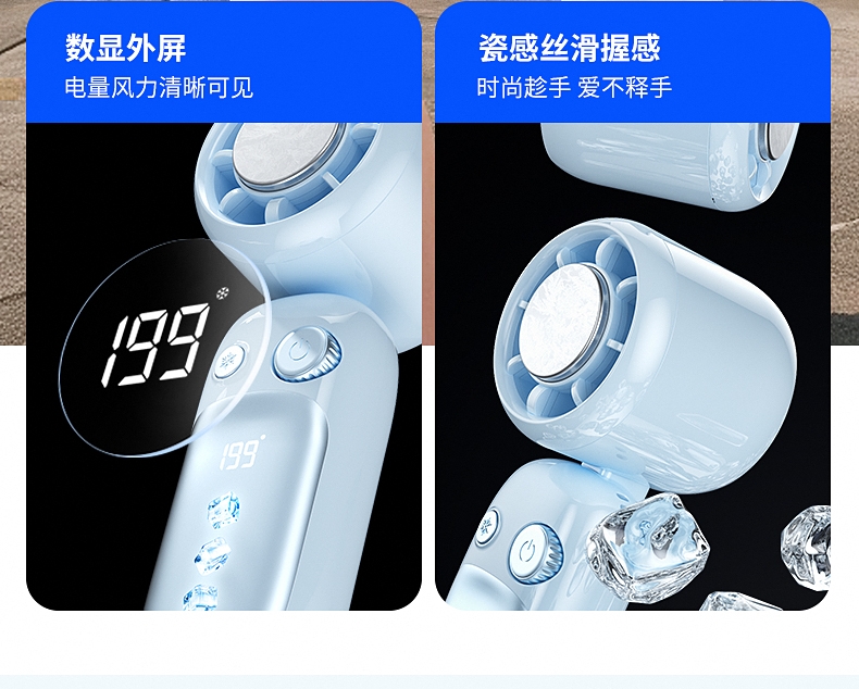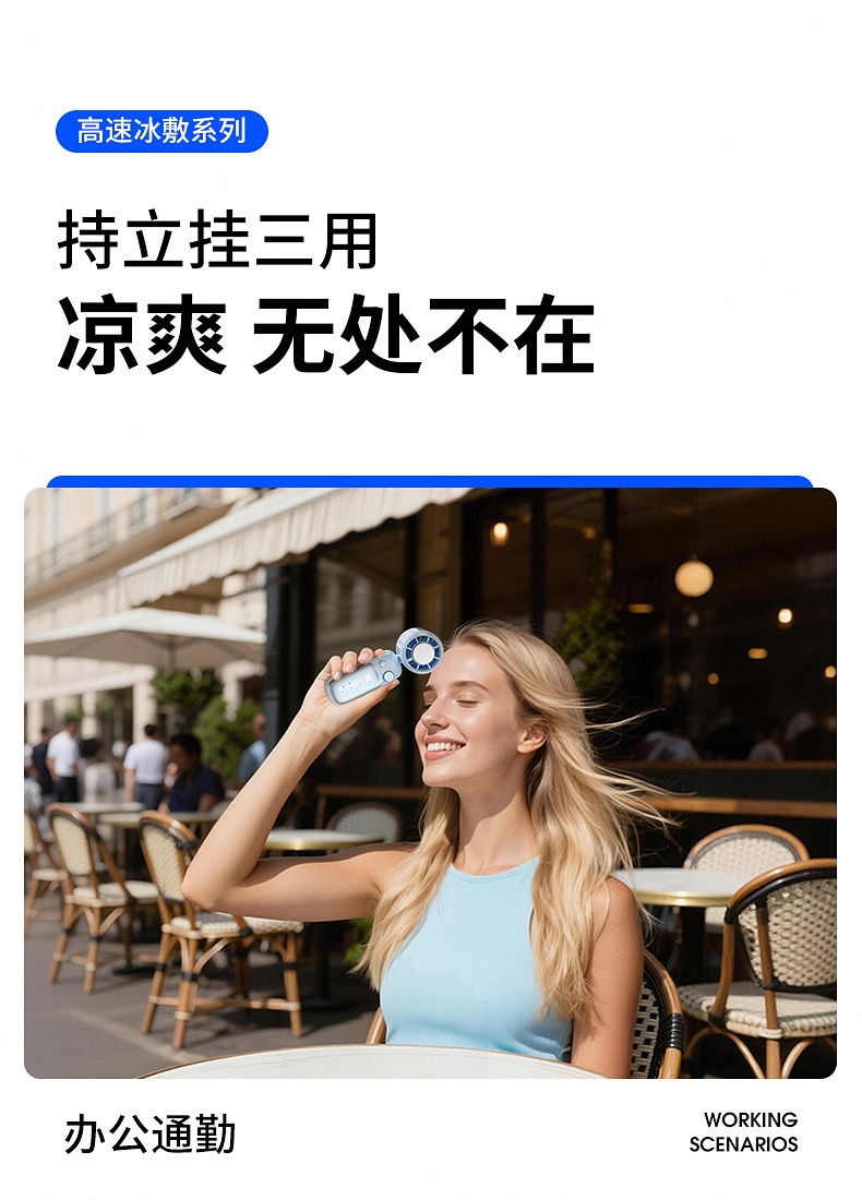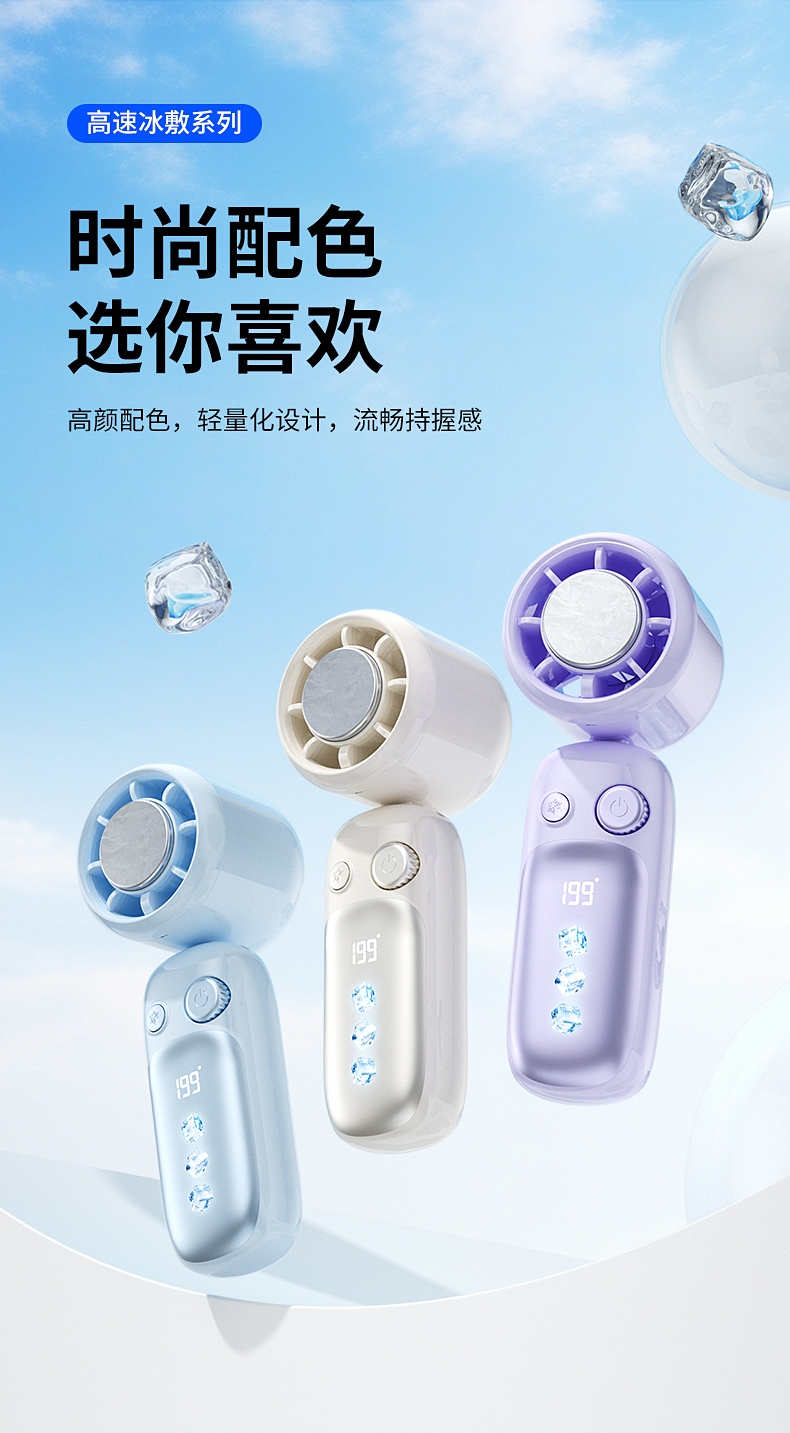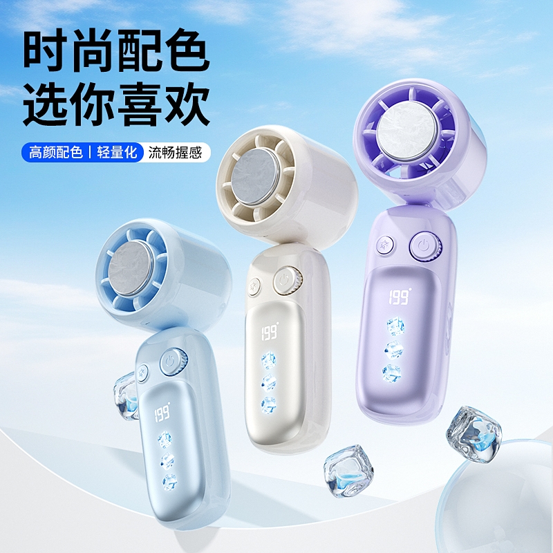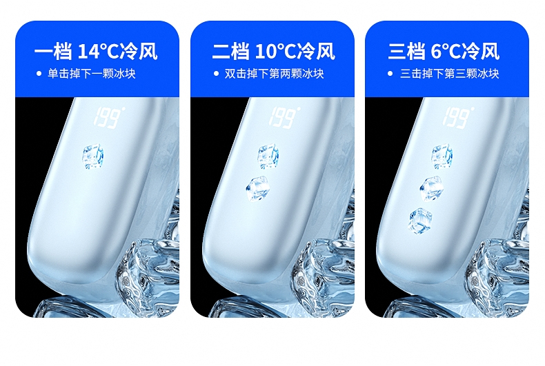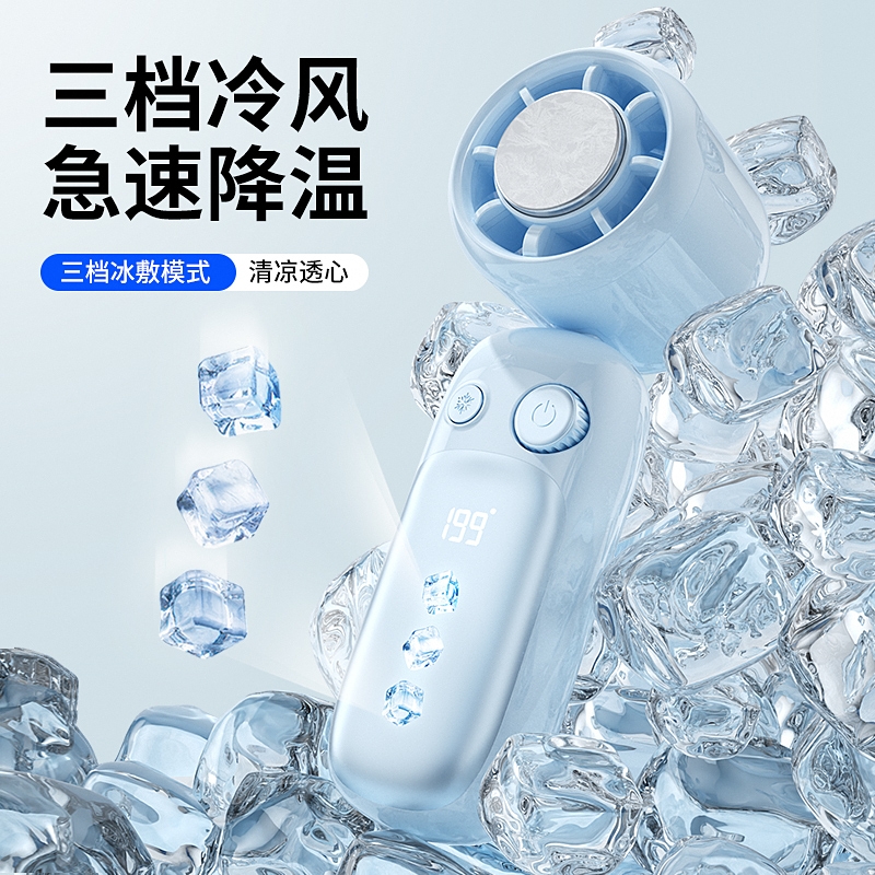 可持可立可挂 桌面手持多场景;三档冰敷制冷模式,快速贴肤降温;199档无极调速,高速扩风电机,大风强动力