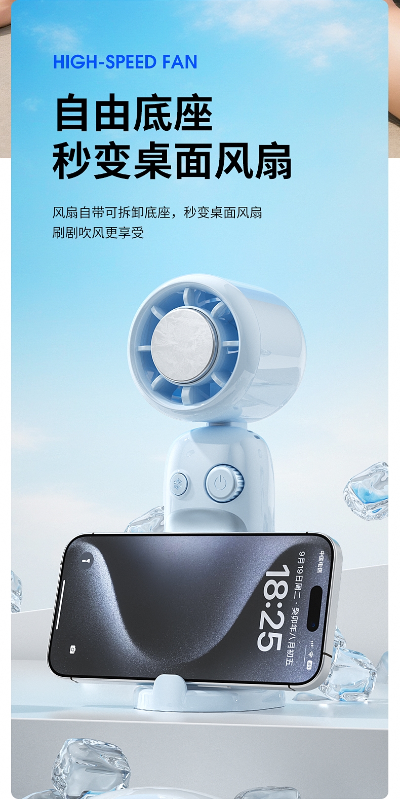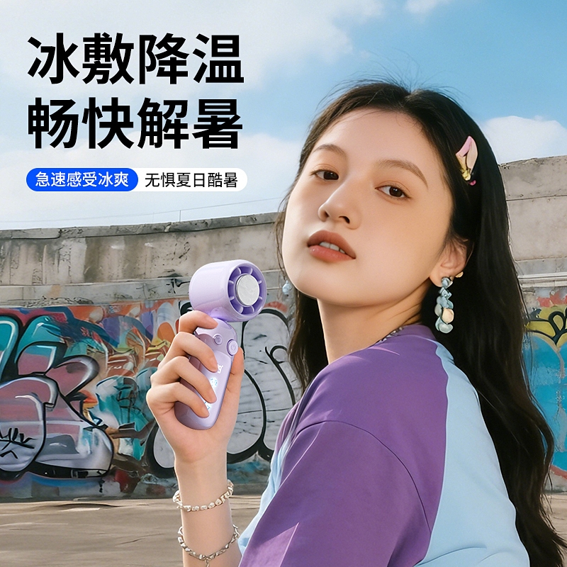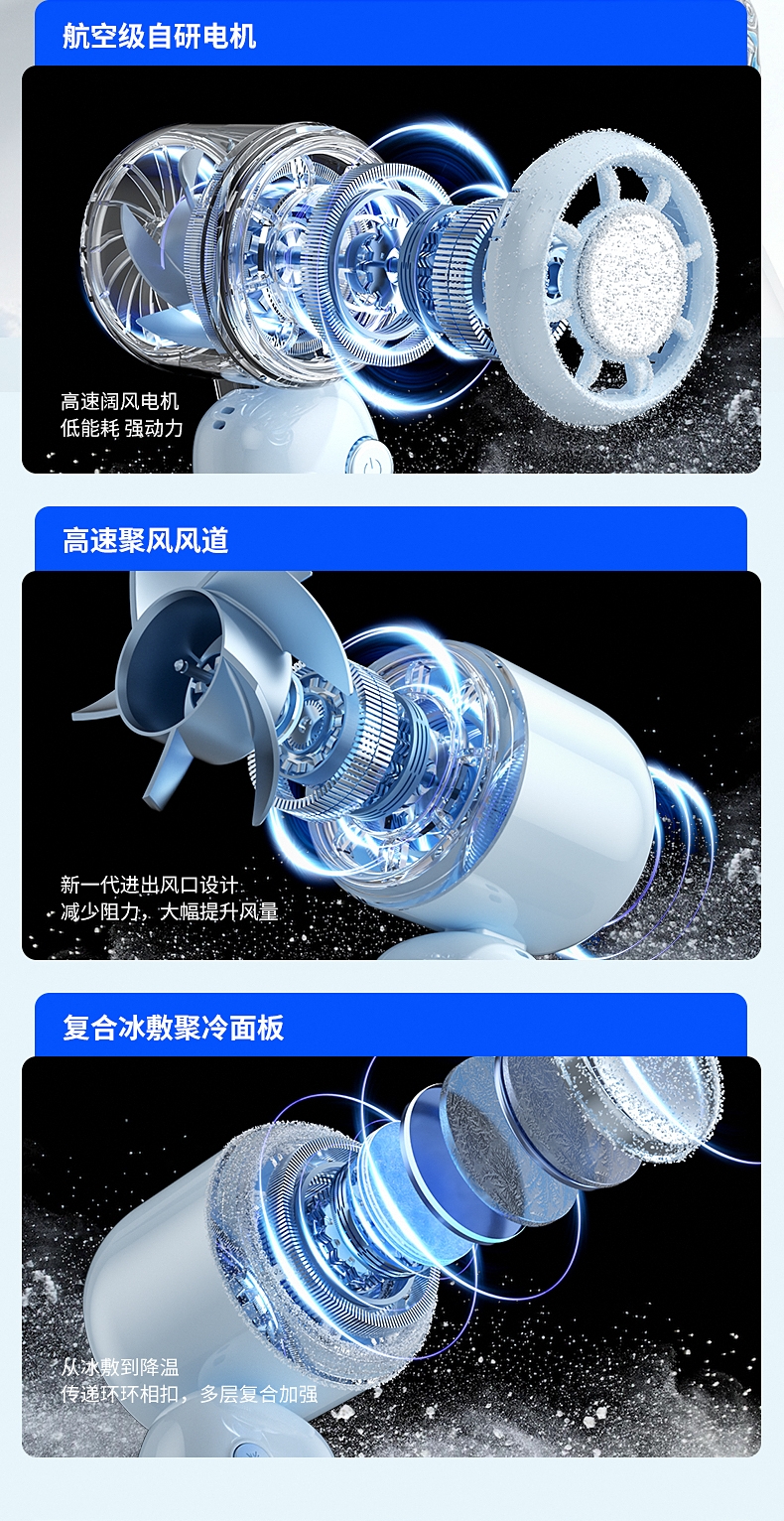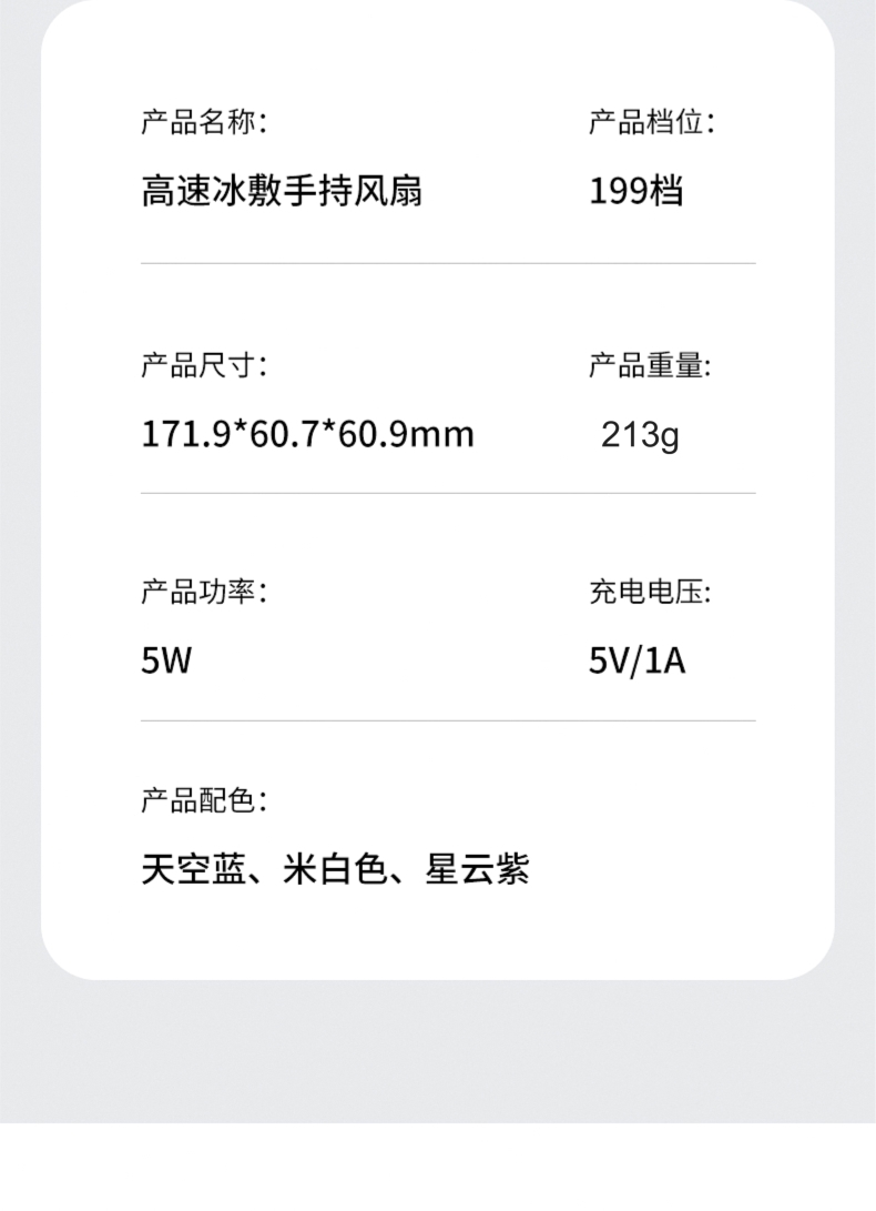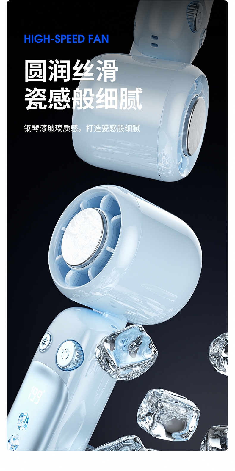 可持可立可挂 桌面手持多场景;三档冰敷制冷模式,快速贴肤降温;199档无极调速,高速扩风电机,大风强动力