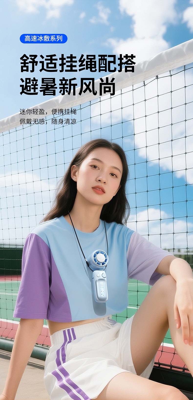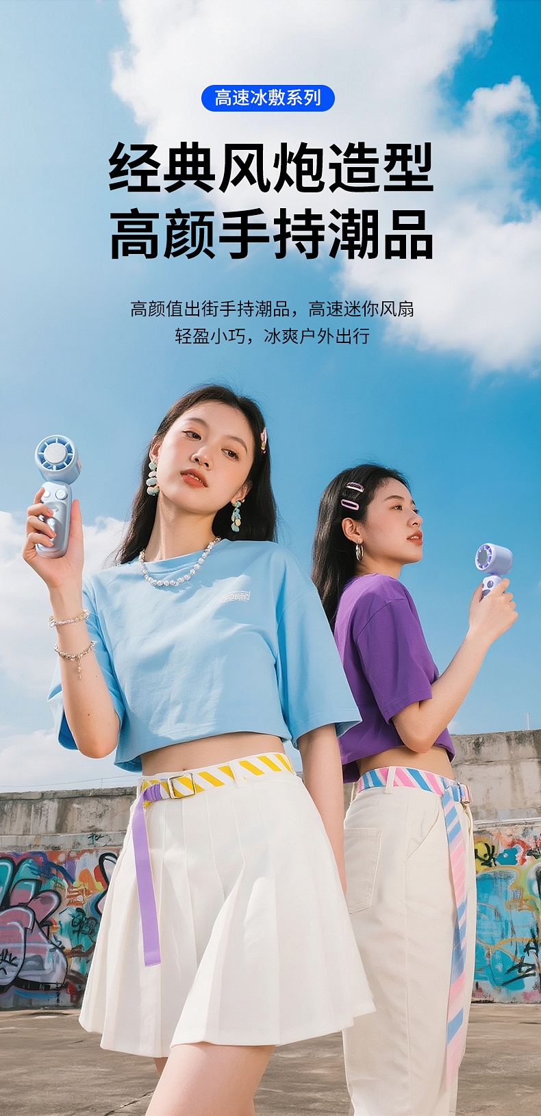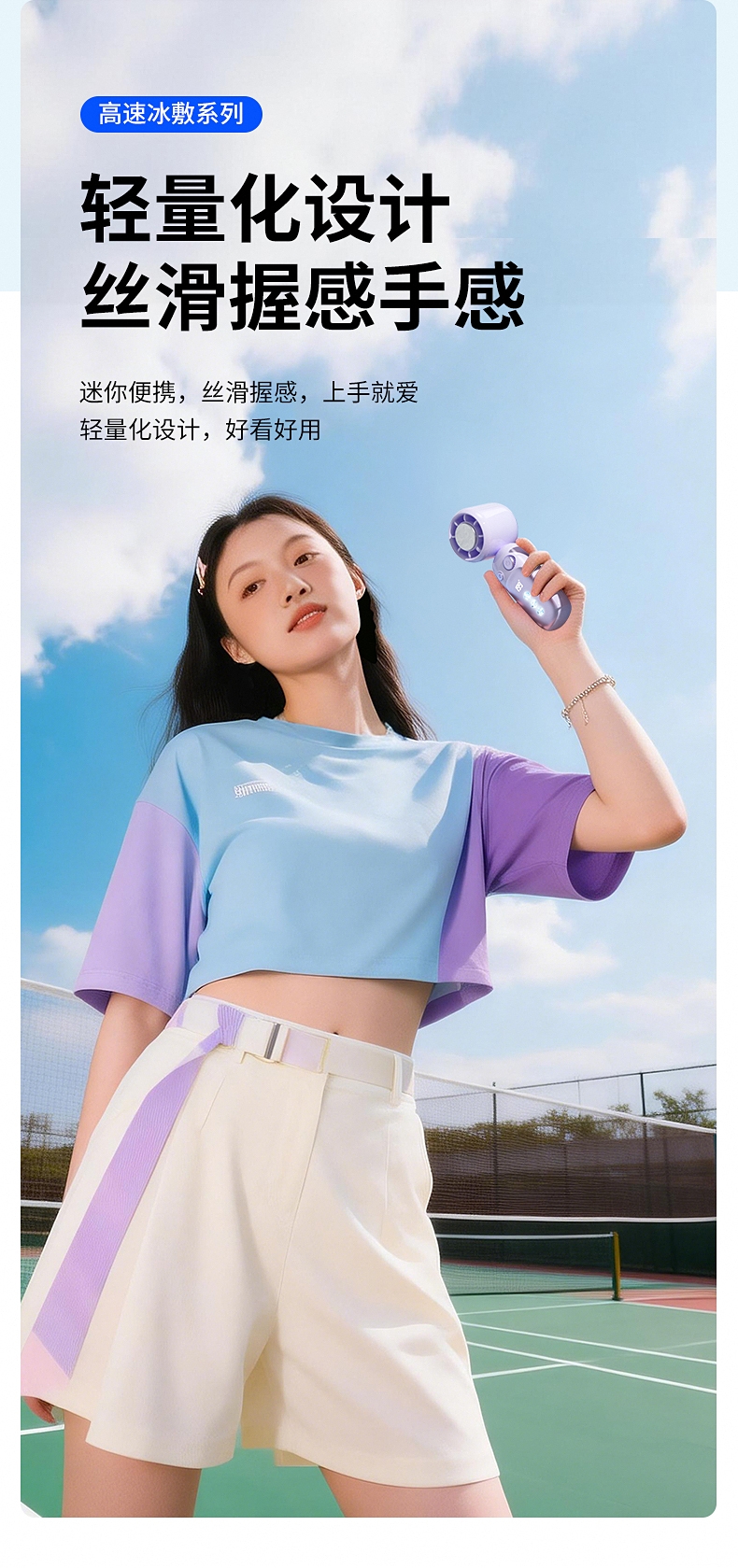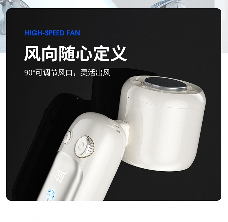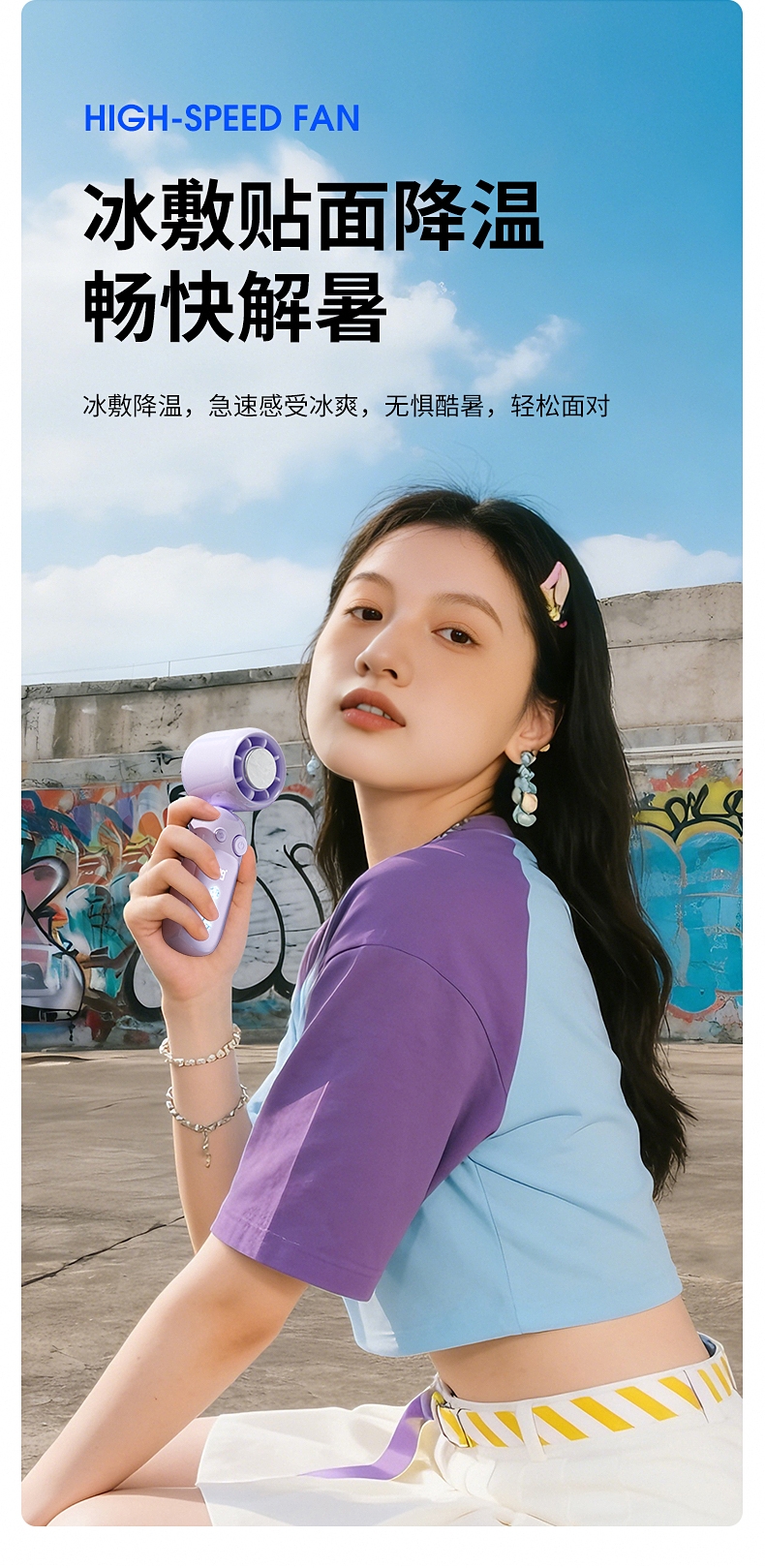 可持可立可挂 桌面手持多场景;三档冰敷制冷模式,快速贴肤降温;199档无极调速,高速扩风电机,大风强动力