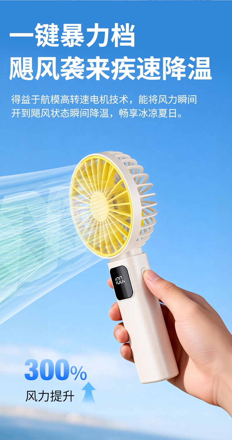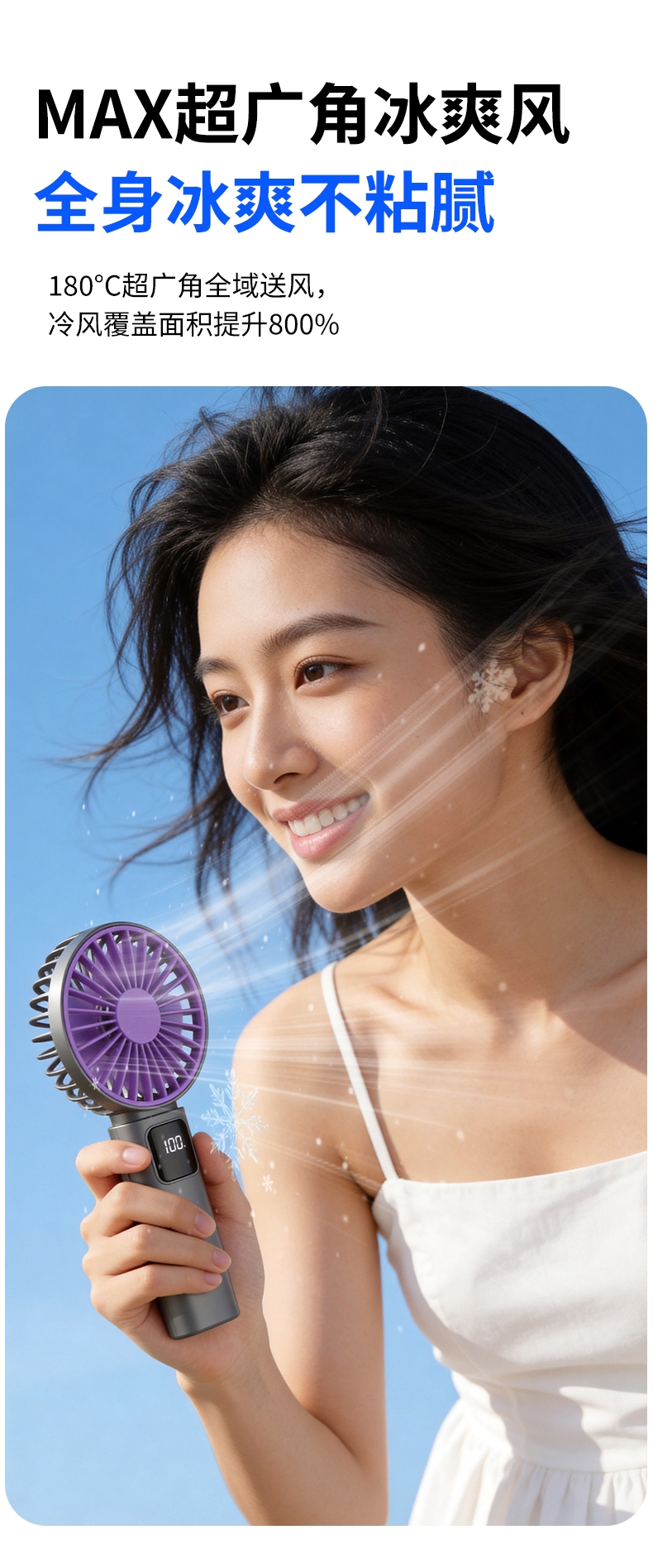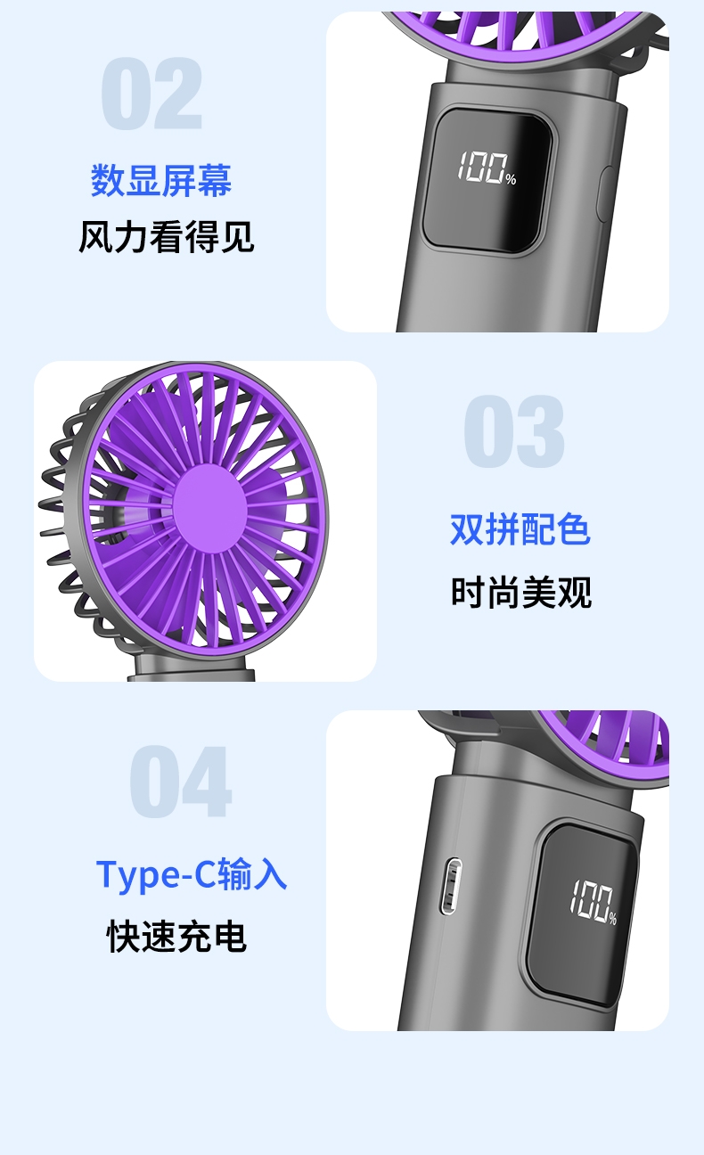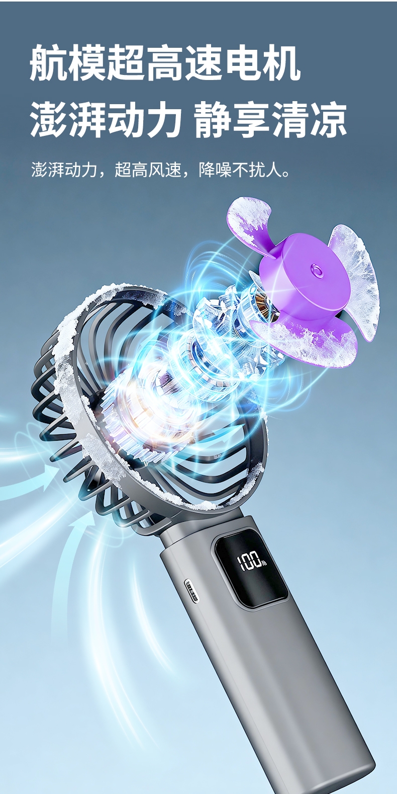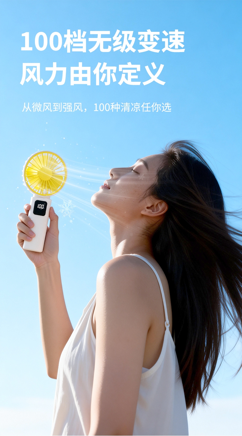 LED实时显示 风速直观感受;100档无极风力调节,风力由你定义;大容量电芯,超长续航