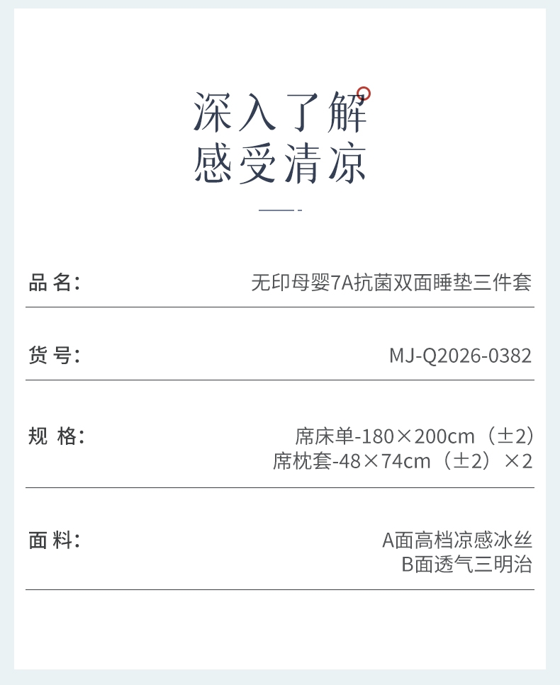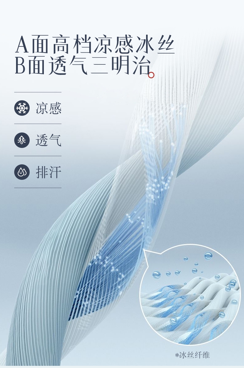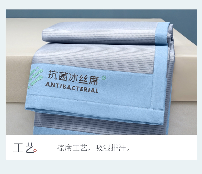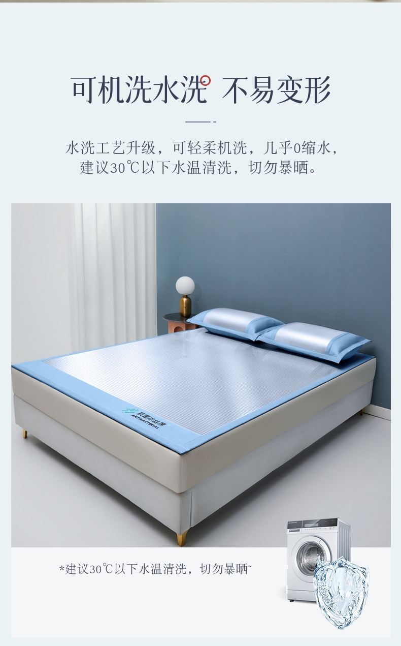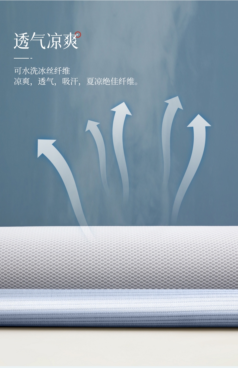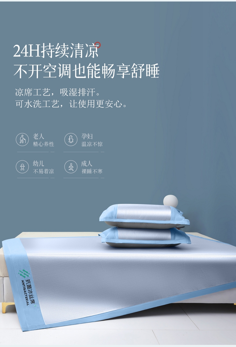 可水洗冰丝纤维---凉爽,透气,吸汗,夏凉绝佳纤维;凉席工艺,吸湿排汗。可水洗工艺,让使用更安心。;透气三明治,母婴呵护,清新夏日夜