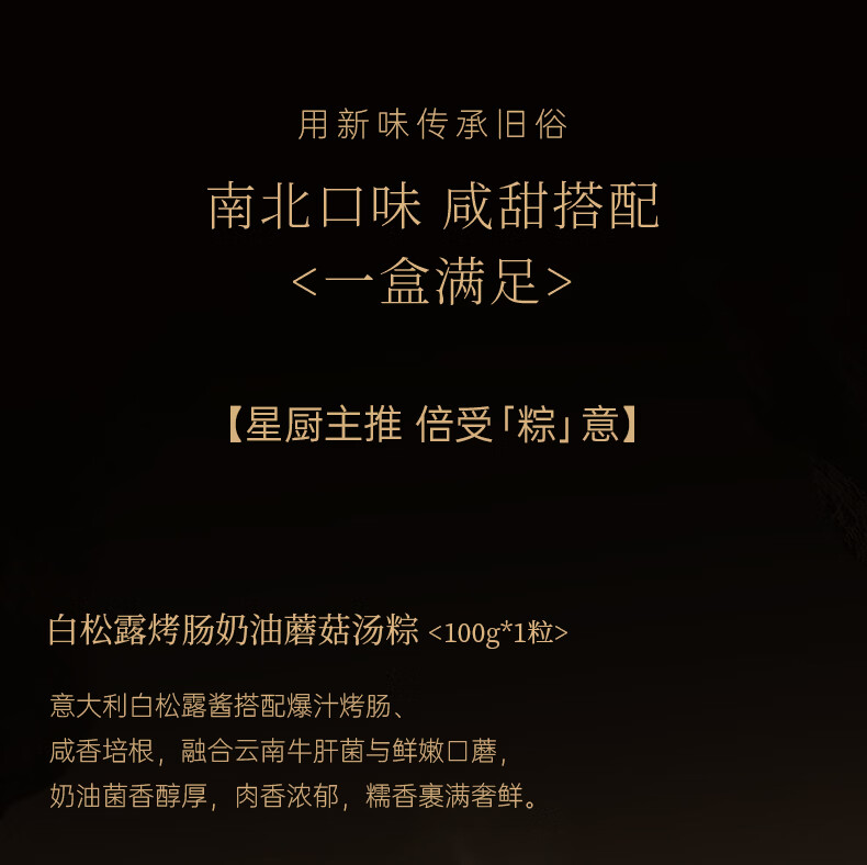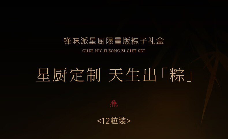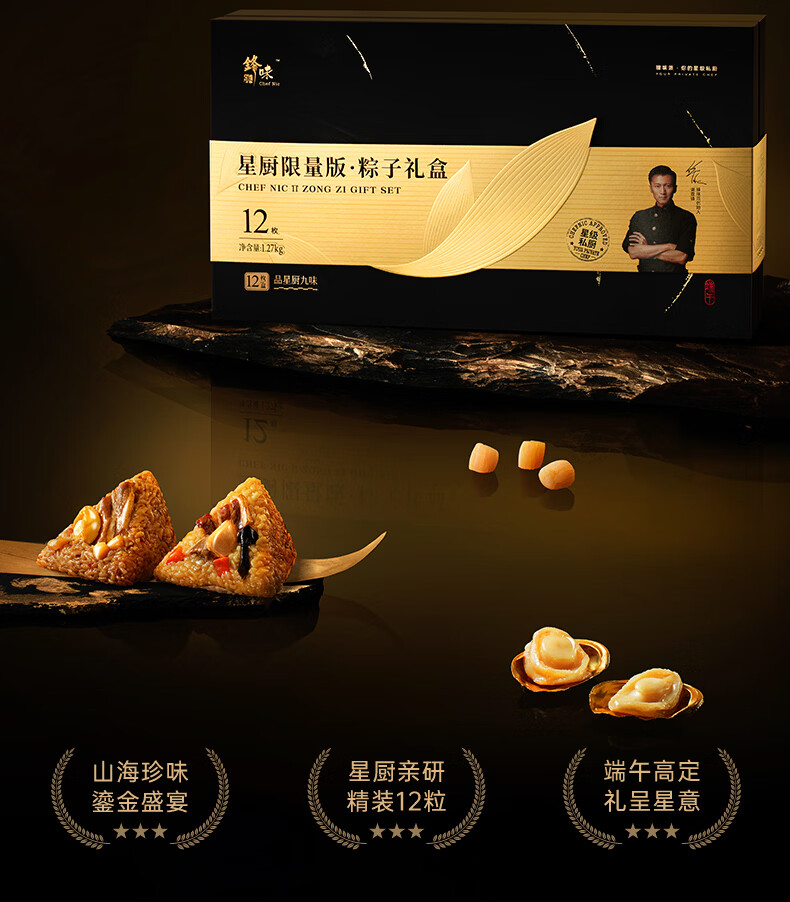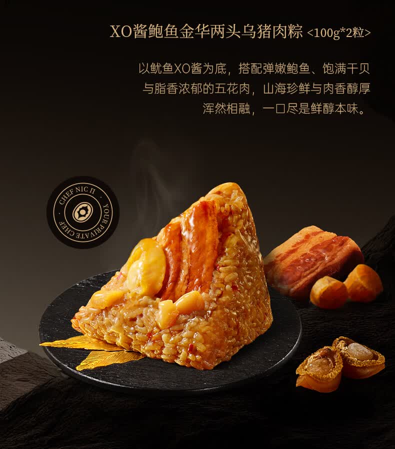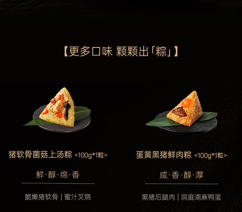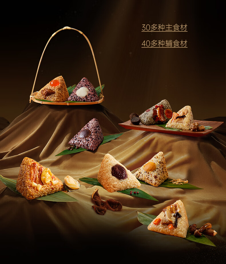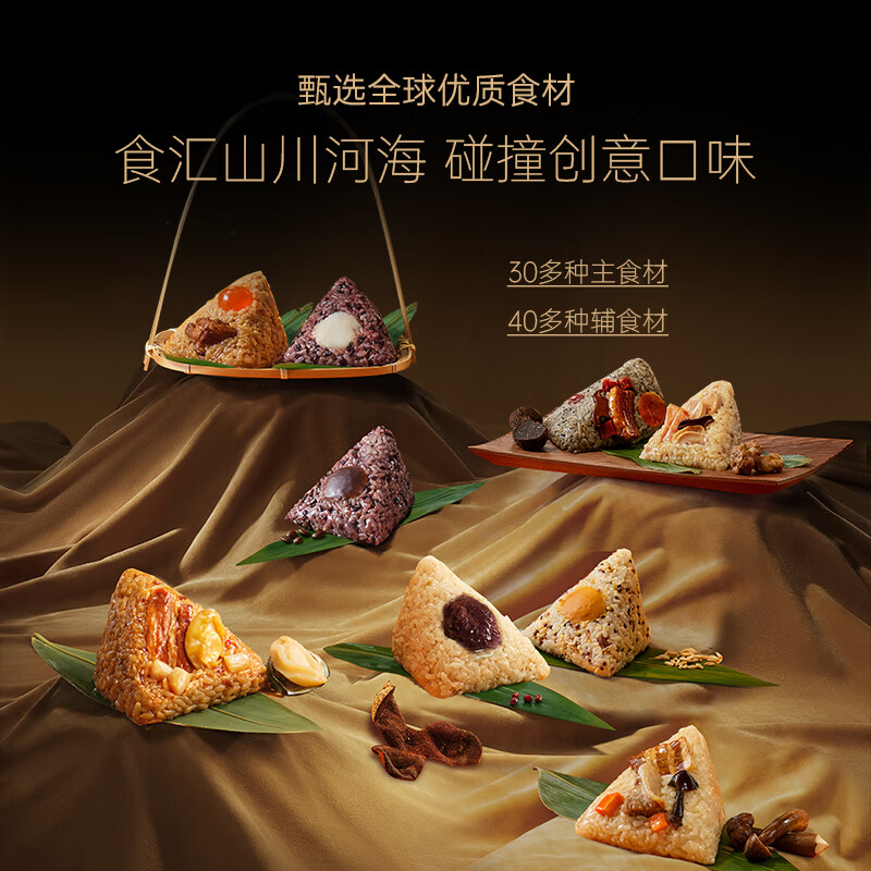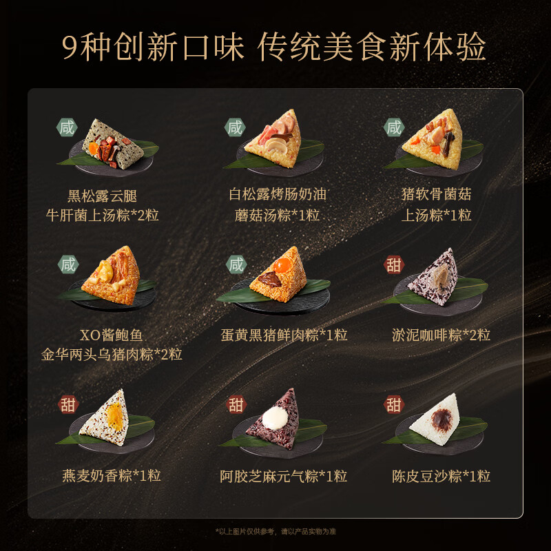配置:【锋味派】XO酱鲍鱼金华两头乌猪肉粽 100g*2 【锋味派】黑松露云腿牛肝菌上汤粽 135g*2 【锋味派】白松露烤肠奶油蘑菇汤粽 100g*1 【锋味派】猪软骨菌菇上汤粽 100g*1 【锋味派】蛋黄黑猪鲜肉粽 100g*1 【锋味派】淤泥咖啡粽 100g*2 【锋味派】燕麦奶香粽 100g*1 【锋味派】阿胶芝麻元气粽 100g*1 【锋味派】陈皮豆沙粽 100g*1