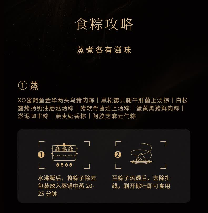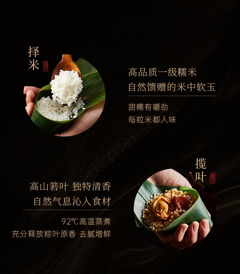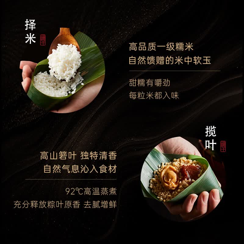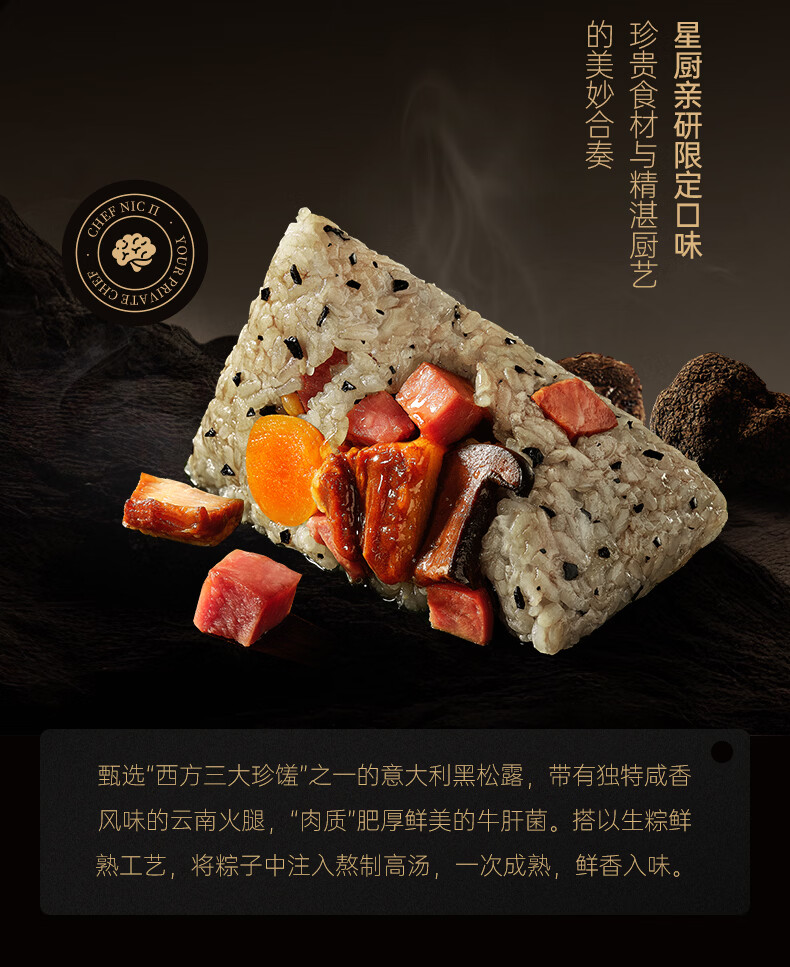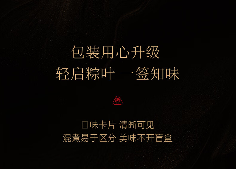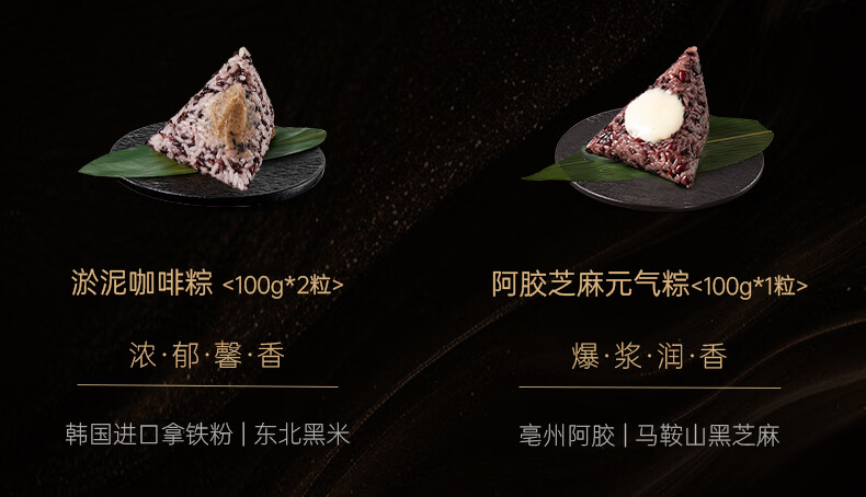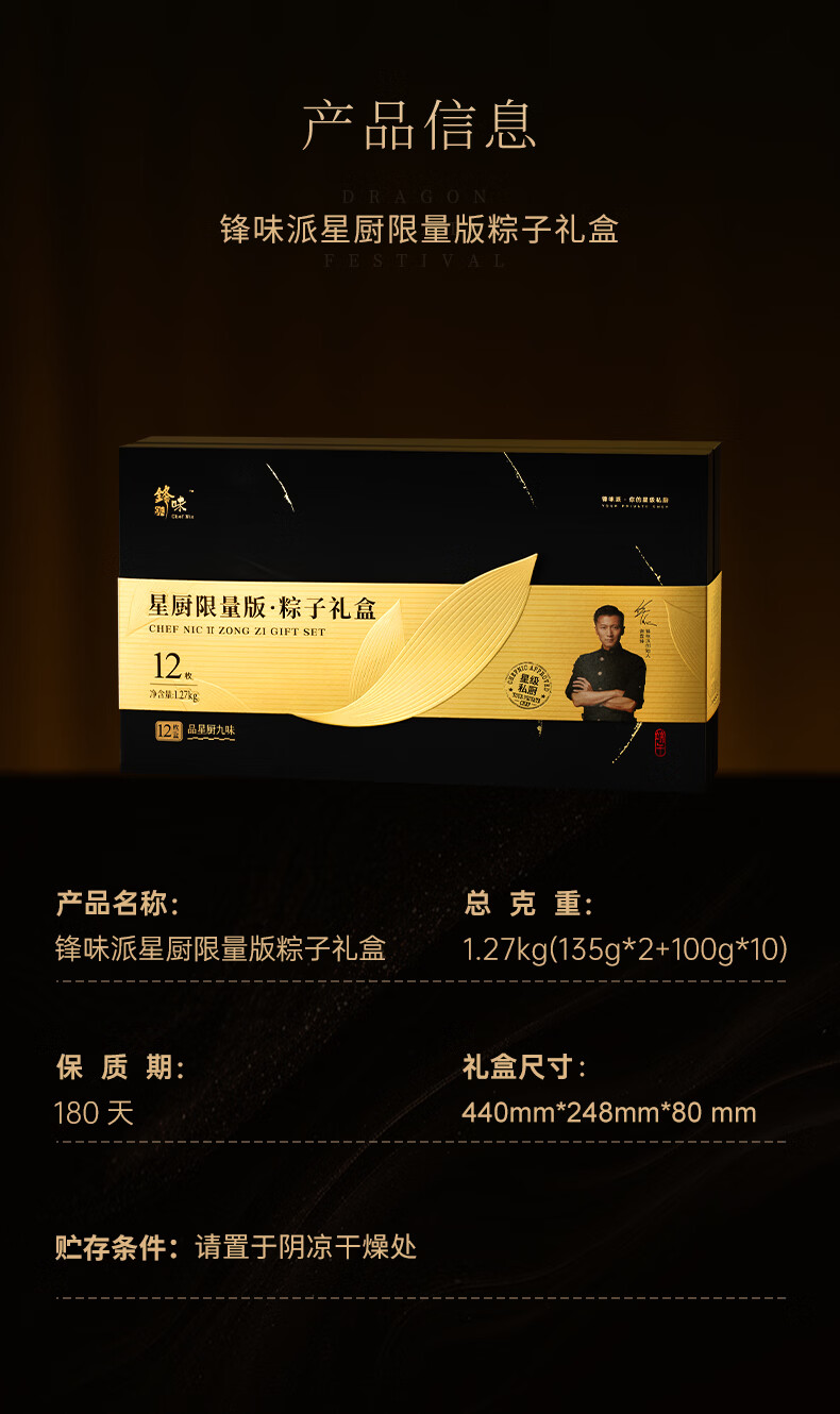 配置:【锋味派】XO酱鲍鱼金华两头乌猪肉粽 100g*2 【锋味派】黑松露云腿牛肝菌上汤粽 135g*2 【锋味派】白松露烤肠奶油蘑菇汤粽 100g*1 【锋味派】猪软骨菌菇上汤粽 100g*1 【锋味派】蛋黄黑猪鲜肉粽 100g*1 【锋味派】淤泥咖啡粽 100g*2 【锋味派】燕麦奶香粽 100g*1 【锋味派】阿胶芝麻元气粽 100g*1 【锋味派】陈皮豆沙粽 100g*1