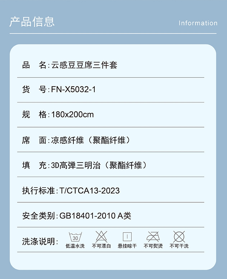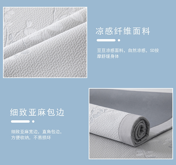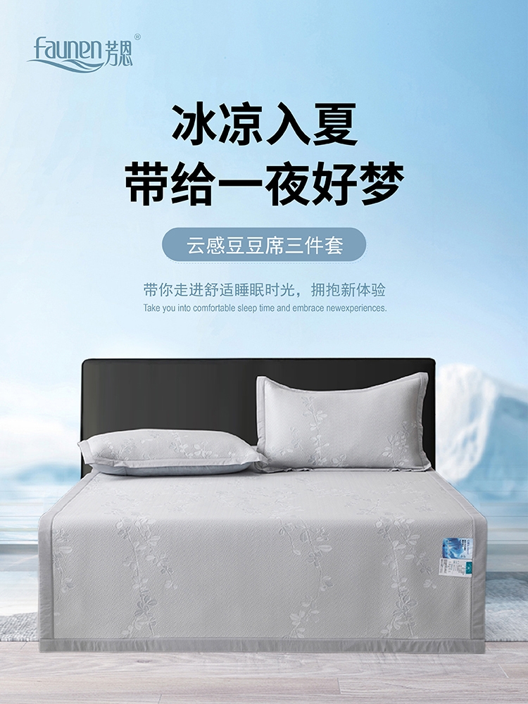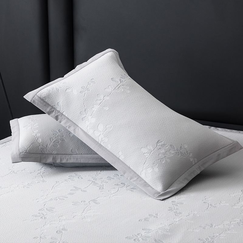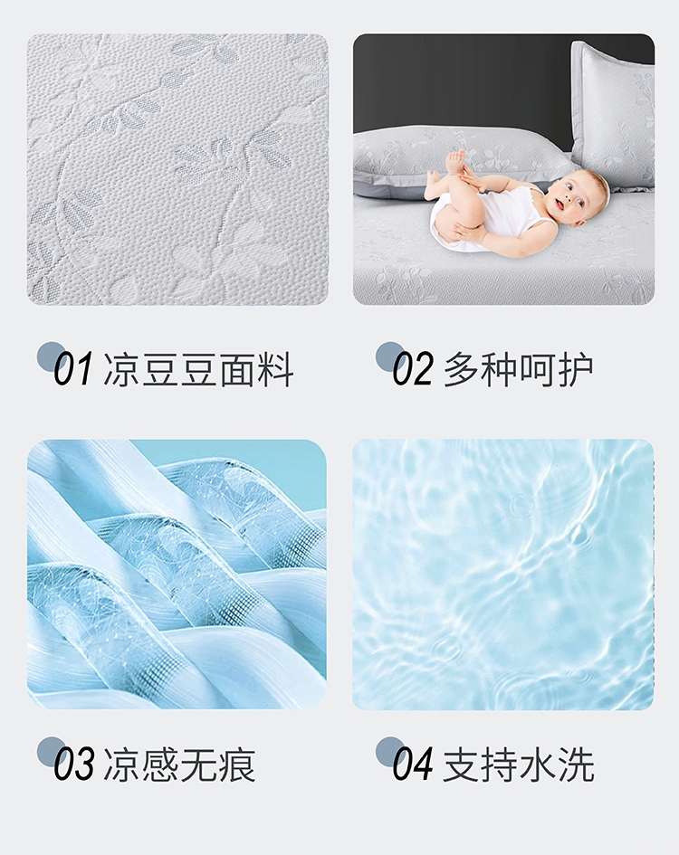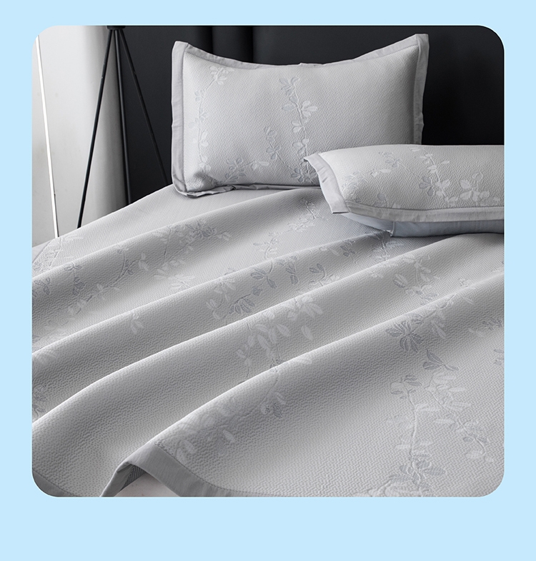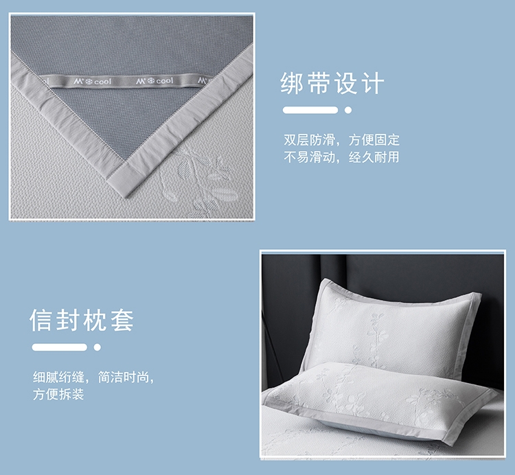 采用5D科技凉感豆豆空气层面料,光滑柔软;典雅的提花设计,彰显轻奢质感;席面、枕套直角包边,工整有度,简约大方