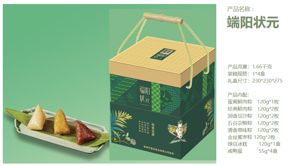 配置:蛋黄鲜肉粽 120g*1枚 经典鲜肉粽 120g*2枚 润香豆沙粽 120g*2枚 五谷杂粮粽 120g*2枚 清香原味粽 120g*2枚 金丝蜜枣粽 120g*2枚 绿豆冰糕 120g*1盒 咸鸭蛋 55g*4盒