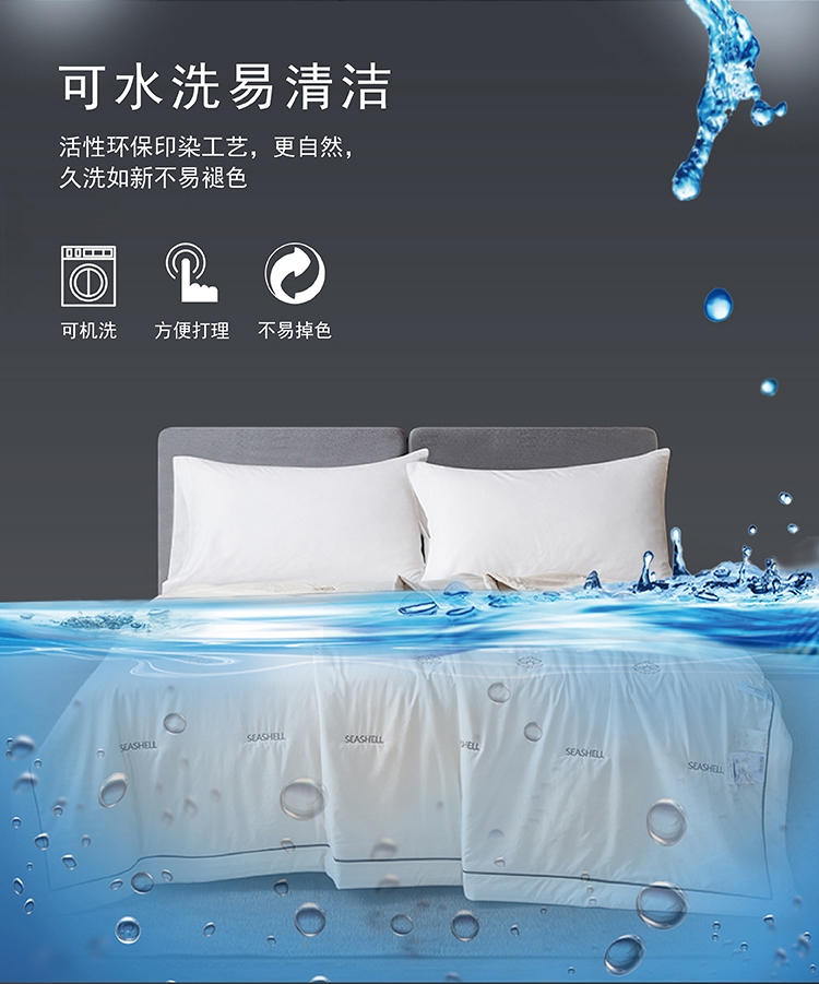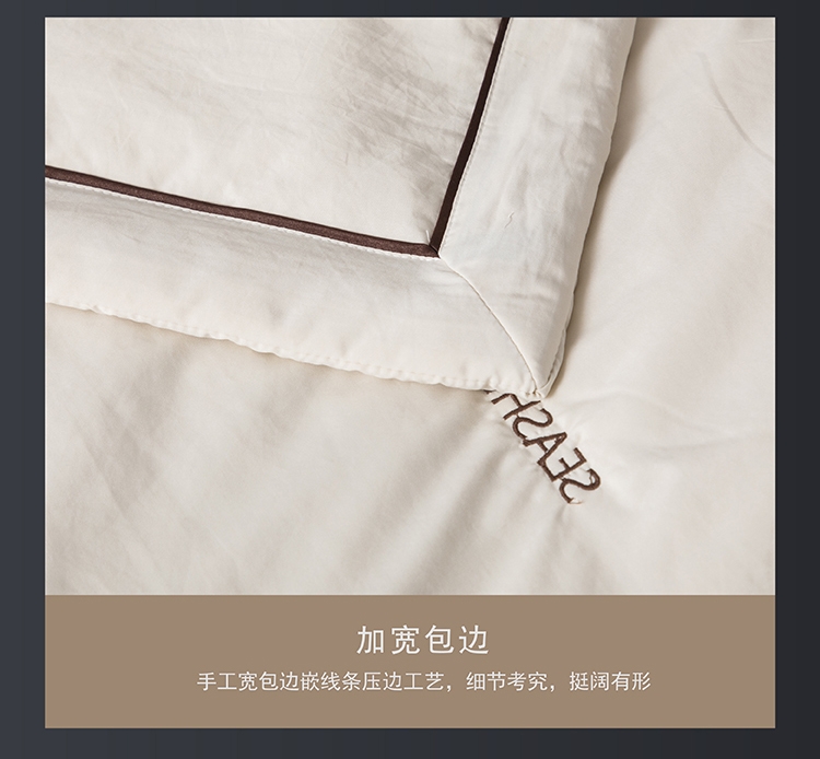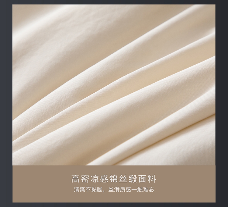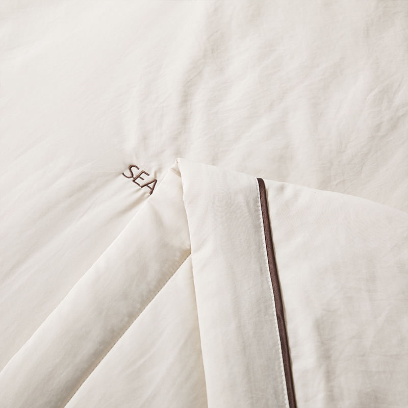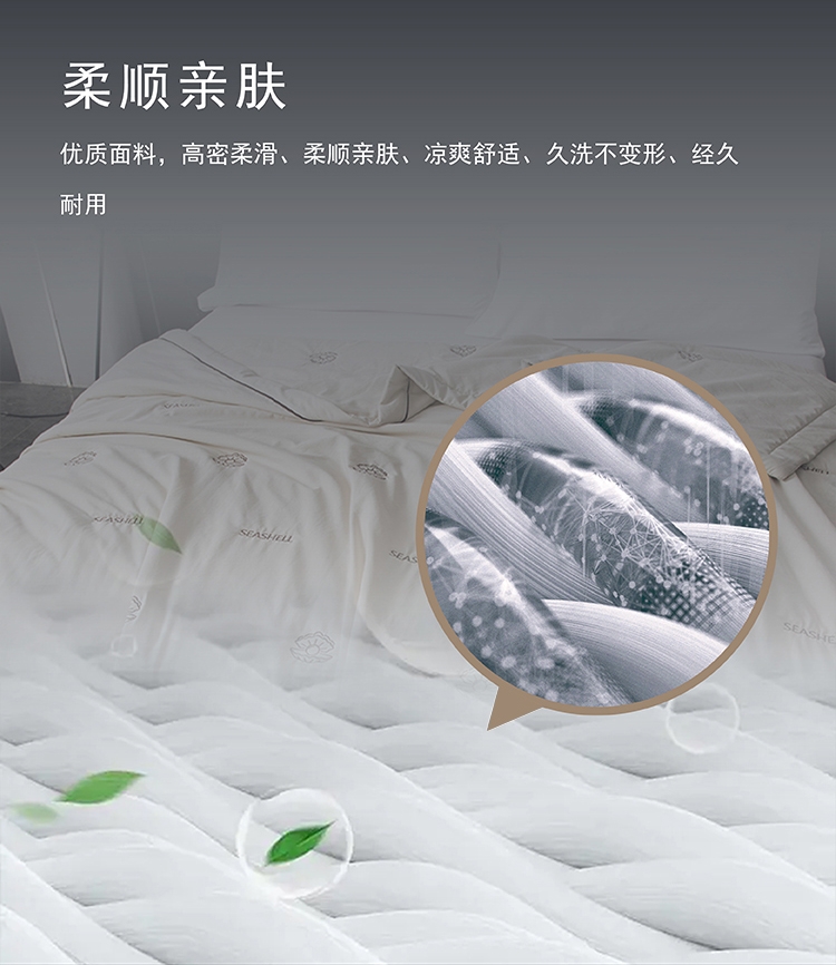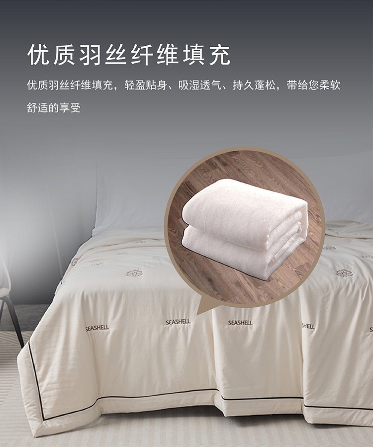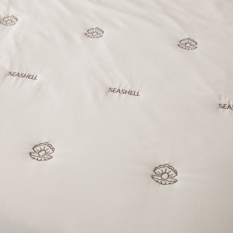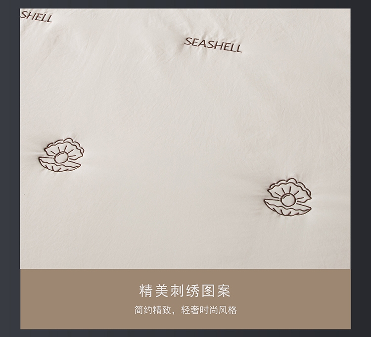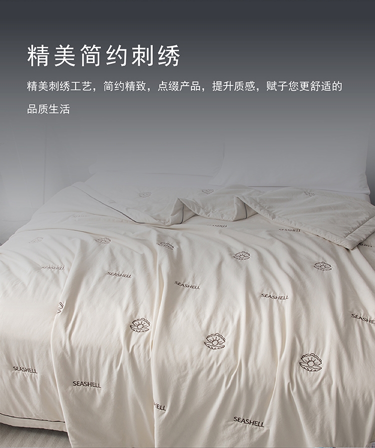 高密凉感莱赛尔锦丝缎面料,清爽不黏腻;定位精美刺绣,贝壳缀珠,如月光落满床榻;手工宽包边嵌线条压边工艺,细节考究