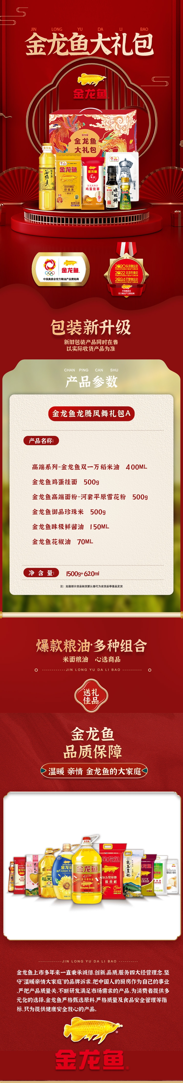 配置清单:高端系列-金龙鱼双一万稻米油400ML 金龙鱼御品鸡蛋挂面500g 金龙鱼高端面粉-河套平原雪花粉500g 金龙鱼御品珍珠米500g 金龙鱼味极鲜酱油150ML 金龙鱼花椒油70ML