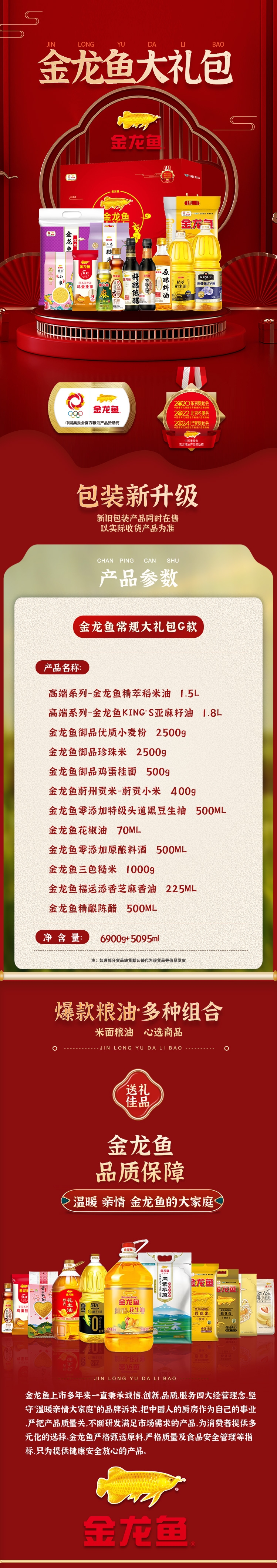 配置清单:高端系列-金龙鱼精萃稻米油1.5L 高端系列-金龙鱼KINGS亚麻籽油1.5L 金龙鱼御品优质小麦粉2500g 金龙鱼御品珍珠米2500g 金龙鱼御品鸡蛋挂面500g 金龙鱼蔚州贡米-蔚贡小米400g 金龙鱼零添加特级头道黑豆生抽500ML 金龙鱼花椒油70ML 金龙鱼零添加原酿料酒500ML 金龙鱼三色糙米1000g 金龙鱼福运添香芝麻香油225ML 金龙鱼精酿陈醋500ML