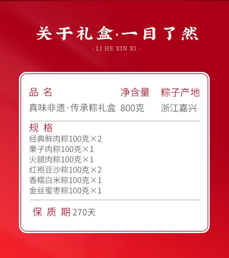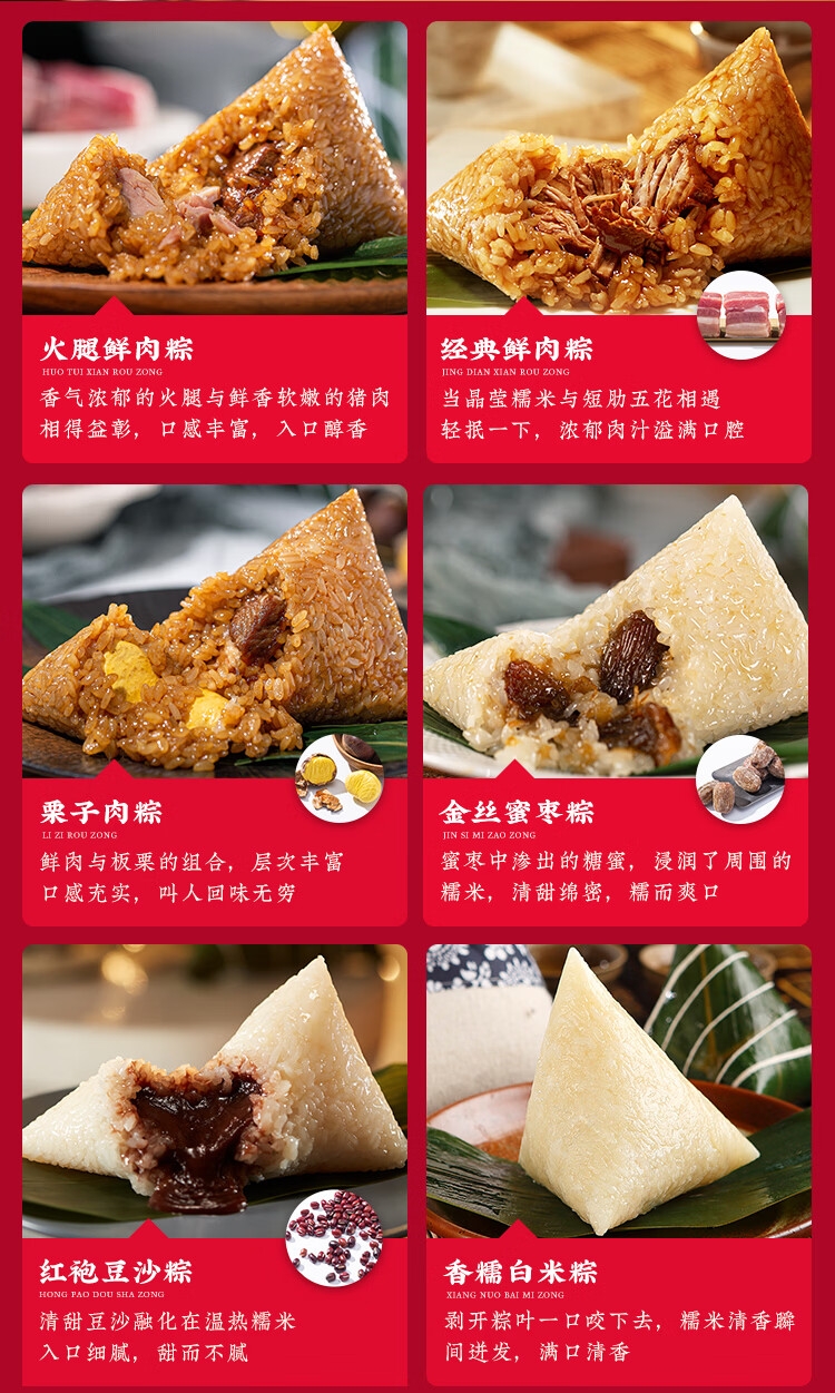 配置:经典鲜肉粽100克*1只/袋*2袋 栗子肉粽100克*1只/袋*1袋 火腿肉粽100克*1只/袋*1袋 红袍豆沙粽100克*1只/袋*2袋 香糯白米粽100克*1只/袋*1袋 金丝蜜枣粽100克*1只/袋*1袋