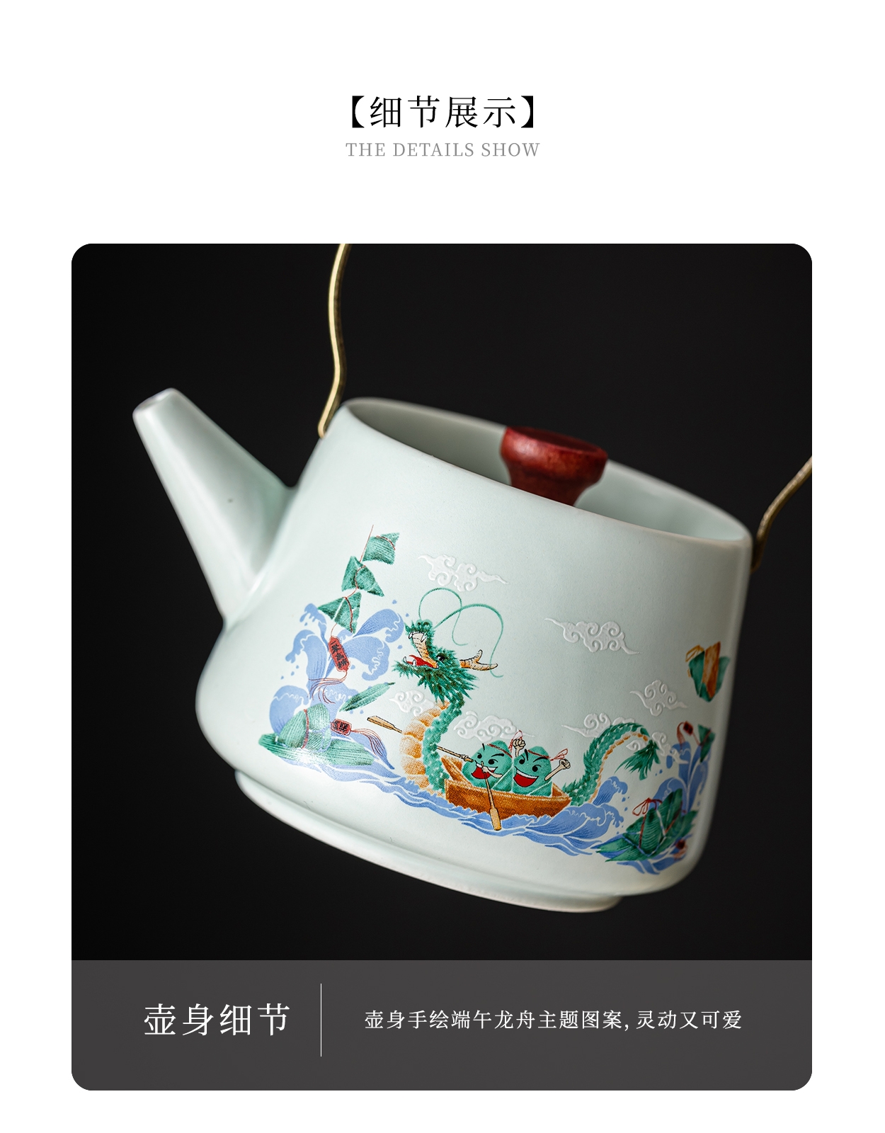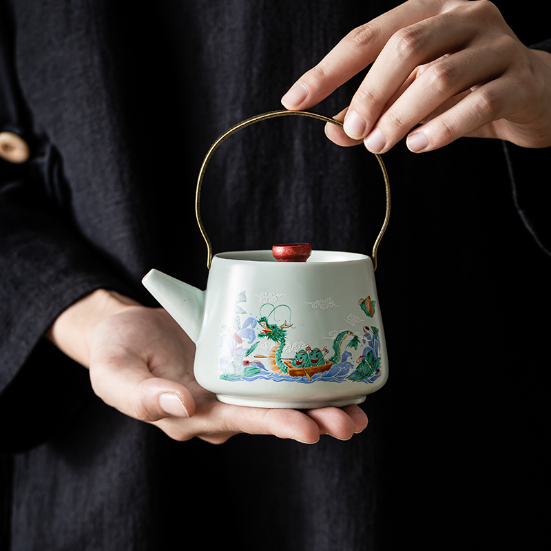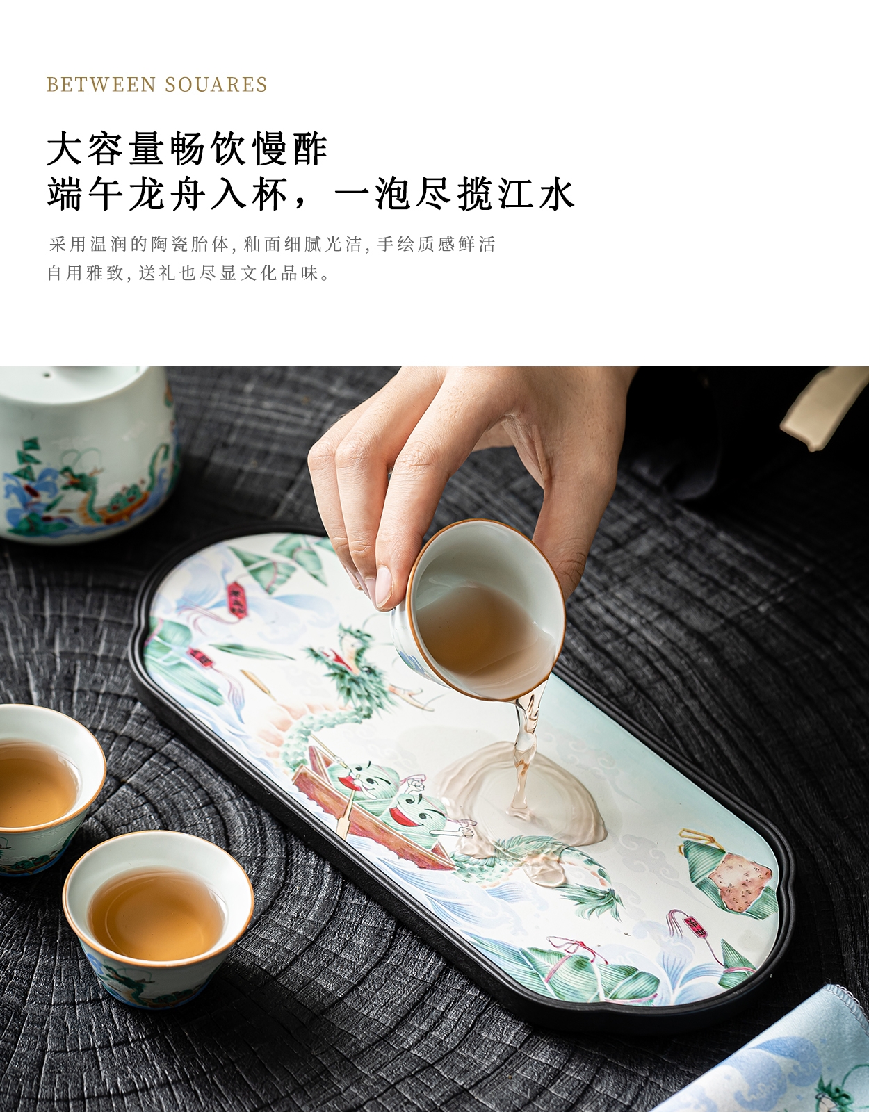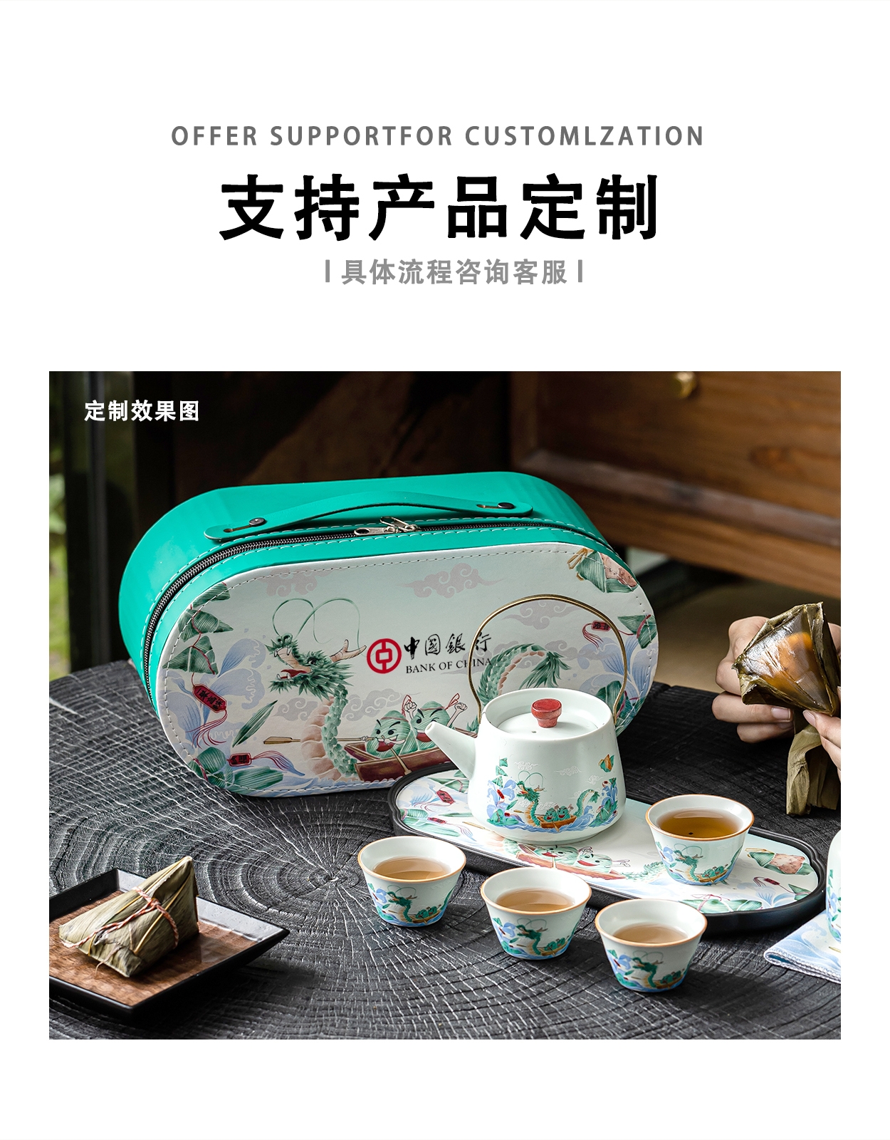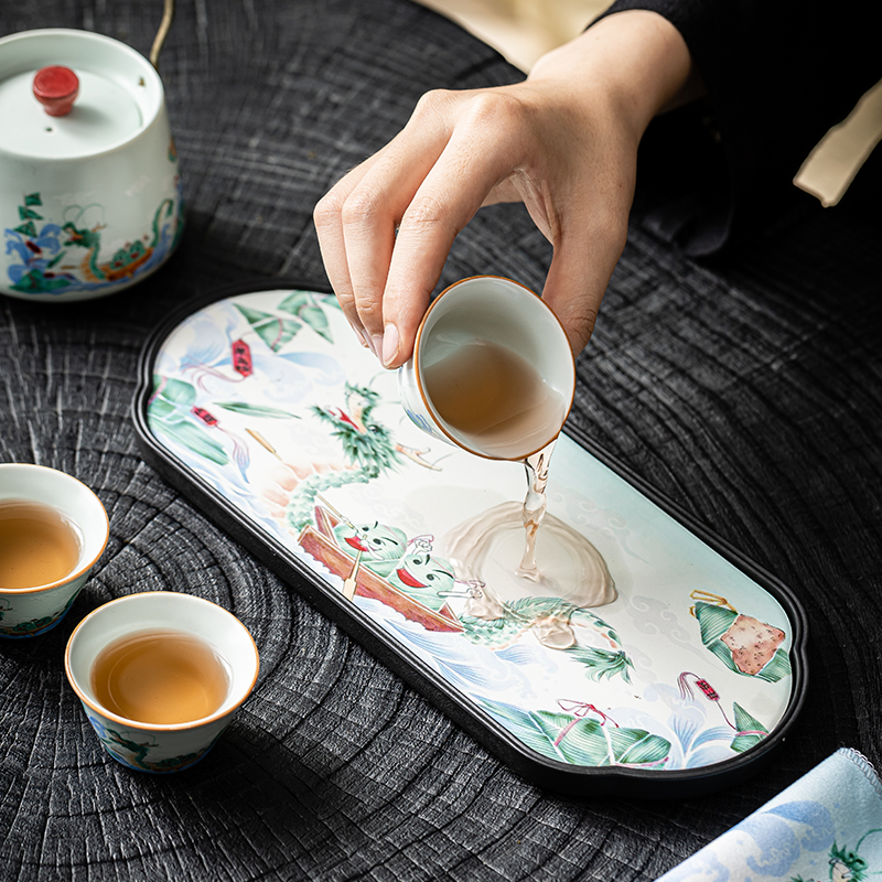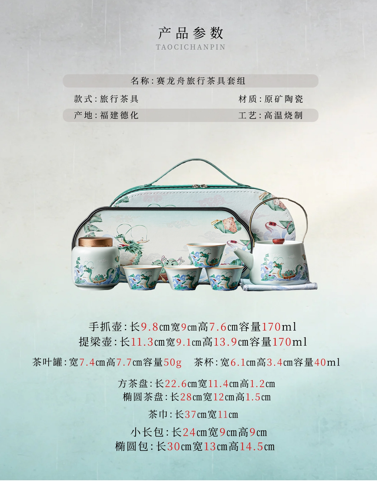 茶具表面绘有赛龙舟图案,色彩鲜艳、生动形象;采用了优质的陶瓷材质,具有良好的保温性能和耐用性;椭圆包设计合理,能够将茶具整齐收纳,提手方便携带