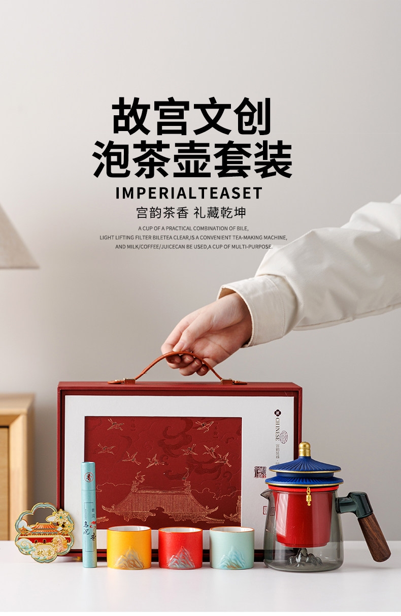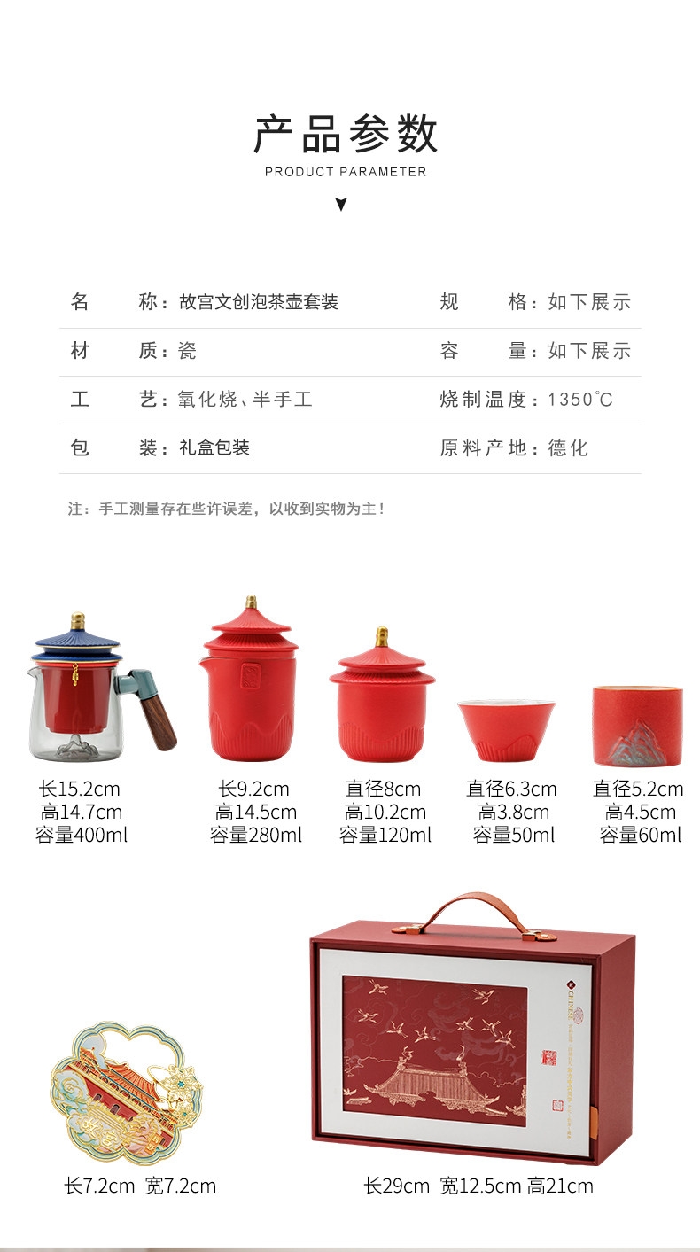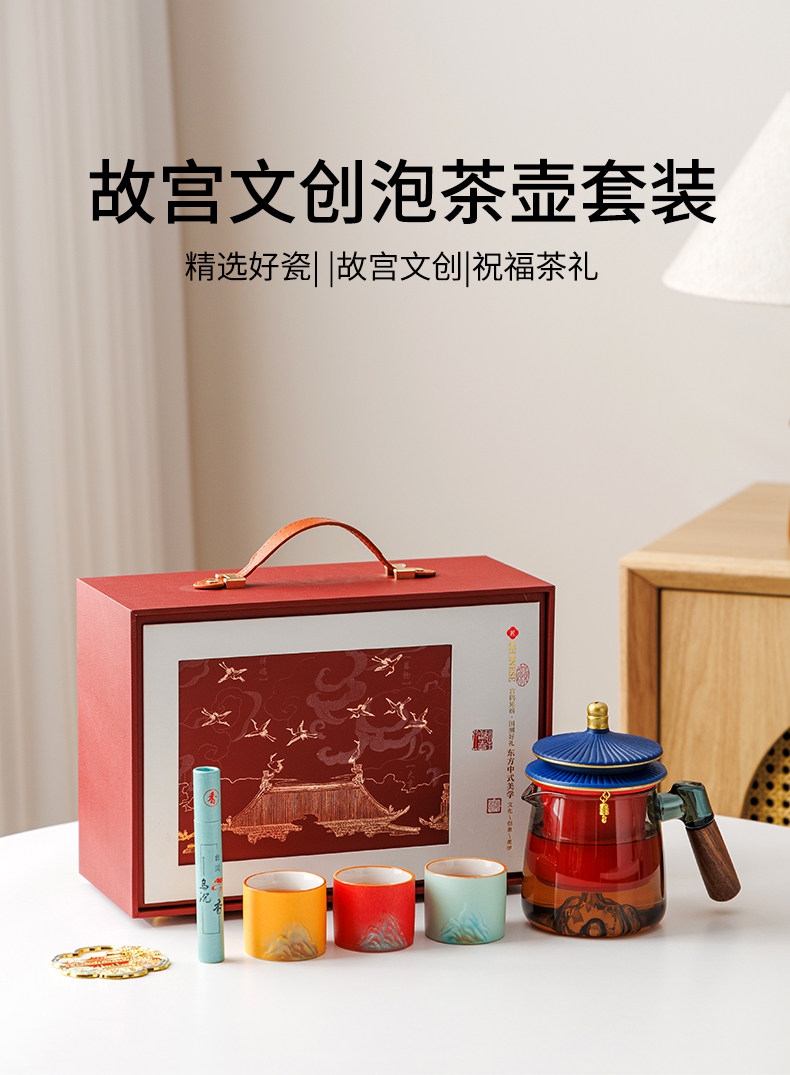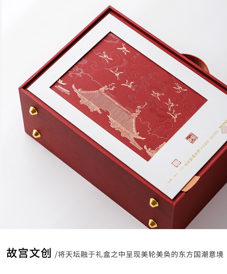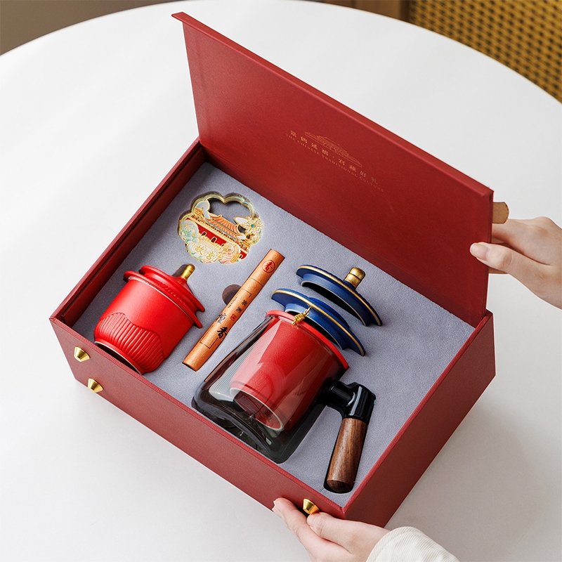 套装融入故宫经典元素,如祥云、飞鸟等传统纹饰;配套礼盒设计精美红色为主色调,彰显高端大气;附赠冰箱贴和线香,冰箱贴具有故宫特色,可作装饰