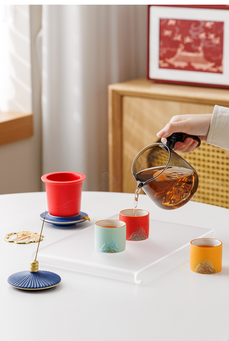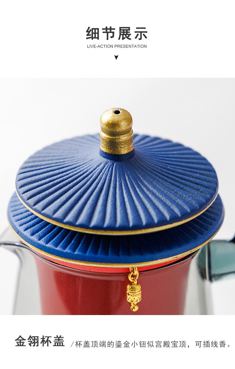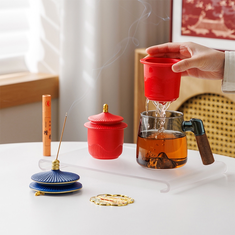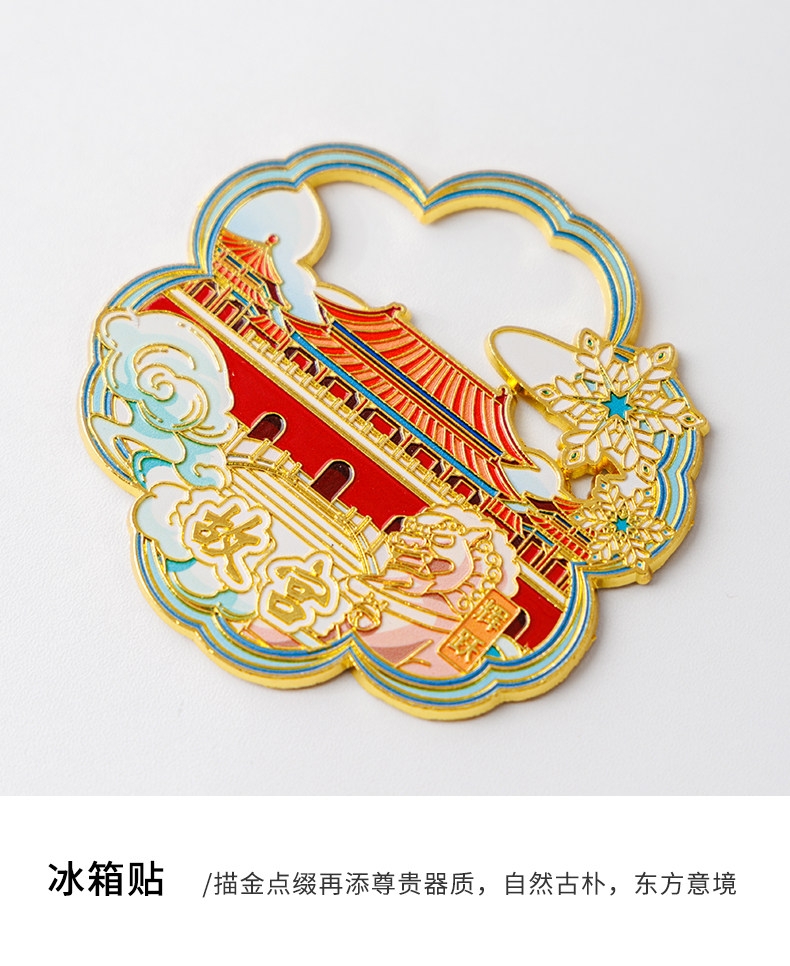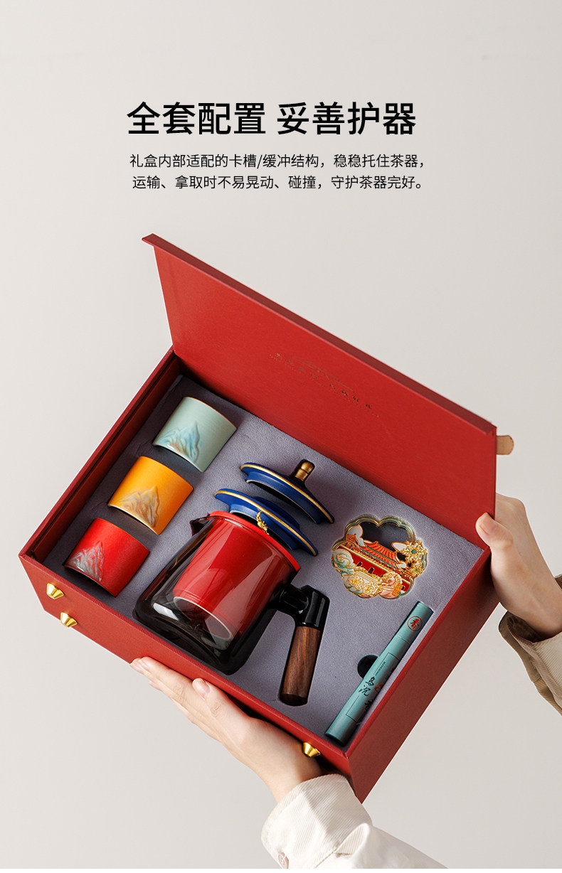 套装融入故宫经典元素,如祥云、飞鸟等传统纹饰;配套礼盒设计精美红色为主色调,彰显高端大气;附赠冰箱贴和线香,冰箱贴具有故宫特色,可作装饰
