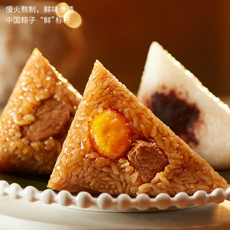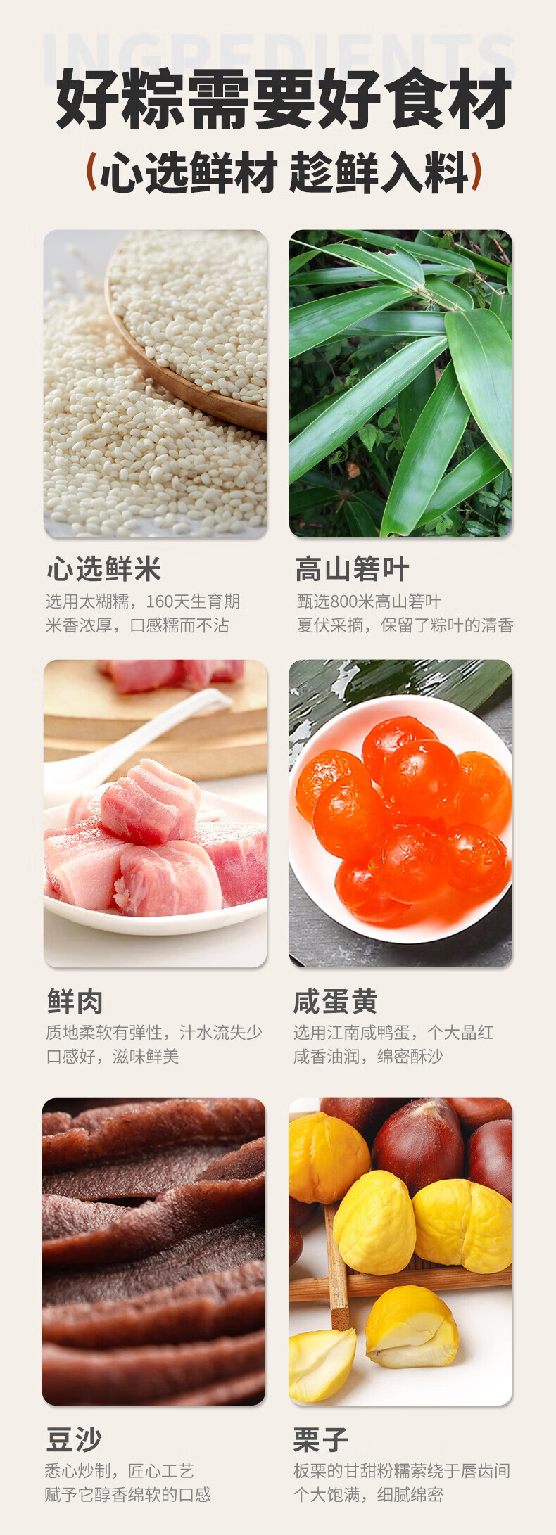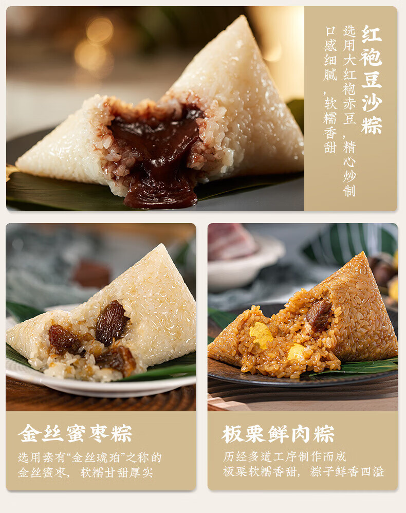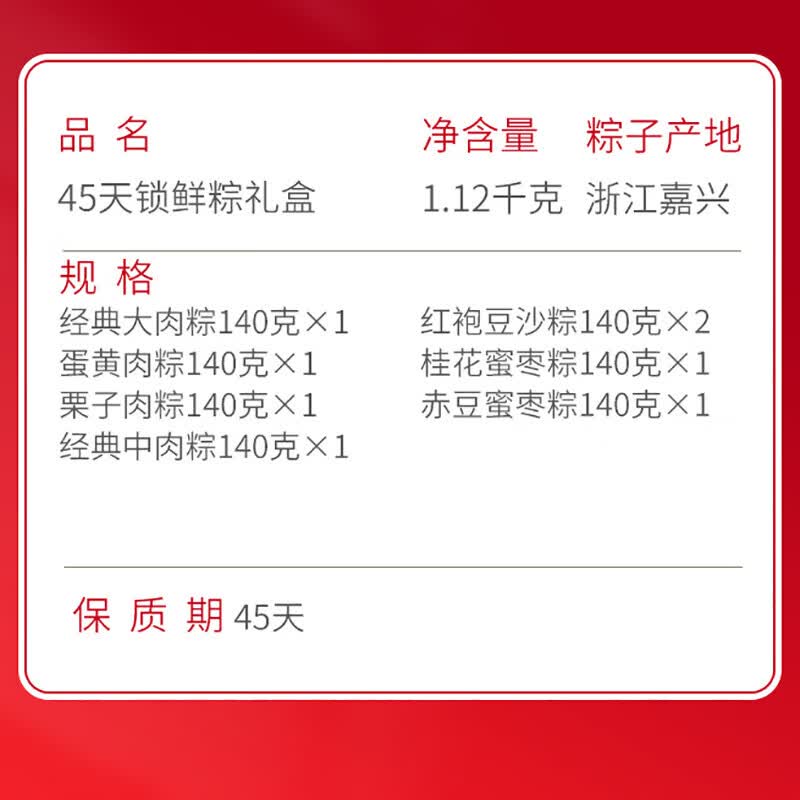 配置:保鲜140g经典大肉粽(45天)*1袋 保鲜140g经典栗子鲜肉粽(45天)*1袋 保鲜140g经典中肉粽(45天)*1袋 保鲜140g经典蛋黄鲜肉粽(45天)*1袋 保鲜140g经典红袍豆沙粽(45天)*2袋 保鲜140g经典桂花蜜枣粽(45天)*1袋 保鲜140g经典赤豆蜜枣粽(45天)*1袋