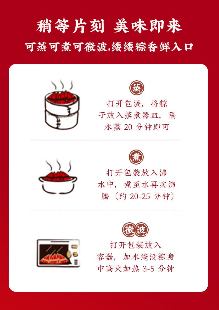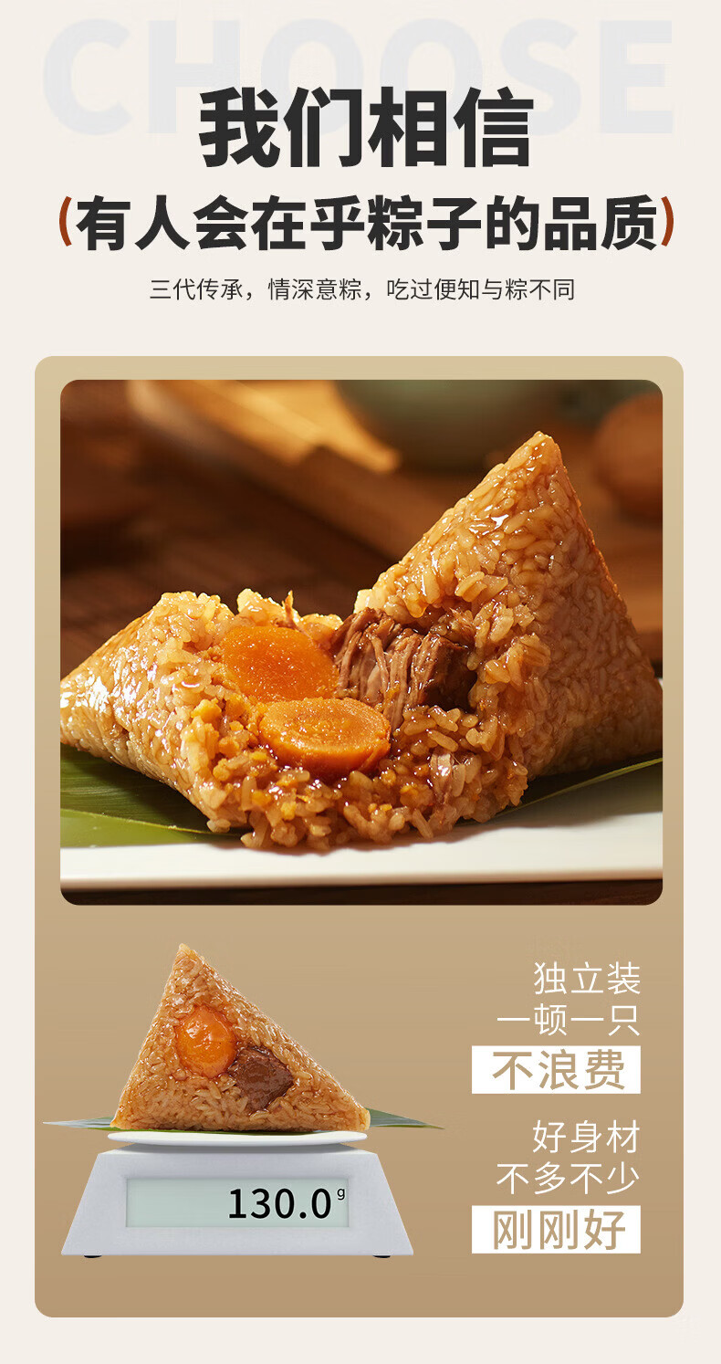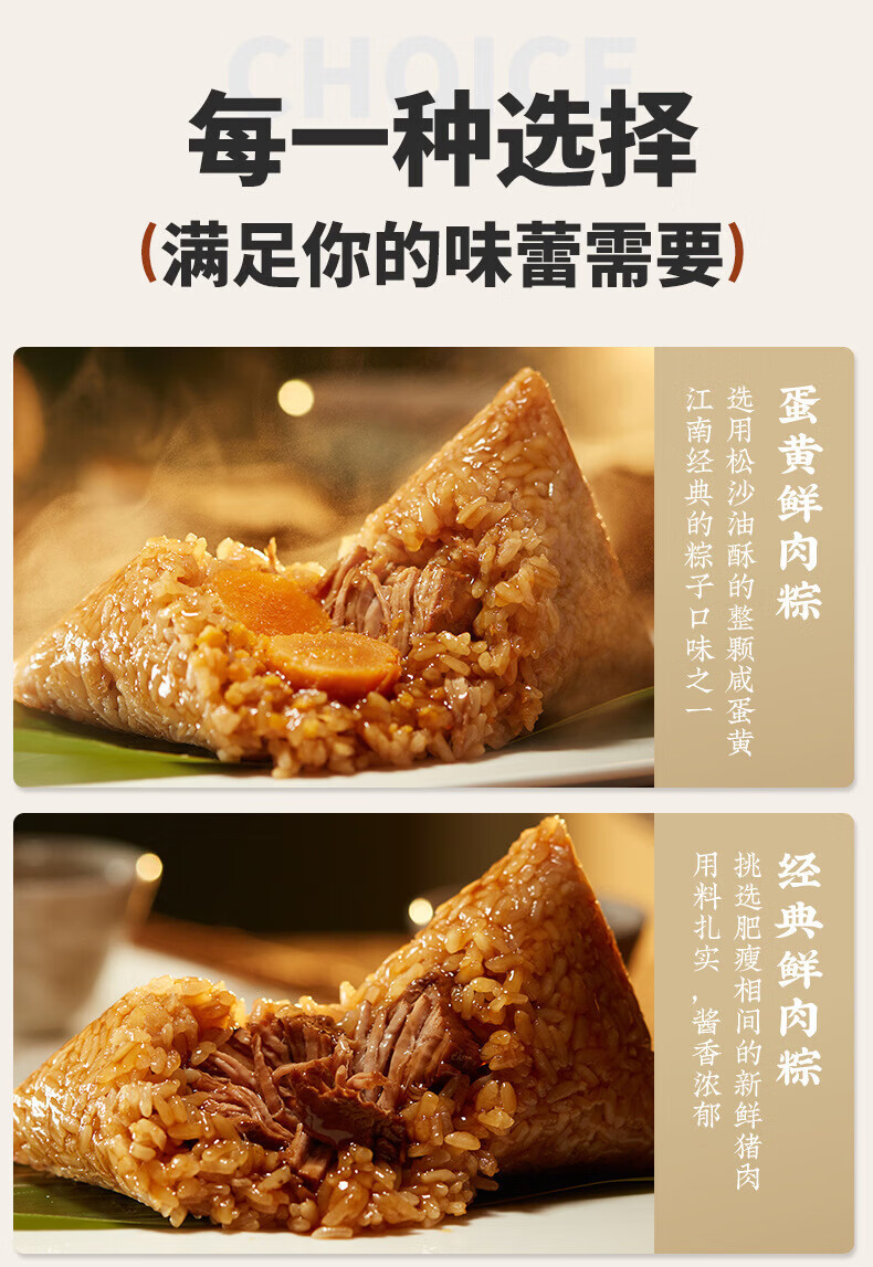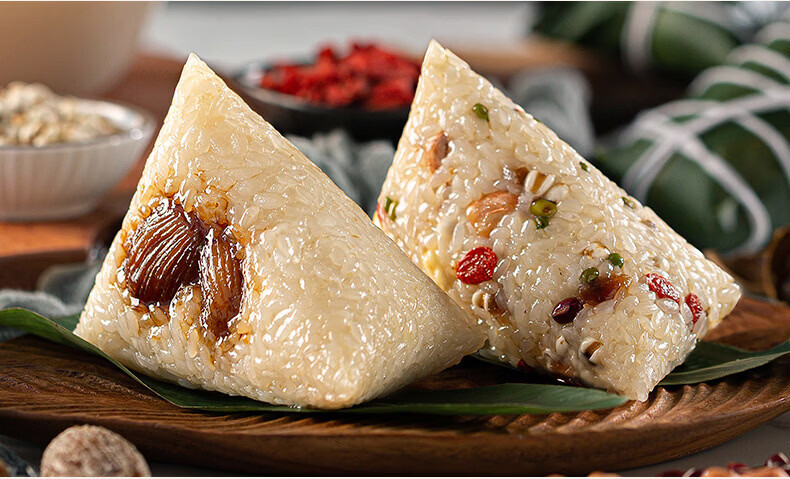 配置:保鲜140g经典大肉粽(45天)*1袋 保鲜140g经典栗子鲜肉粽(45天)*1袋 保鲜140g经典中肉粽(45天)*1袋 保鲜140g经典蛋黄鲜肉粽(45天)*1袋 保鲜140g经典红袍豆沙粽(45天)*2袋 保鲜140g经典桂花蜜枣粽(45天)*1袋 保鲜140g经典赤豆蜜枣粽(45天)*1袋