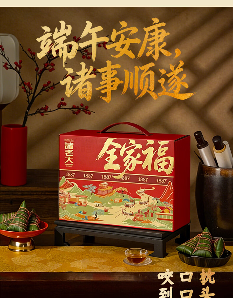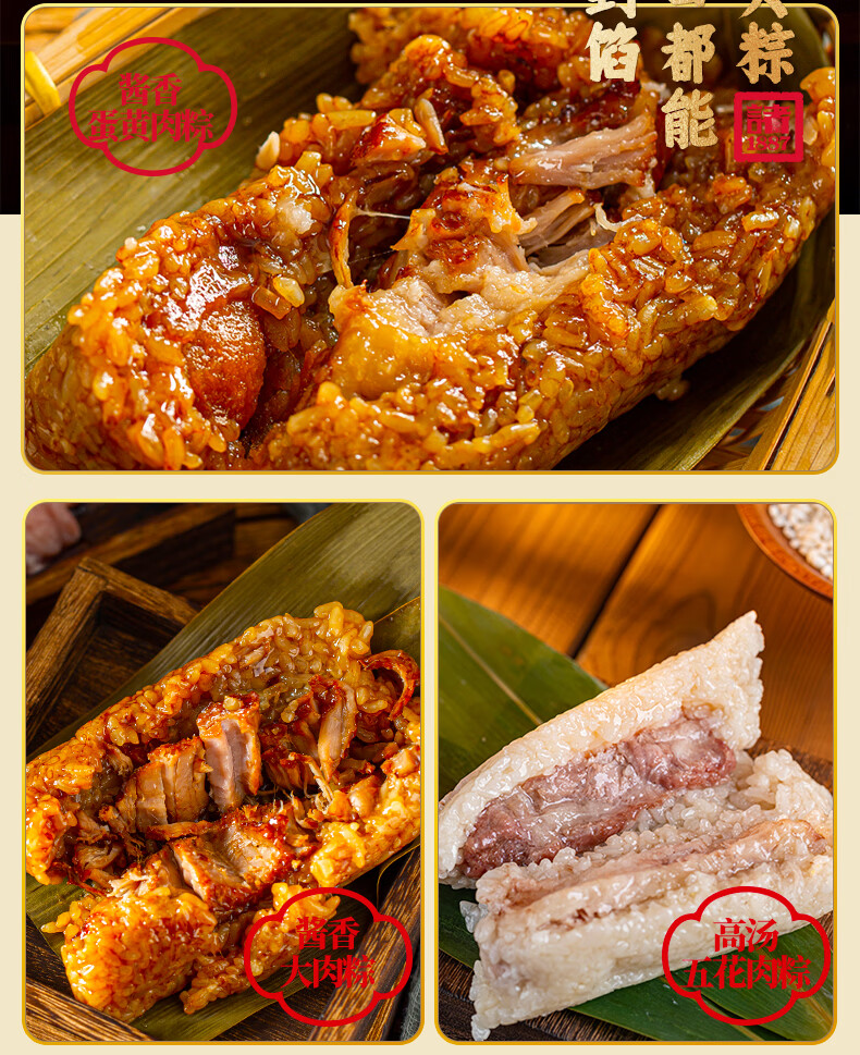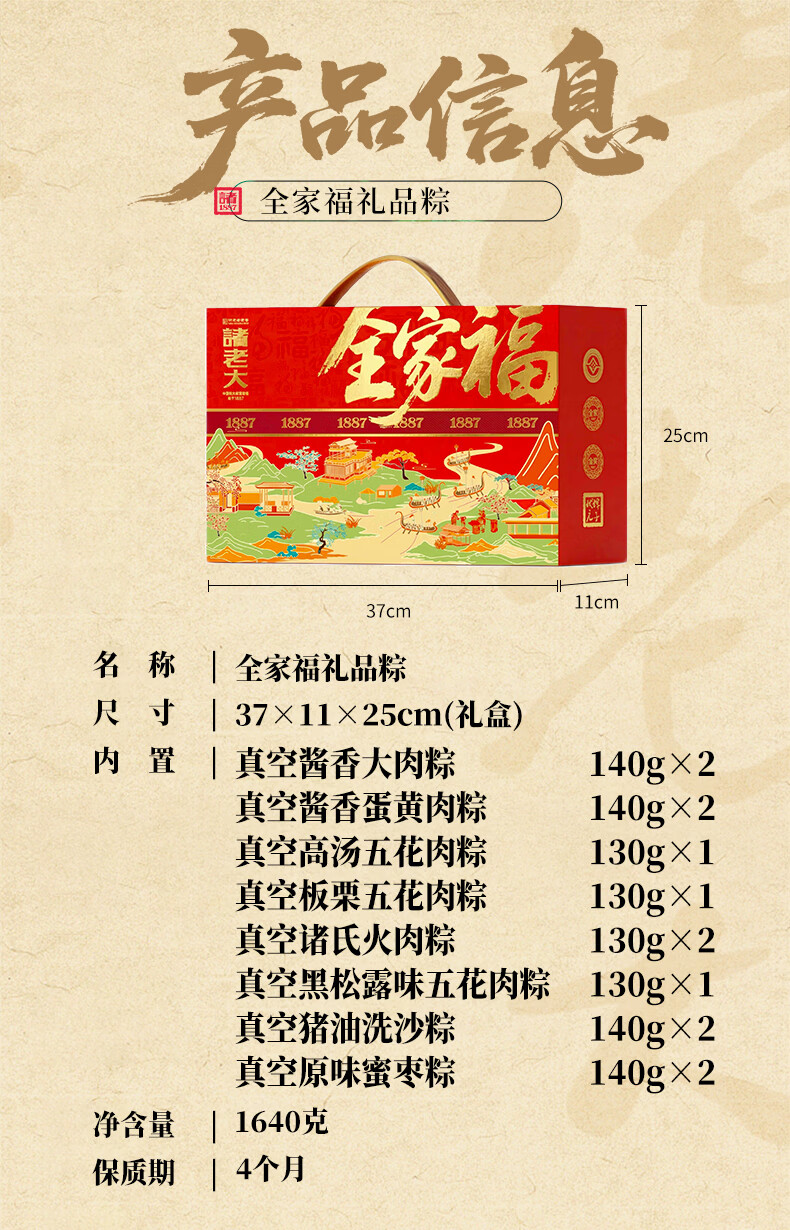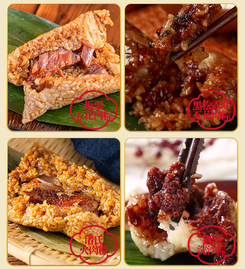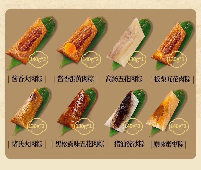 配置:140克*2真空酱香大肉粽*1 140克*2真空酱香蛋黄肉粽*1 130克*1真空高汤五花肉粽*1 130克*1真空板栗五花肉粽*1 130克*1真空诸氏火肉粽*1 130克*1真空黑松露味五花肉粽*1 140克*2真空猪油洗沙粽*1 140克*2真空原味蜜枣粽*1