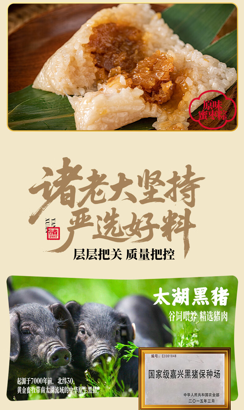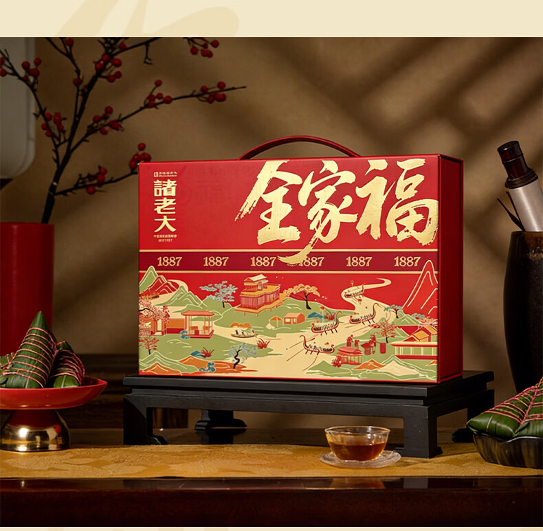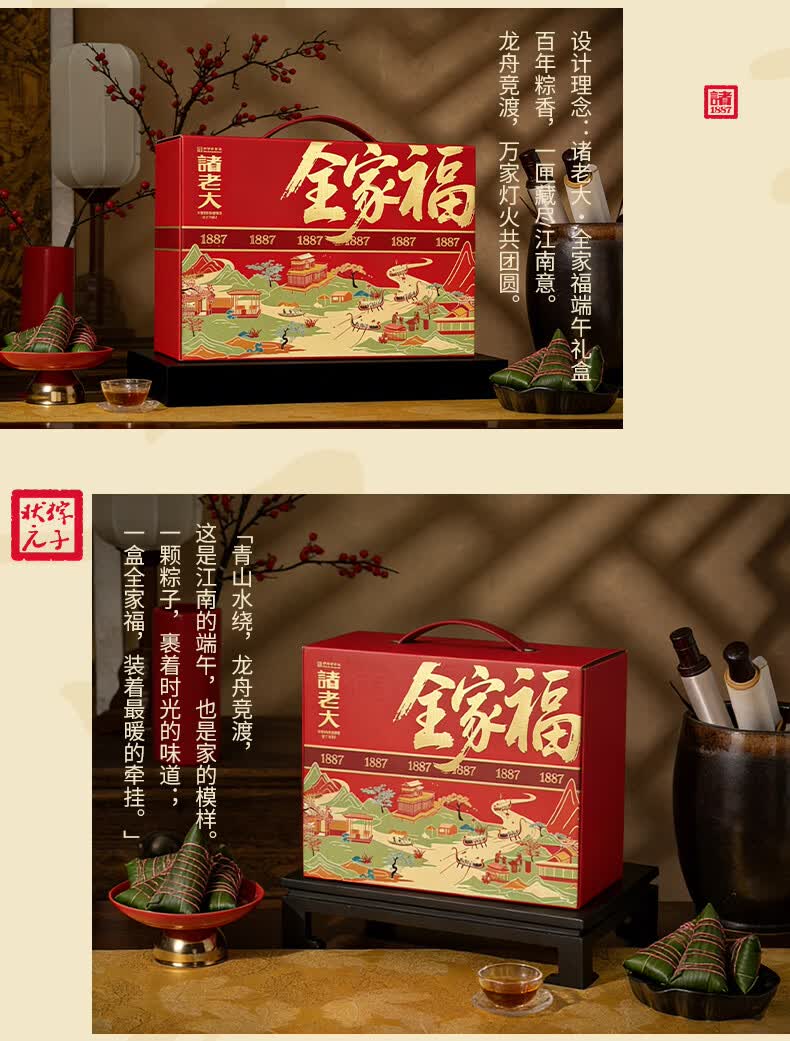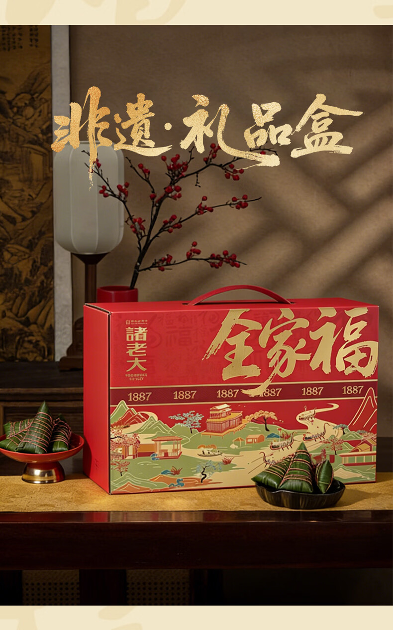 配置:140克*2真空酱香大肉粽*1 140克*2真空酱香蛋黄肉粽*1 130克*1真空高汤五花肉粽*1 130克*1真空板栗五花肉粽*1 130克*1真空诸氏火肉粽*1 130克*1真空黑松露味五花肉粽*1 140克*2真空猪油洗沙粽*1 140克*2真空原味蜜枣粽*1
