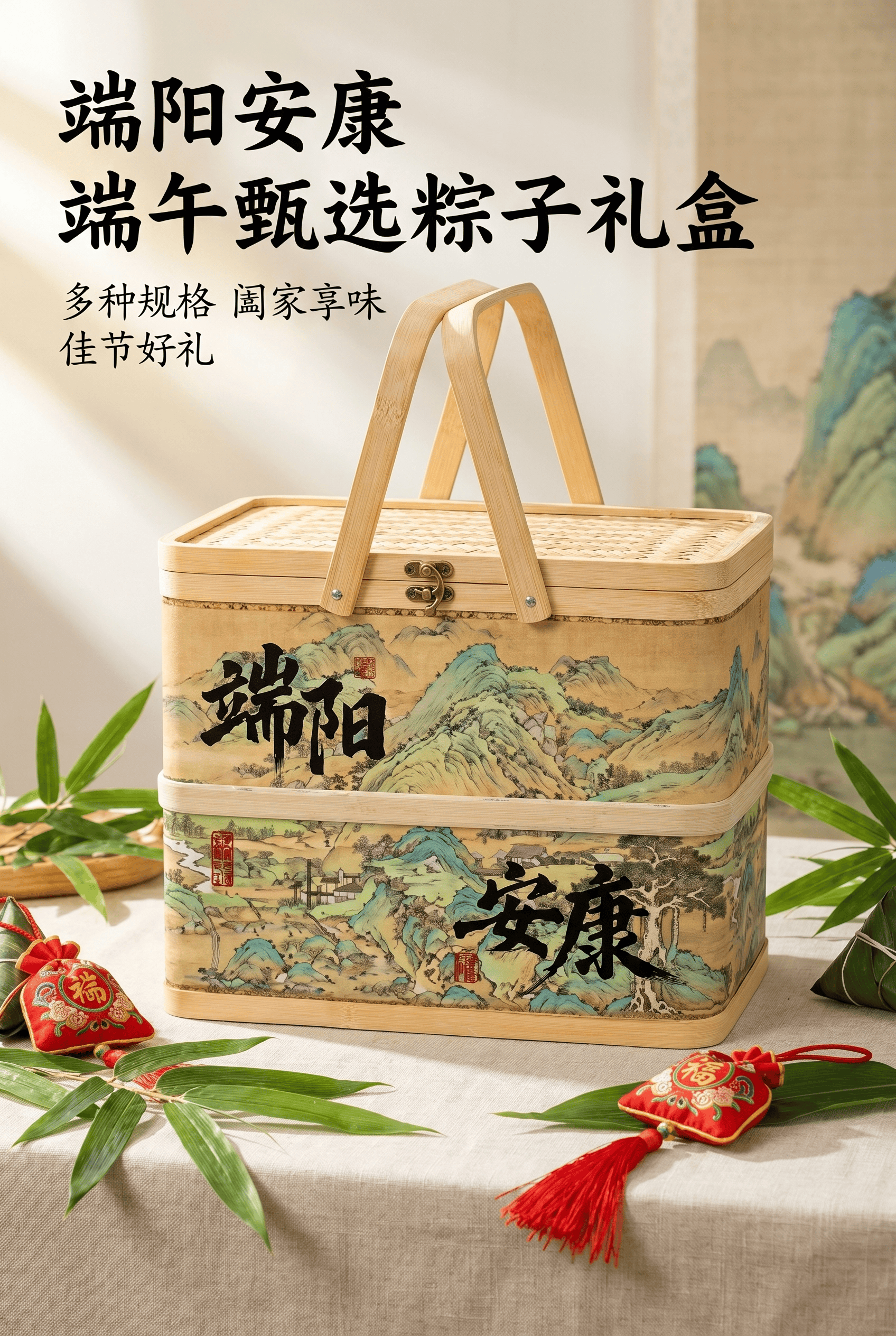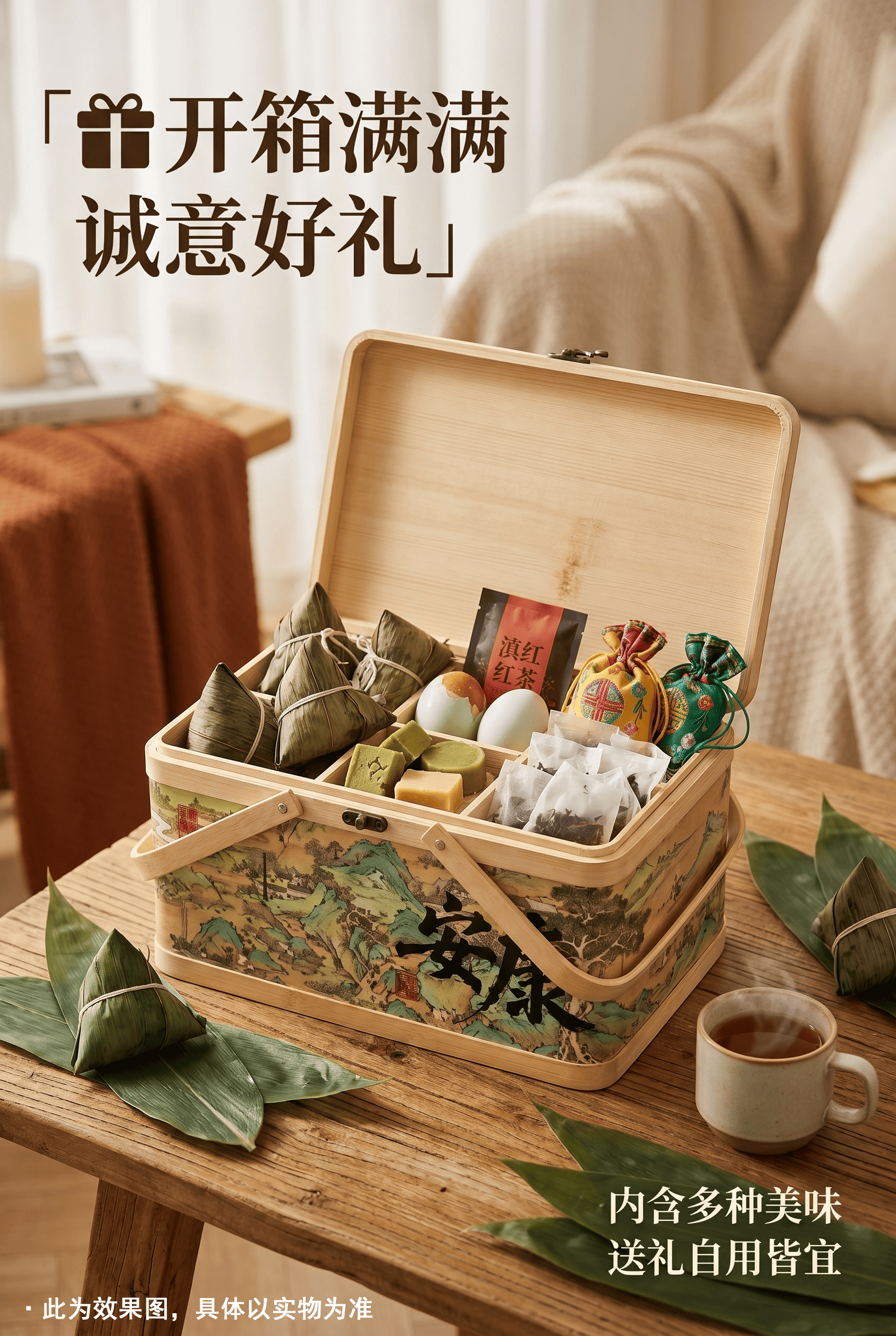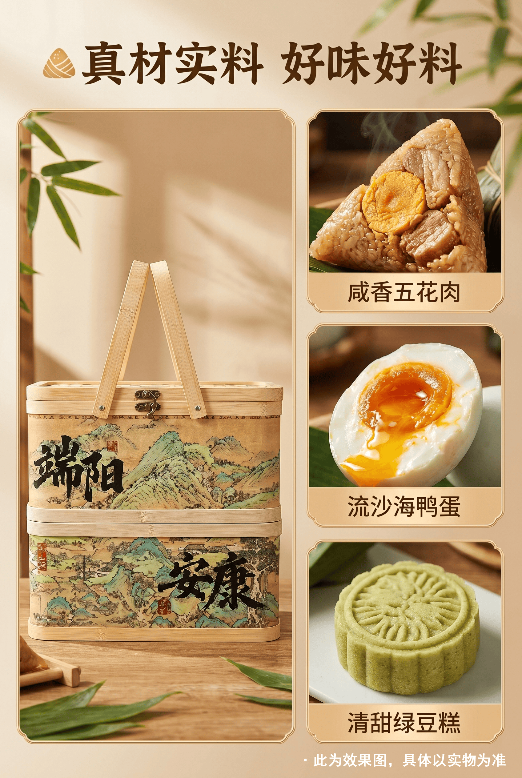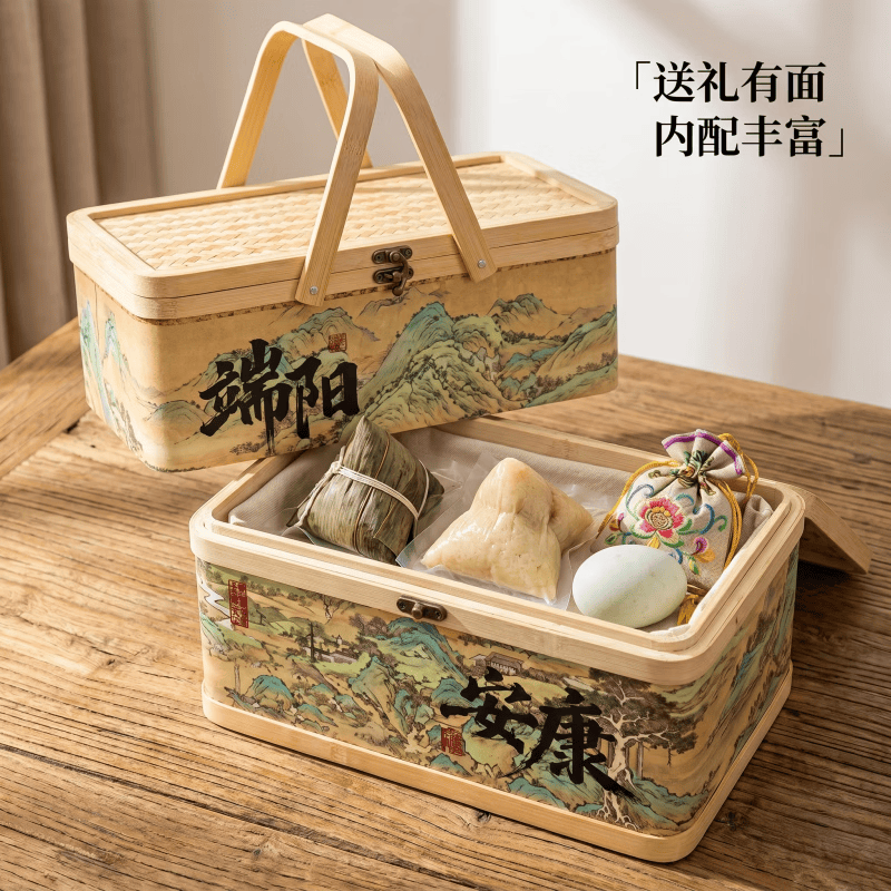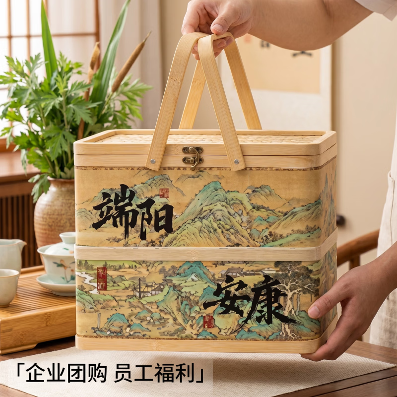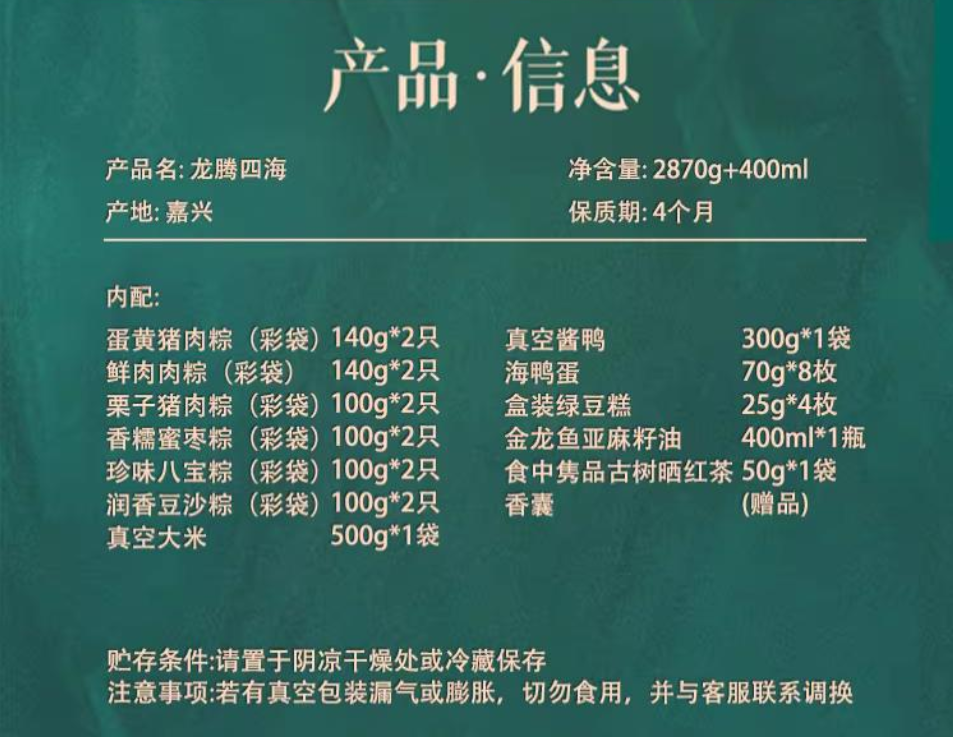 配置:140克*2蛋黄猪肉粽 140克*2鲜肉肉粽 100克*2栗子猪肉粽 100克*2香糯蜜枣粽 100克*2珍味八宝粽 100克*2润香豆沙粽 500g真空大米 300克真空酱鸭 70g*8广西海鸭蛋 25克*4盒装绿豆糕 金龙鱼亚麻籽油400ml 香囊 普洱茶包