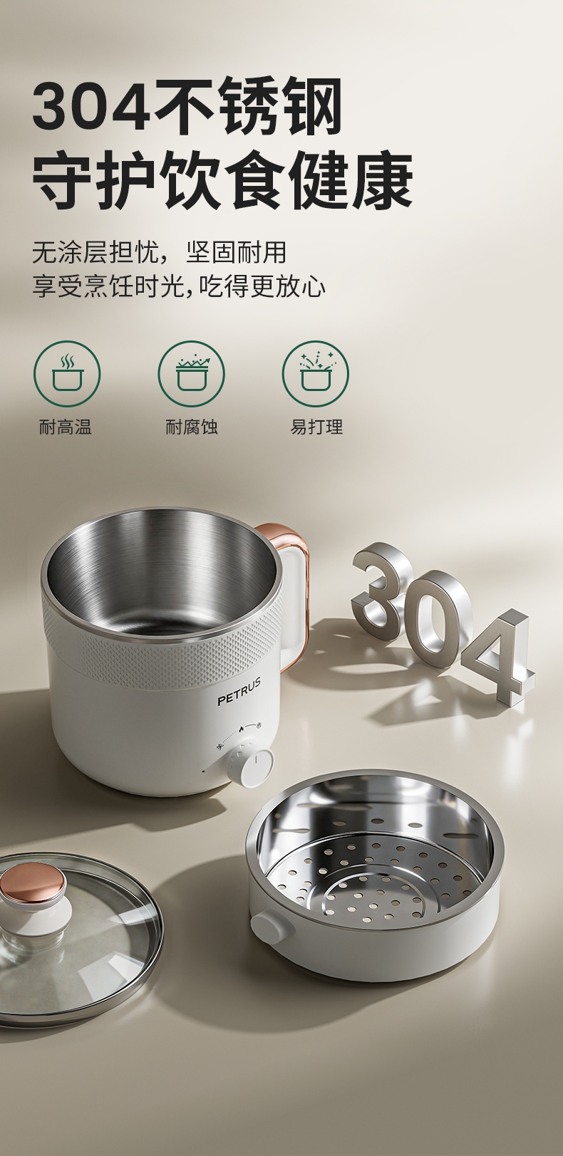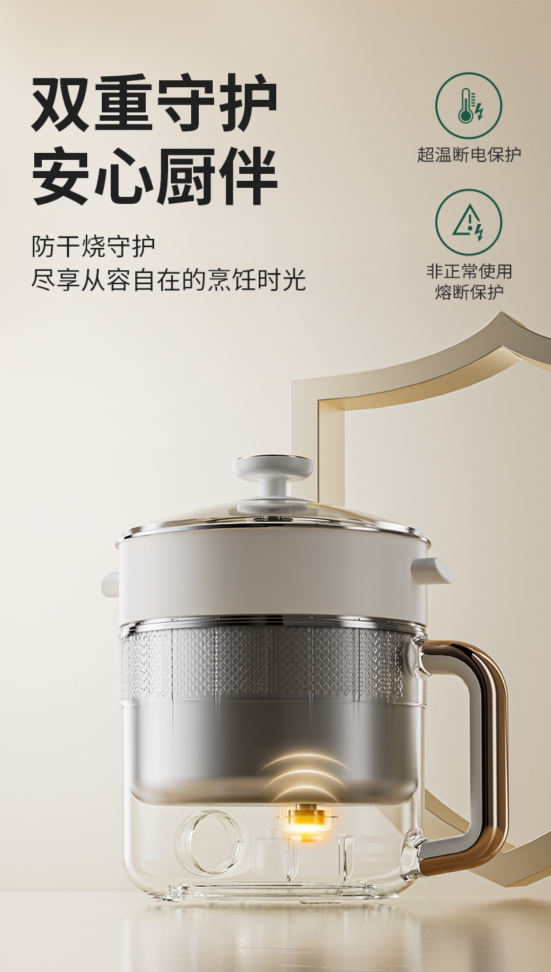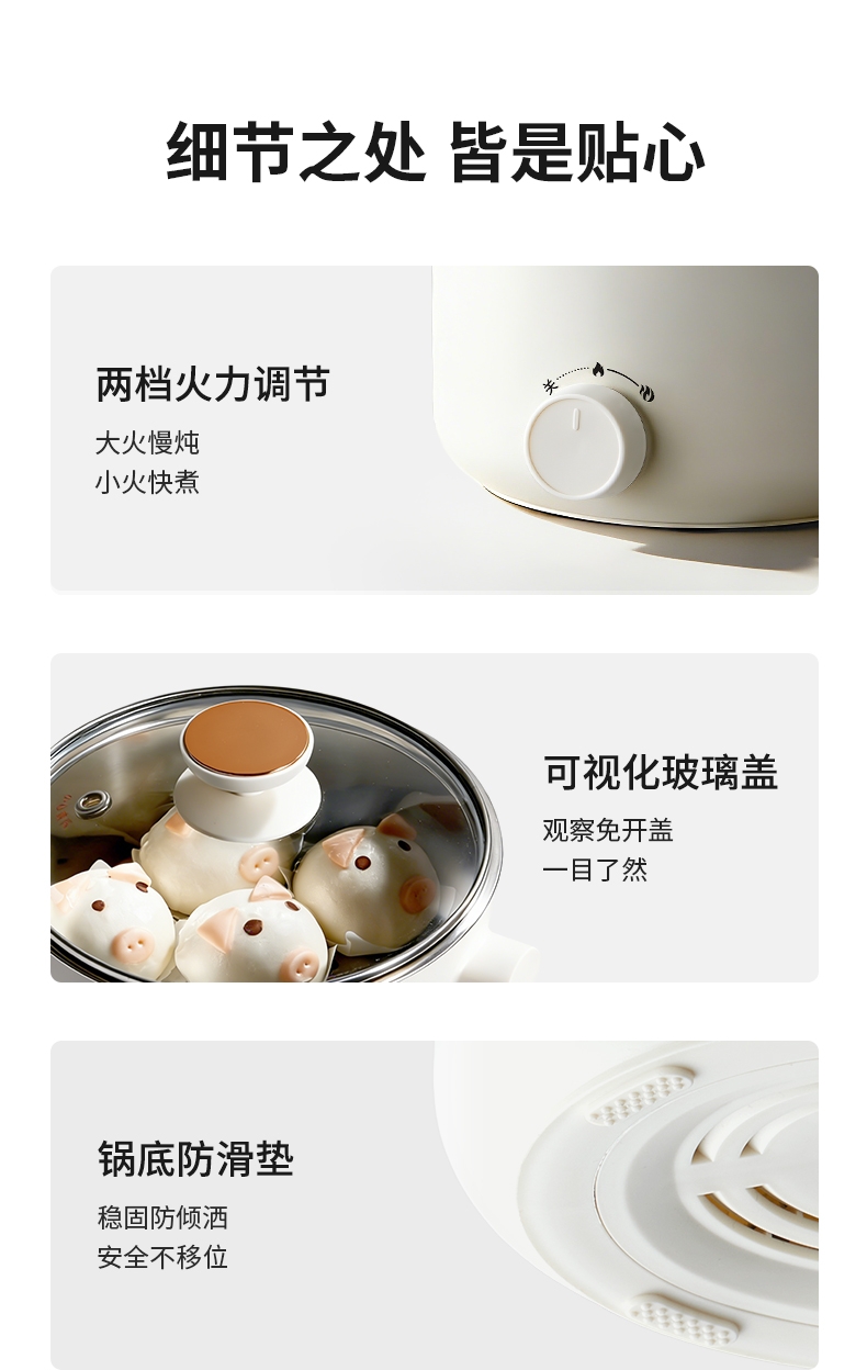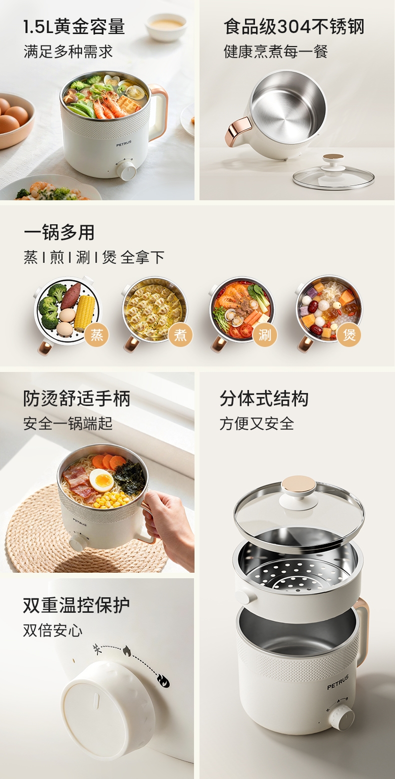 1.5L黄金容量,自带蒸笼;全不锈钢食材接触,安全卫生;双重温控保护,自动断电,安全放心