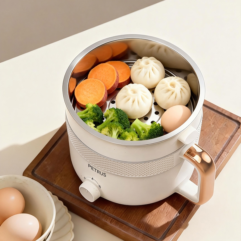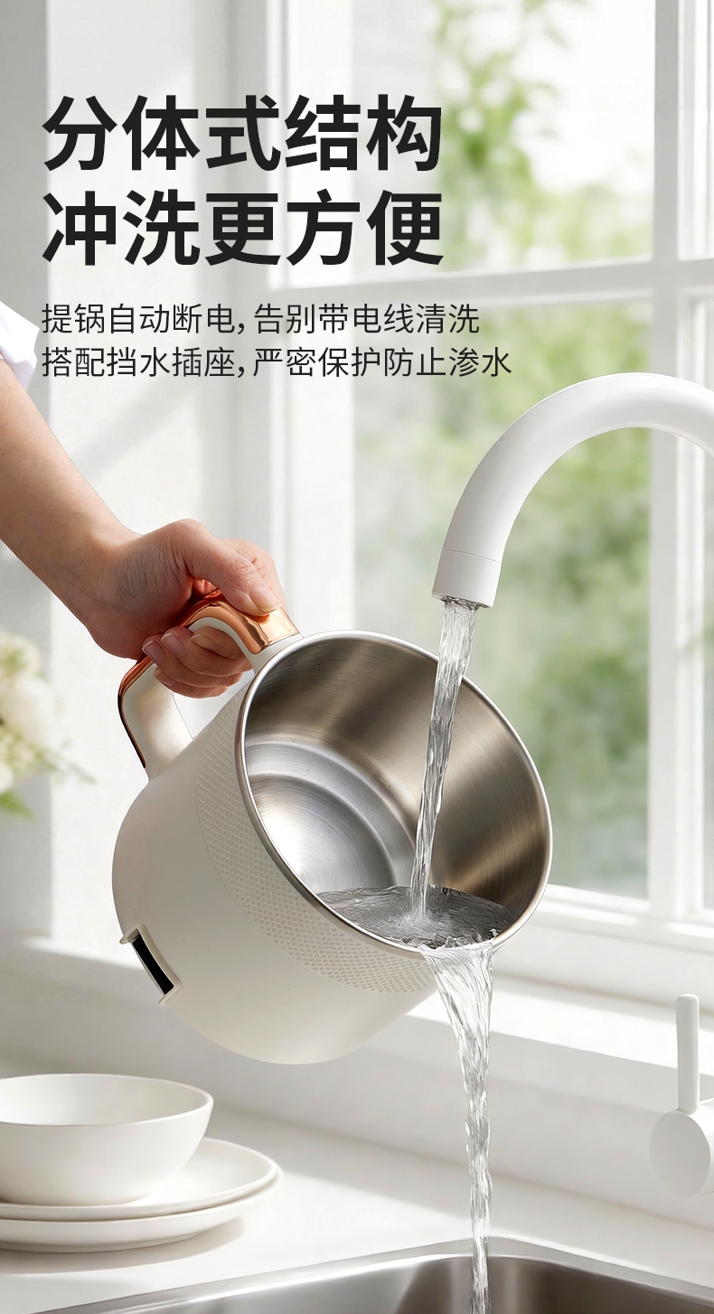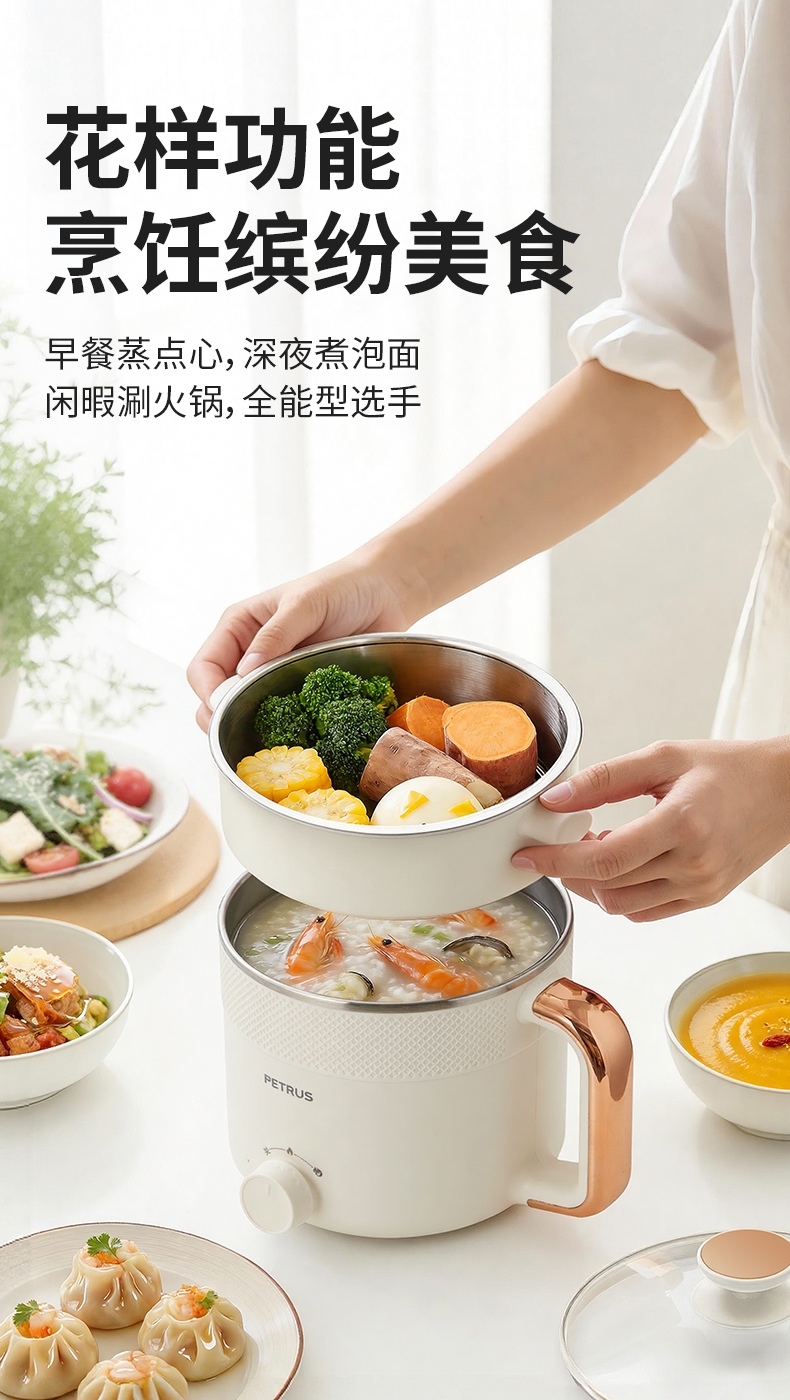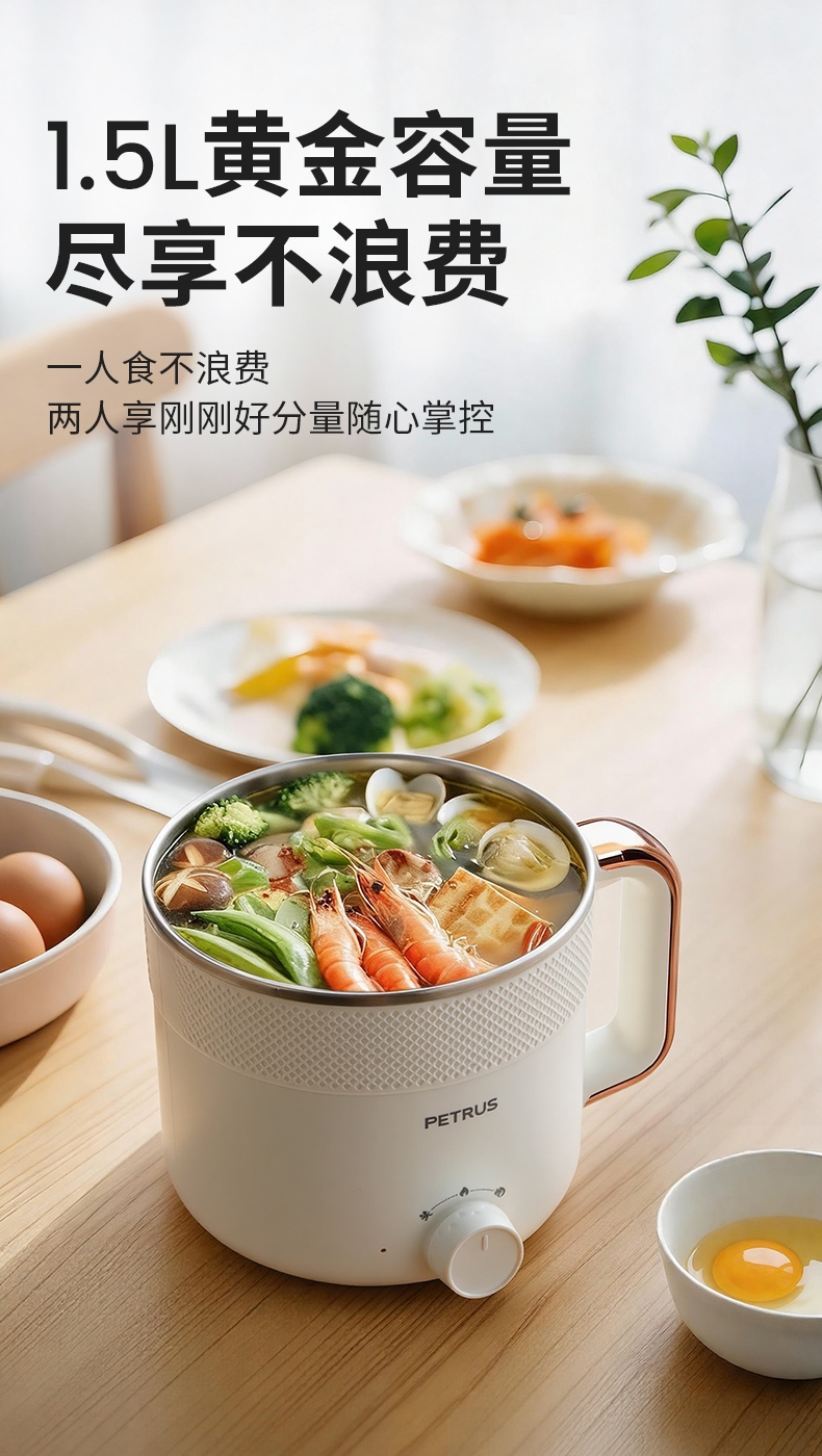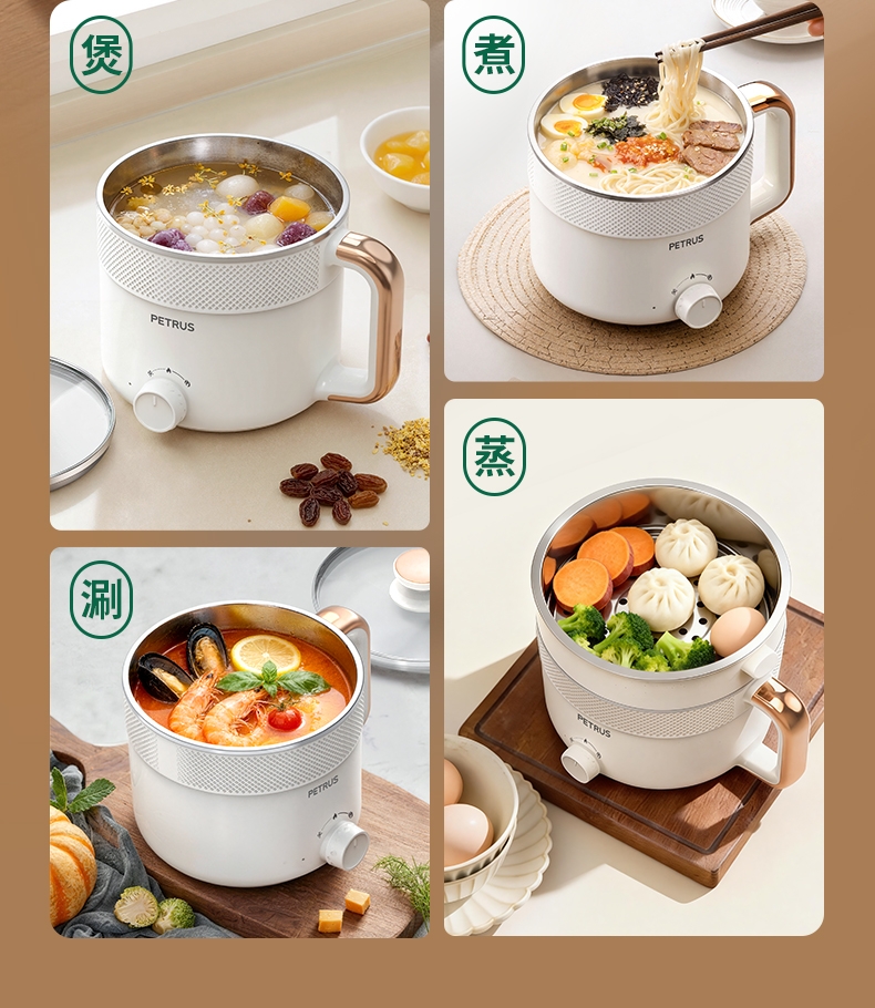1.5L黄金容量,自带蒸笼;全不锈钢食材接触,安全卫生;双重温控保护,自动断电,安全放心
