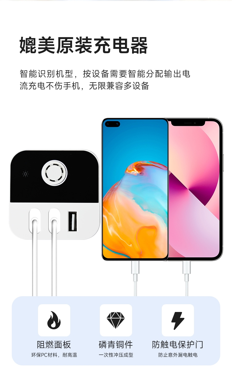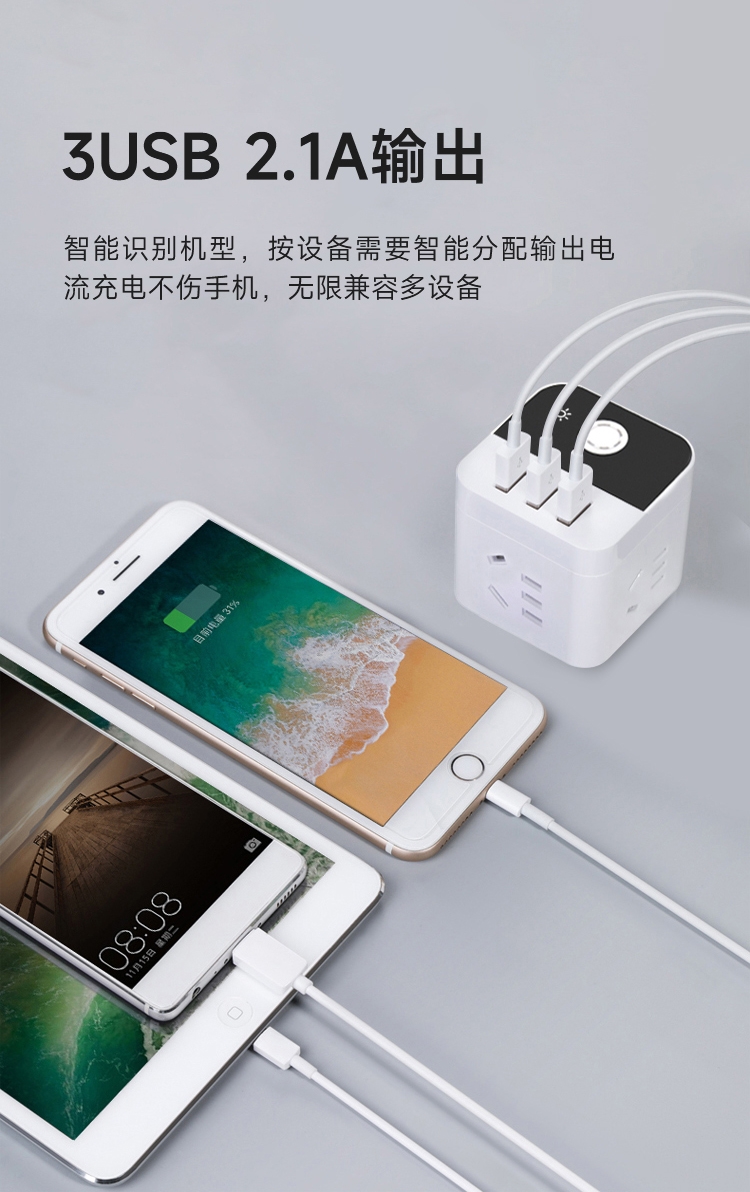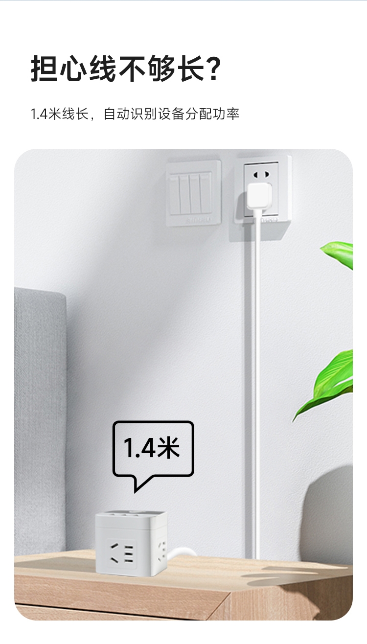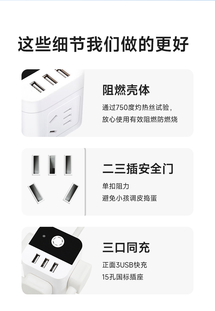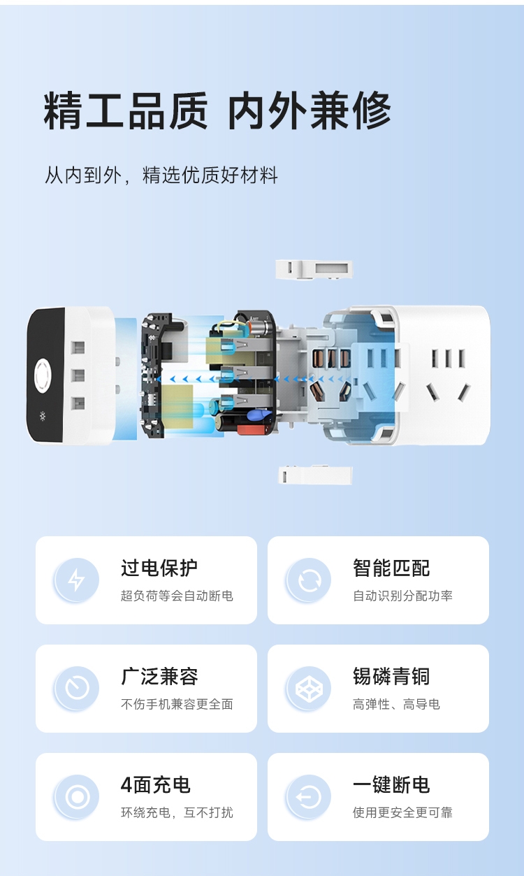 4面充电,正面3USB快充,15孔国标插座;主板芯片设置过电保护IC,超负荷等会自动断电保护;内芯使用锡磷青铜,具有高弹性,高导电