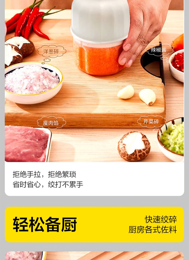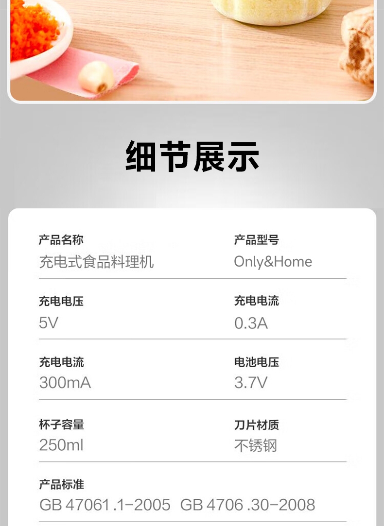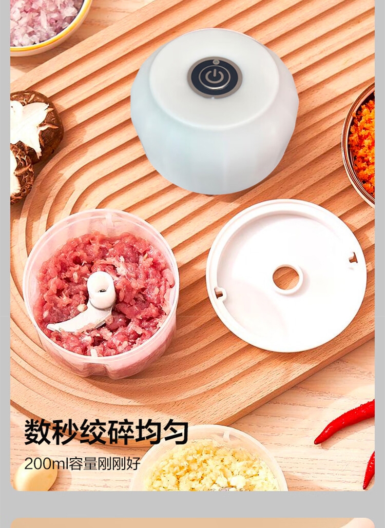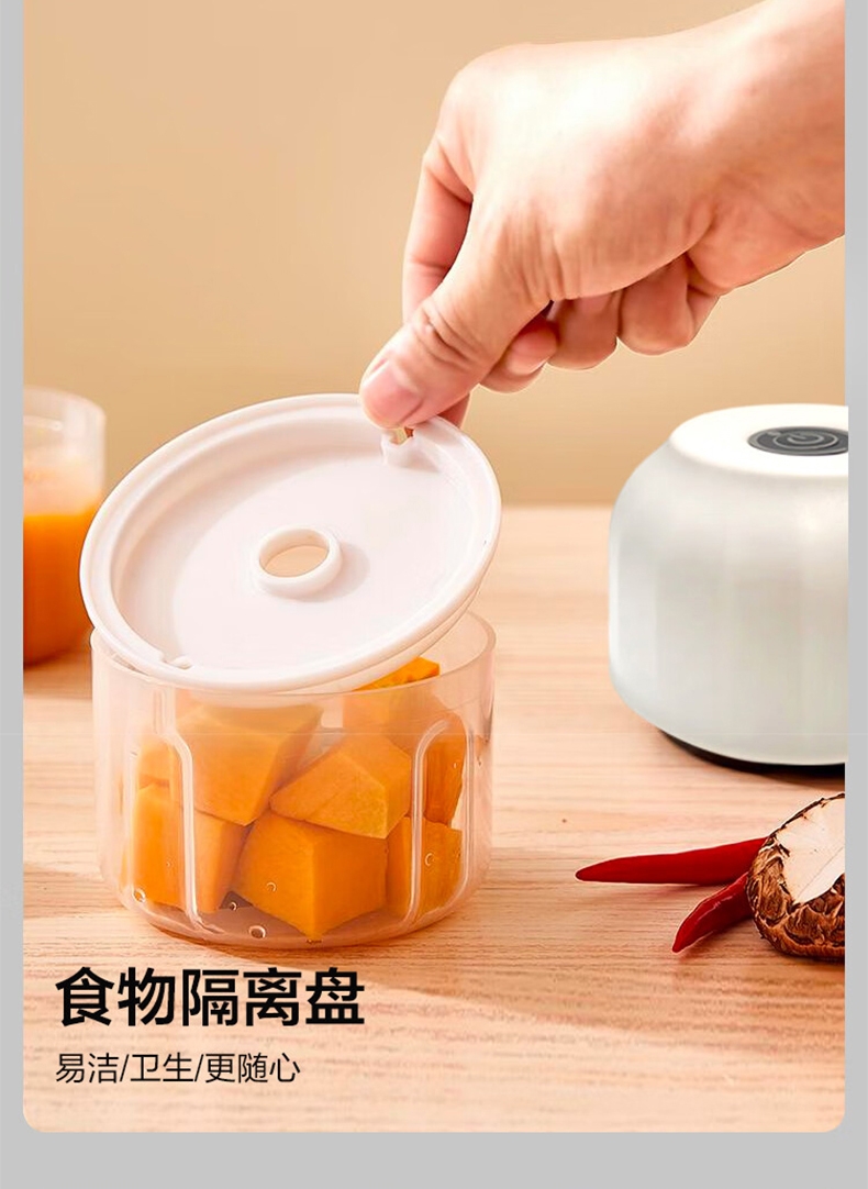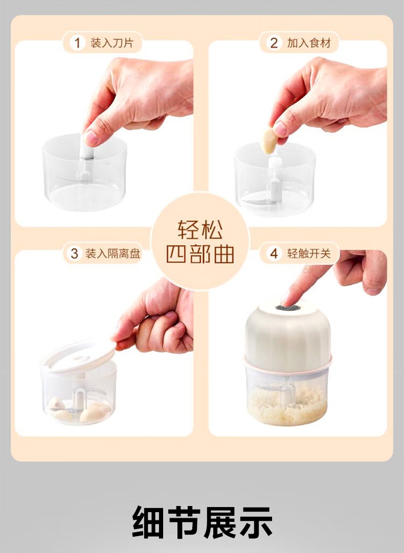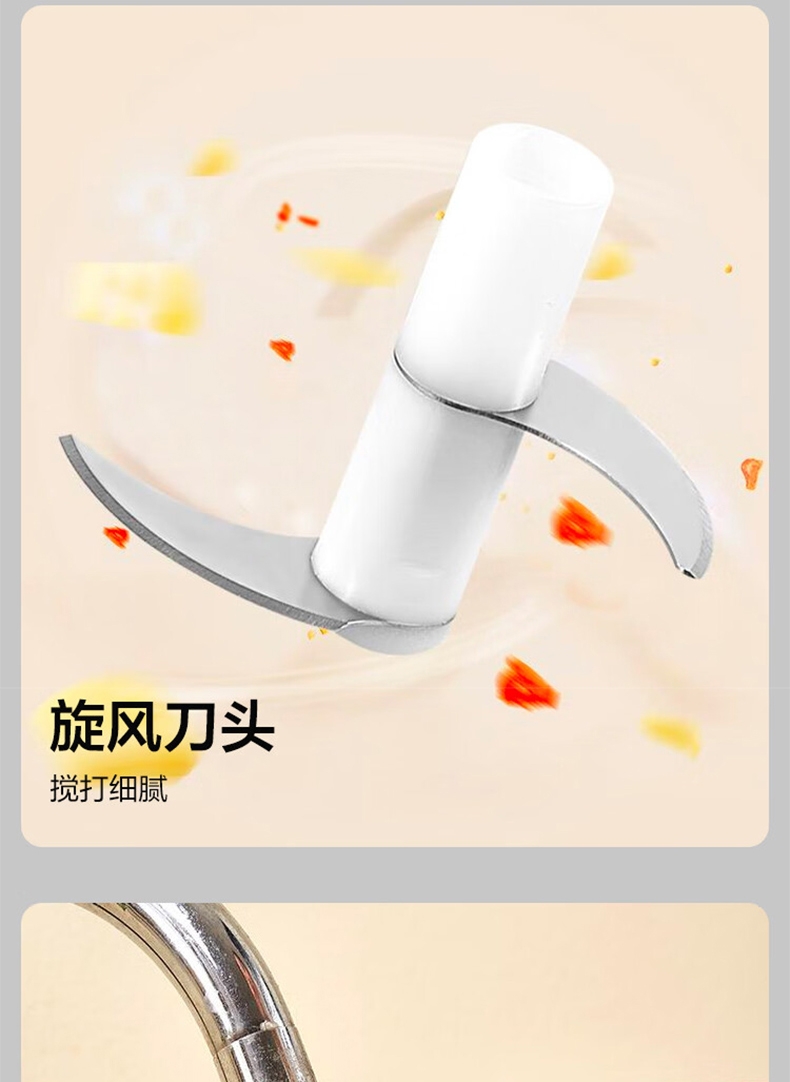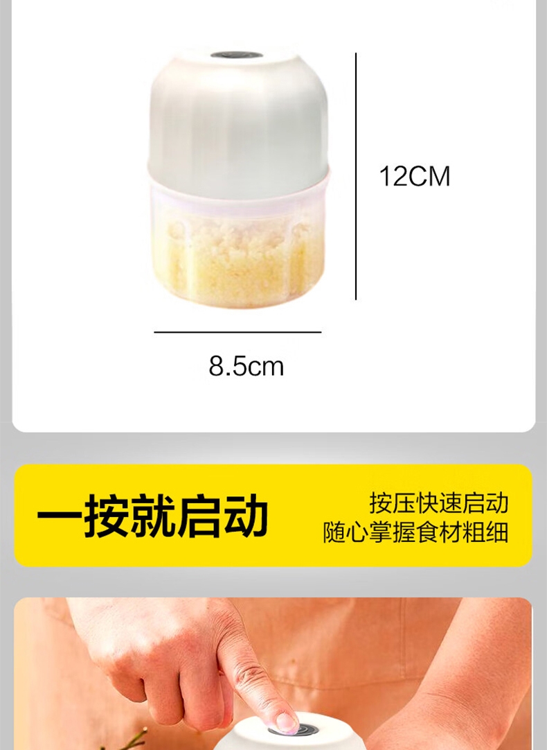 精美时尚设计,美观、大方、实用。;开关采用双击式开关,力度轻、接触好、开关灵敏;可作为厨房食材搅拌,辅食料理等,携带方便