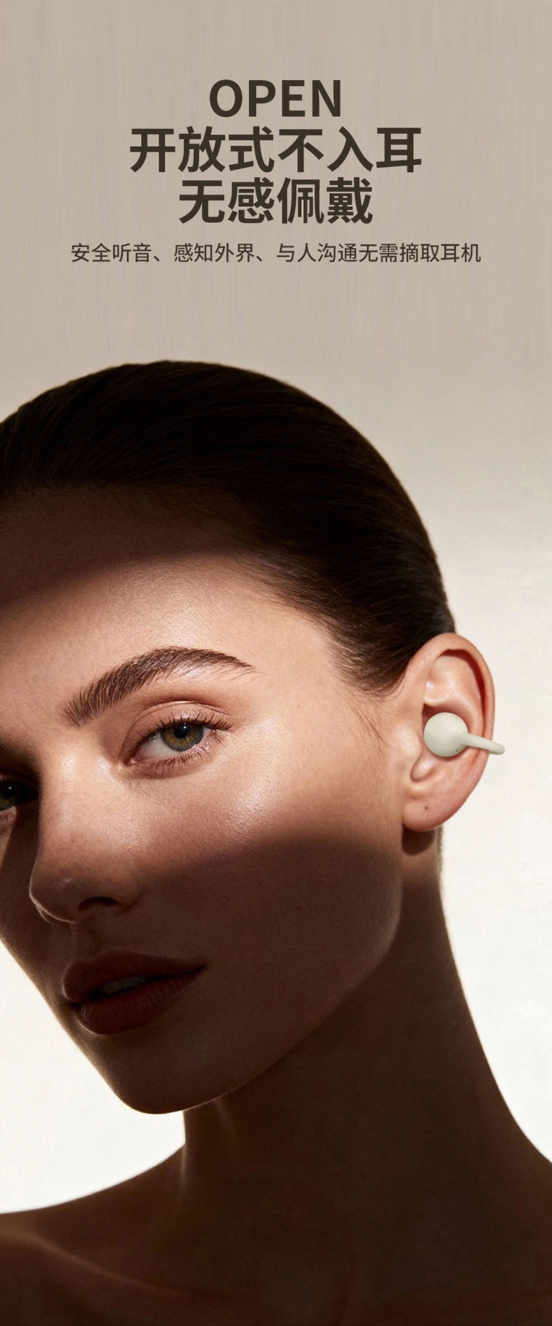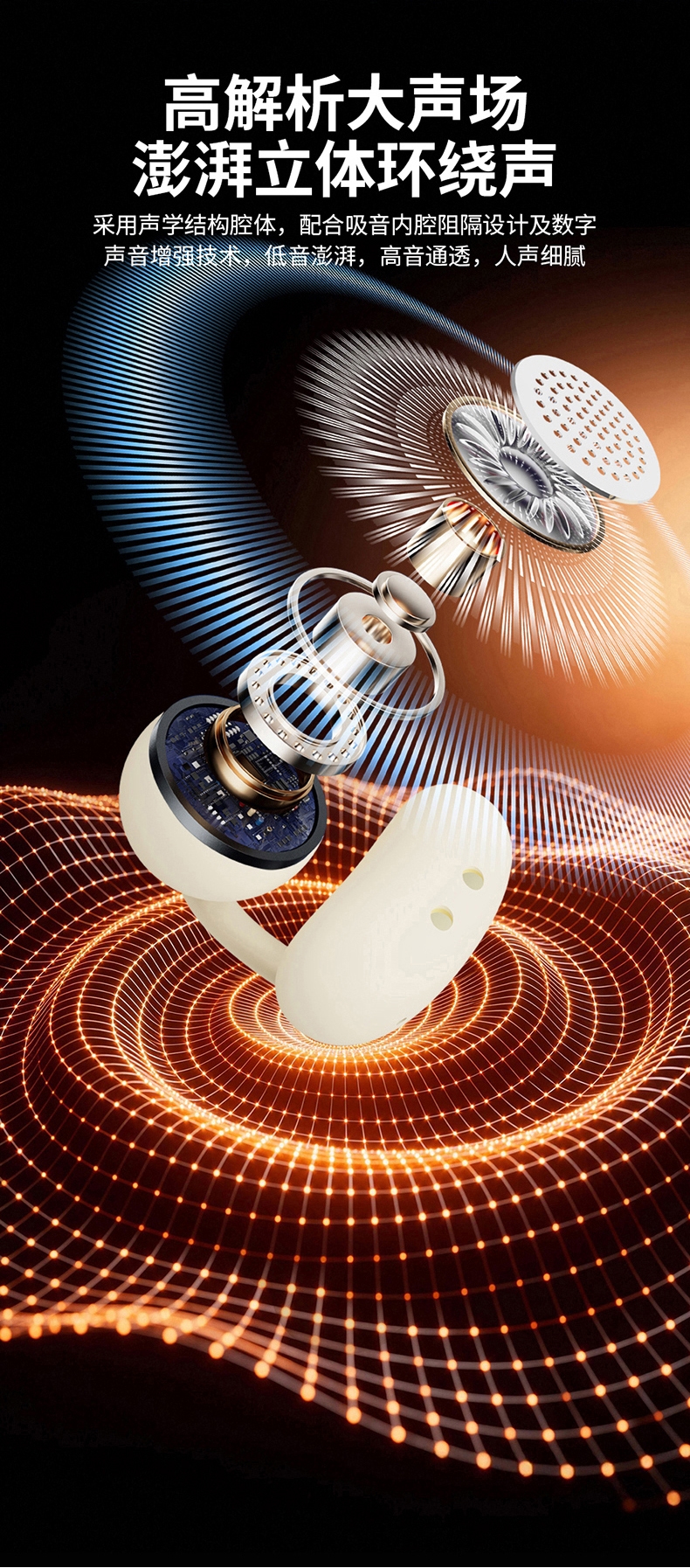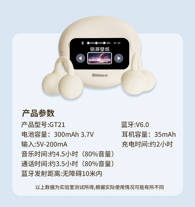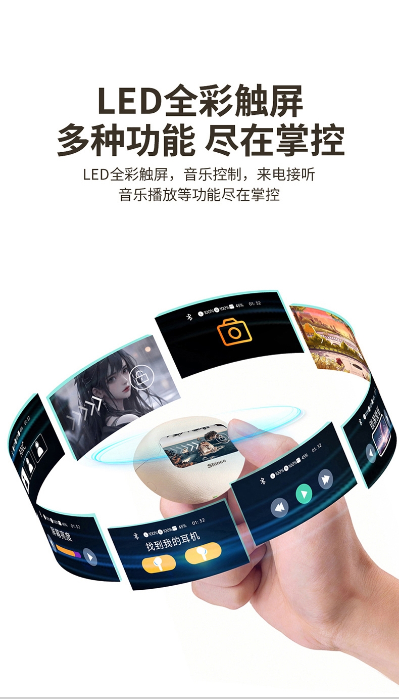 OPEN 开放式不入耳无感佩戴;高解析大声场澎湃立体环绕声;LED全彩触屏,音乐控制,来电接听音乐播放等功能;