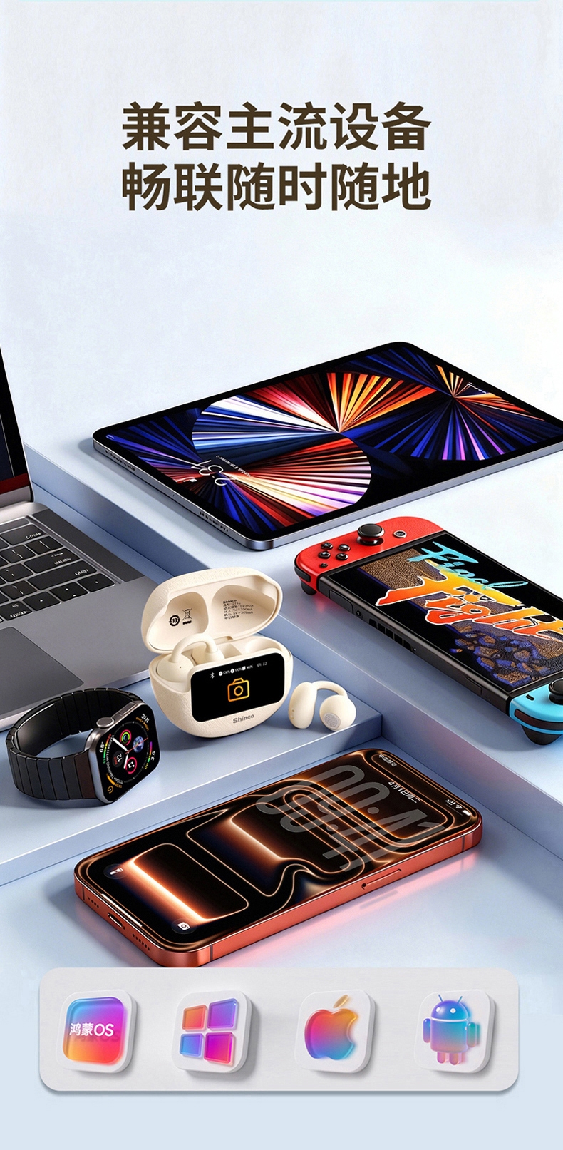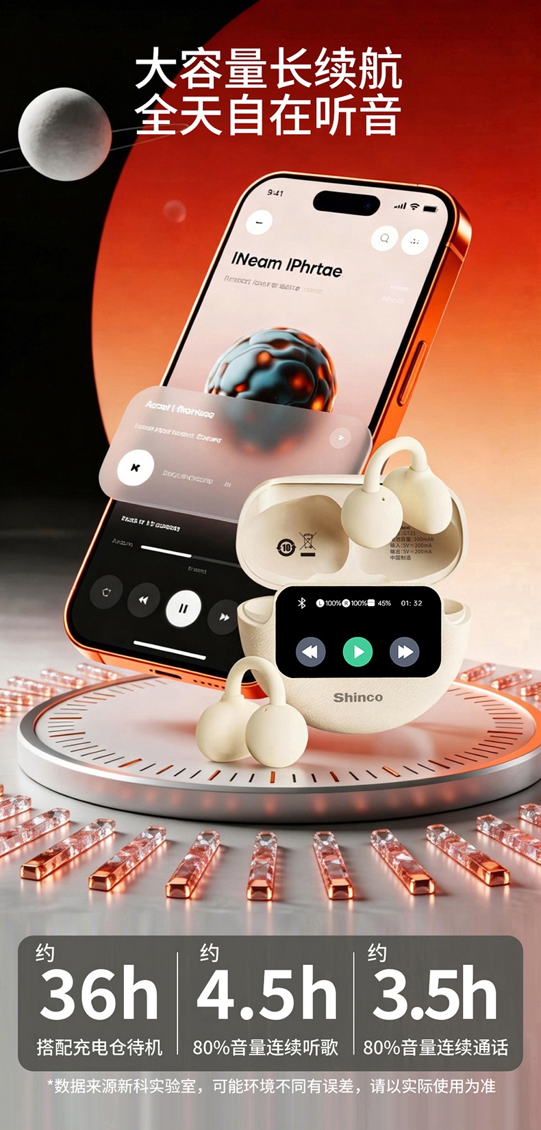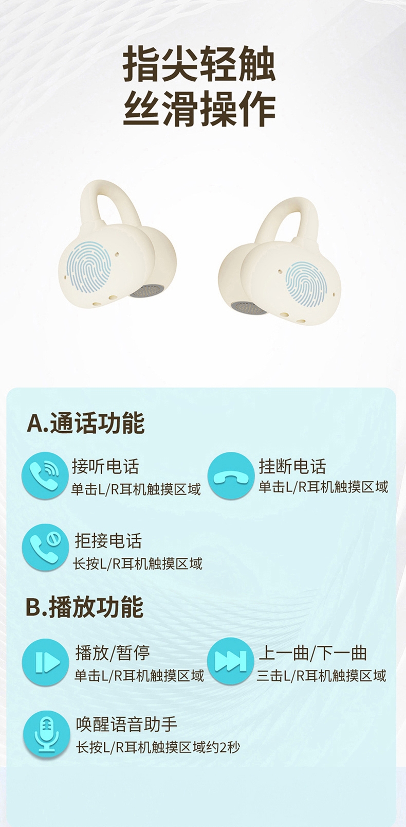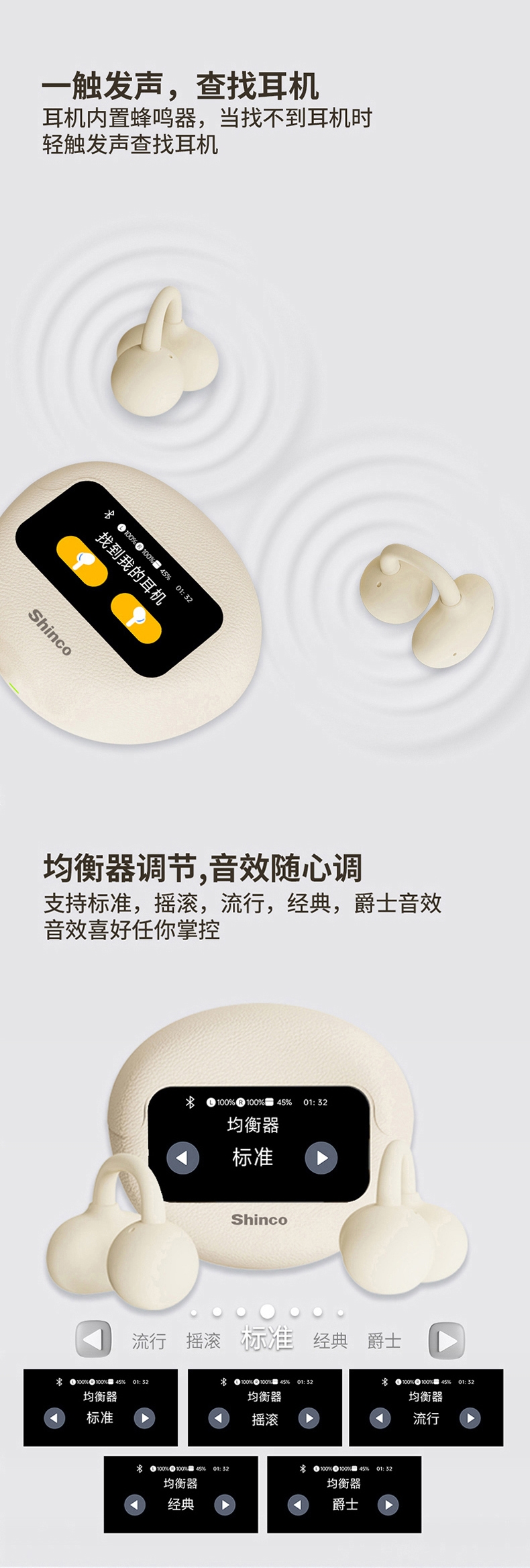 OPEN 开放式不入耳无感佩戴;高解析大声场澎湃立体环绕声;LED全彩触屏,音乐控制,来电接听音乐播放等功能;