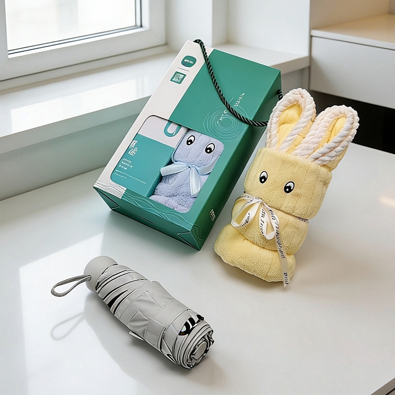 五折六骨晴雨伞 胶囊伞尺寸设计 黑胶隔热;欢喜小兔毛巾高平方克重结合精美包边与手工折叠小兔;礼盒套装 可手提