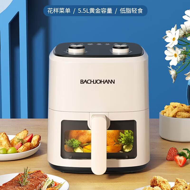 广角可视窗口,食材清晰可见;双旋钮独立控温/控时,使用灵活;5L大容量,耐用金属内腔
