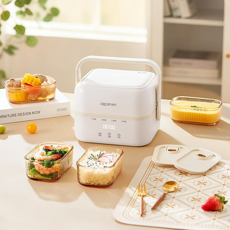 加入PPT高硼硅玻璃内胆饭盒,抗高温耐蒸煮易清洁;1.4L大容量,双层独立四胆,密封锁鲜防漏;加大水箱,一键现蒸,既是加热饭盒,也是小电蒸锅;可12h长时间预约,12h长效保温;便携提手会锁盖,轻松拎起出门,“移动饭搭子”;