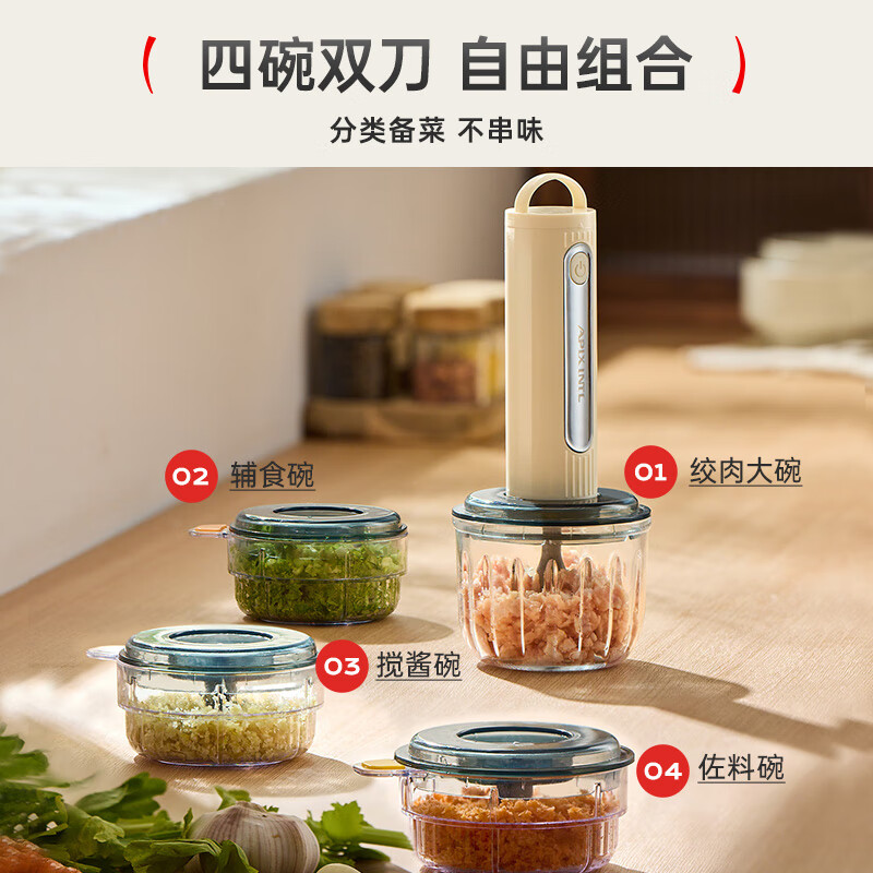 专碗专用,大碗绞肉馅,小碗绞佐料,荤素分类;无线操作,使用更方便;套娃设计,收纳不占地,小碗可直接当佐料碗使用