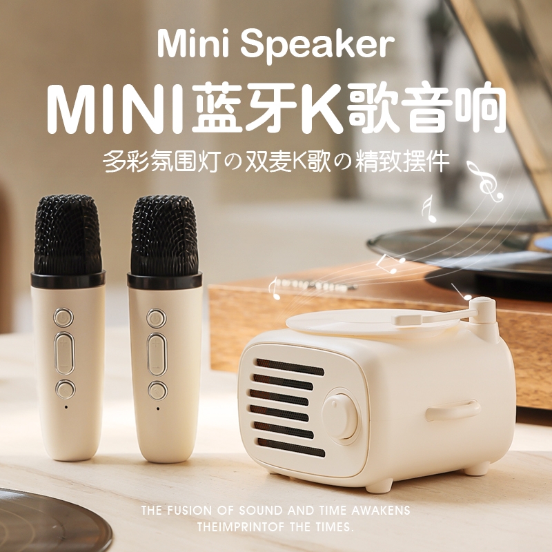 复古格调,气质呈现,致敬传统美学;旋转氛围夜灯,低亮/高亮/呼吸灯三种模式;高配Mini麦克风,双麦联唱,双倍快乐