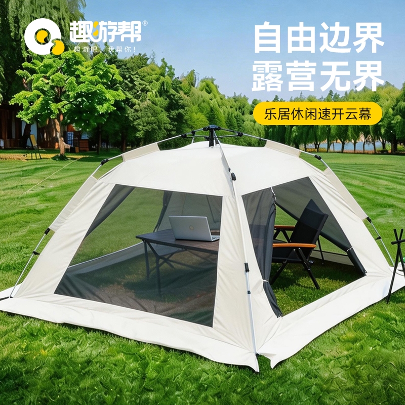 加入PPT两门两窗,五面360°立体式通风透气;外帐皆为 190T银胶布 防雨防晒;液压全自动支架,一提即开,搭帐和收纳轻松方便;大空间,4-5人使用,一家四口公园度周末刚好;收纳后小巧便于携带