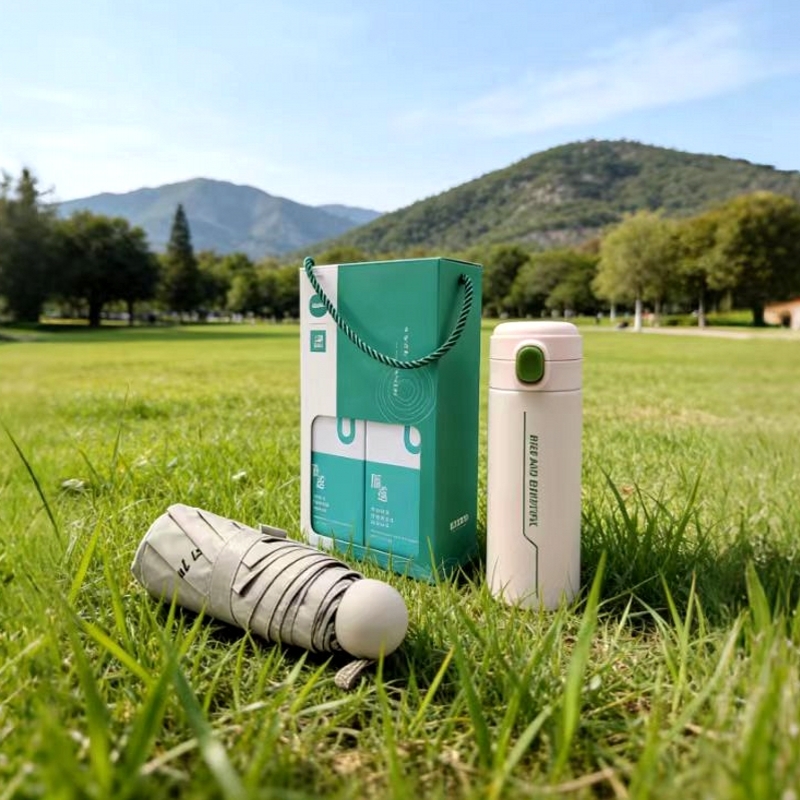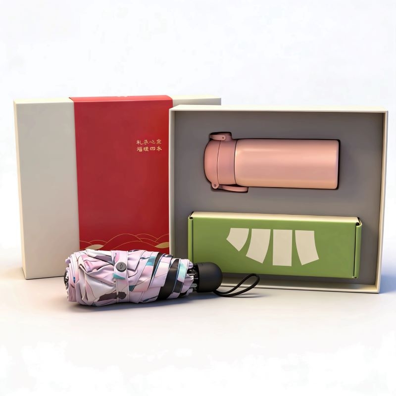 420毫升高颜值保温杯 304内胆 精美设计文案;大号晴雨伞主题设计融入 五折八骨大伞 外观靓丽;微米国风毛巾 精制包边 厚实面料 结合国风刺绣