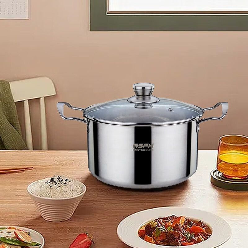 精选奥氏体304高品质不锈钢,三层加厚复合锅底,导;锅内部镜面亮光双工艺,无化学涂层,造型高雅,健康卫;全透明钢化宽边玻璃锅盖,耐热防裂,烹饪过程清晰可见