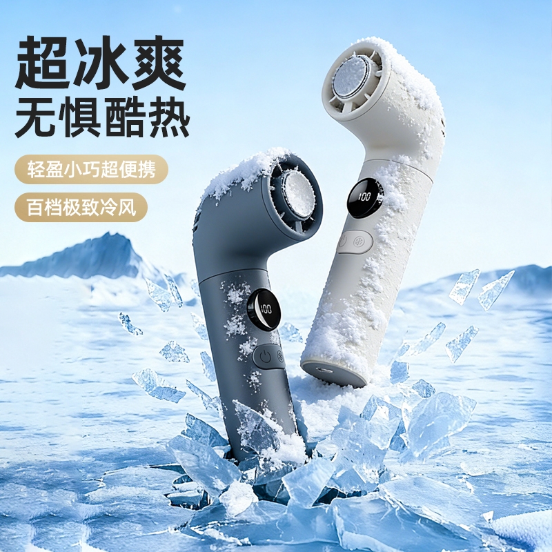 可手持、桌面、挂脖使用,可折叠;半导体冰敷制冷,快速降温;大容量电池,使用更持久;100档无极调节风速,风力大小随心调节