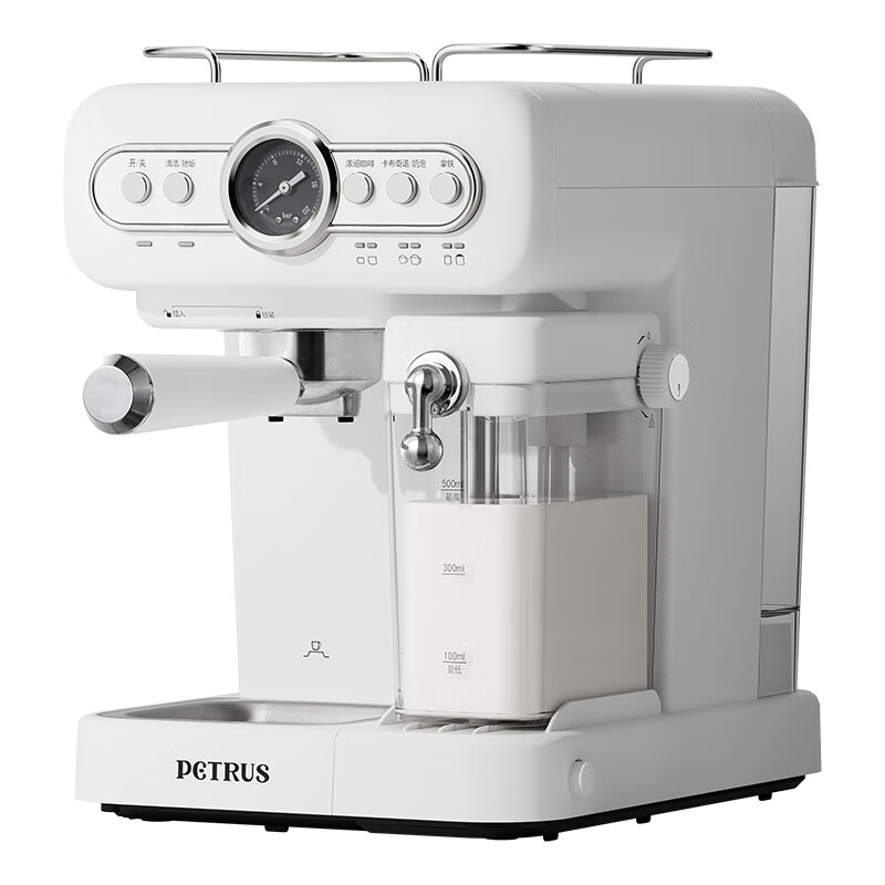 双发热体,双加热系统,一键全自动;20Bar稳定泵浦压力,蒸汽瞬间穿透咖啡粉;高温萃取和自动打奶泡功能二合一,花式DIY