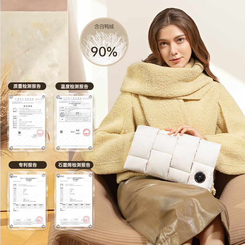 极速升温,双面发热,含绒量90%;六档调温,智能数显温度,边冲边用不断电;暖手/腰/腹/背多场景使用,可手洗清洁