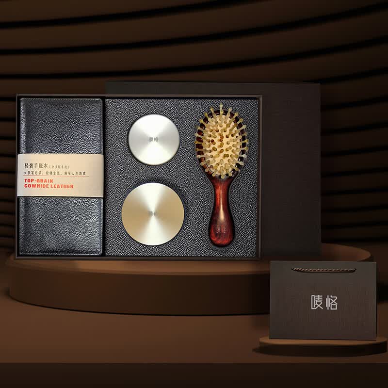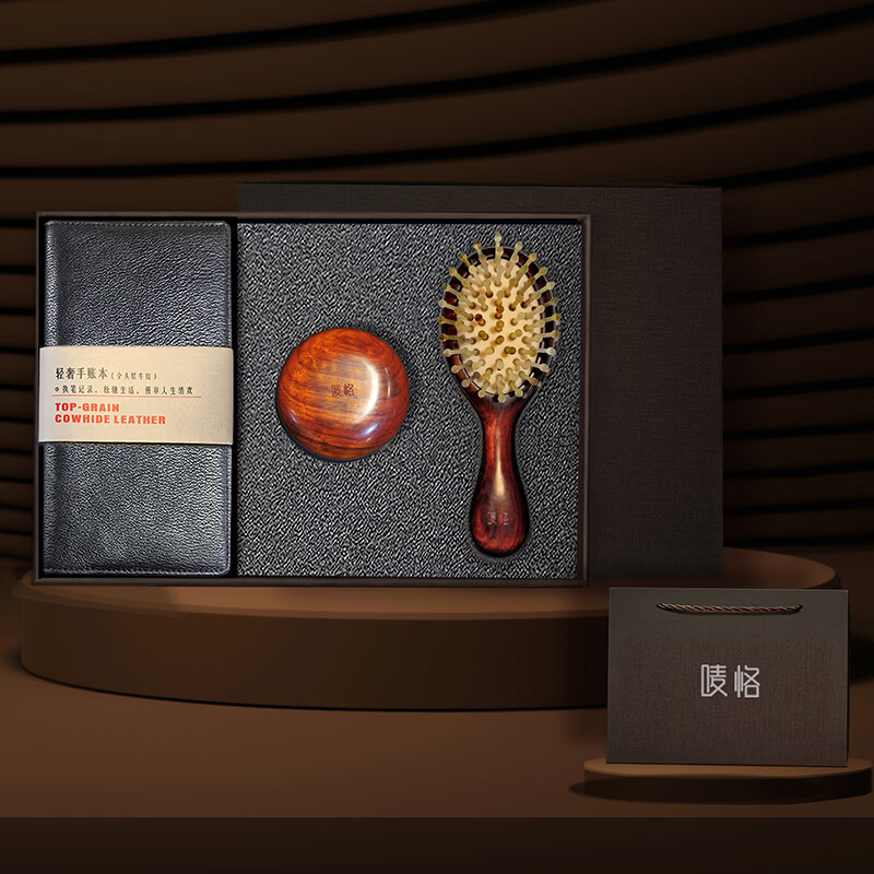 手帐本采用头层植鞣牛皮手感好配本芯;按摩梳采用12根精羊角齿和高油檀木,无漆健康亲肤;气垫梳采用羊角齿和高油檀木,无漆健康亲肤