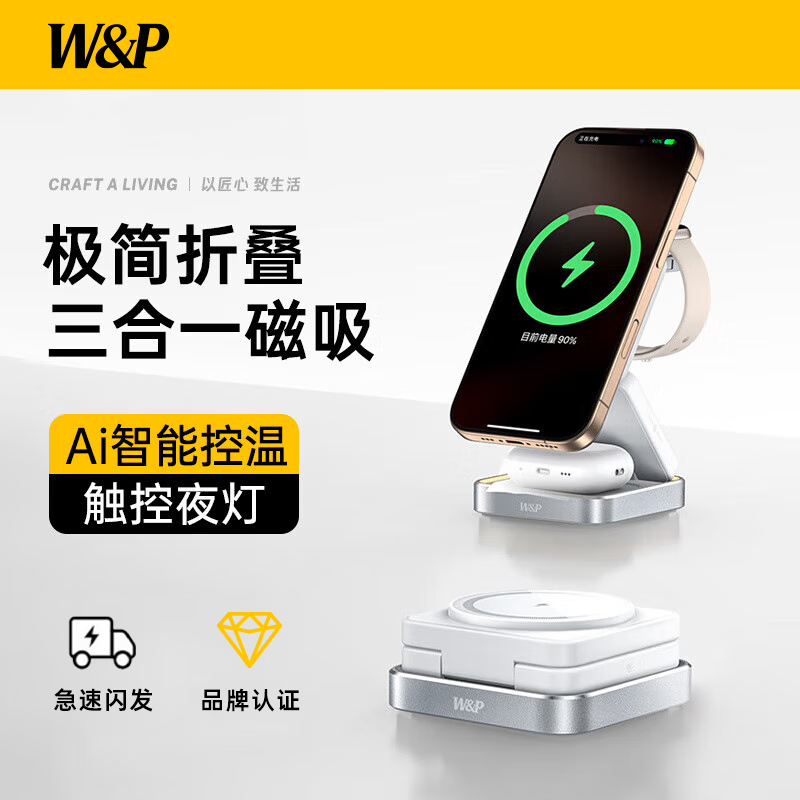 AI智能分流供电多向快充,互不干扰;折叠/展开,充电更多精彩。;三合一全系超充比Magesafe再快20%