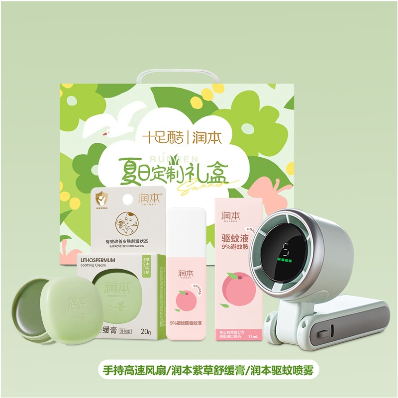 产品风量五档可调,风力强劲,携带方便;润本避蚊胺驱蚊液:75ml,9%避蚊胺;儿紫草修护膏: 薄荷型20g,紫草根提取物