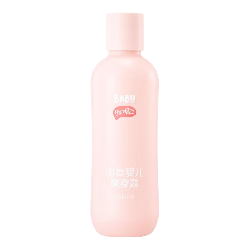 舒爽止挠,天然温和;特添双桃精粹,平衡呵护肌肤屏障;提升幼肌防御力;有效舒缓,持久爽身