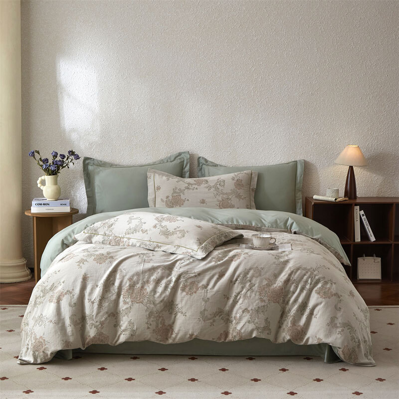 面料采用生态亲肤棉,新型环保浆料活性印染,不褪色;其生态环保理念在很大程度上满足了消费者对床品舒适度;色彩丰富自然,阵线细致密实,错落有序,更显档次。
