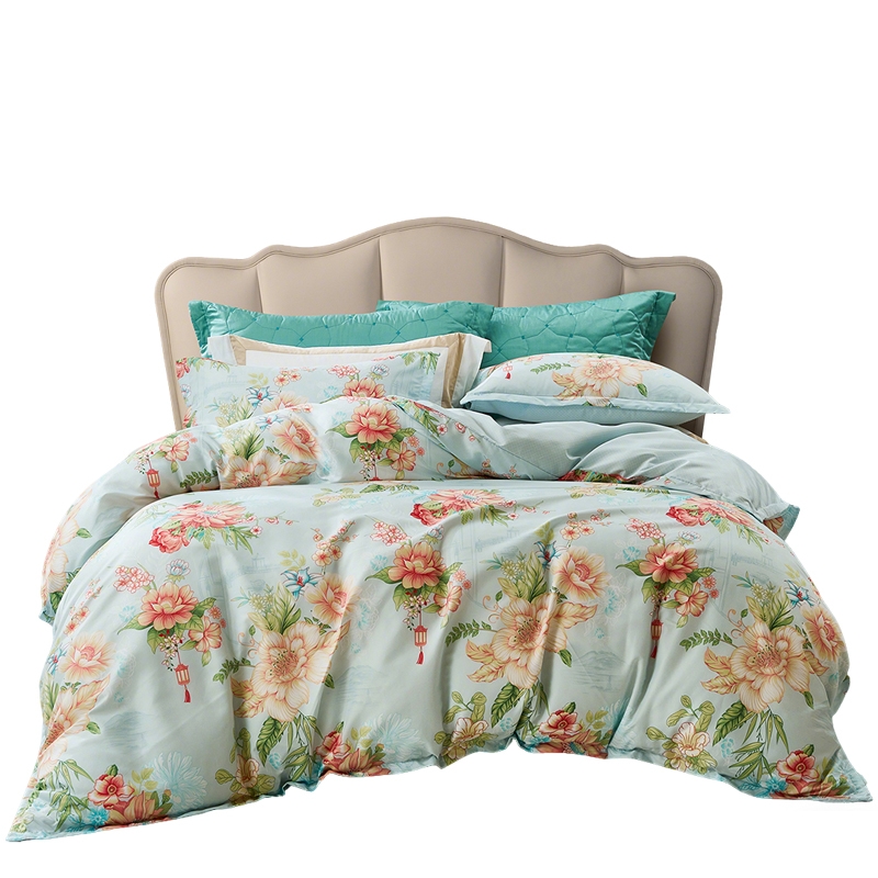 面料经过两次打磨处理,在表面会形成一种细密短绒毛;原创印花,鲜活印染,花型更立体,久用不褪色,好品质;历经多道印染工艺,面料颜色丰富,花型层次感佳